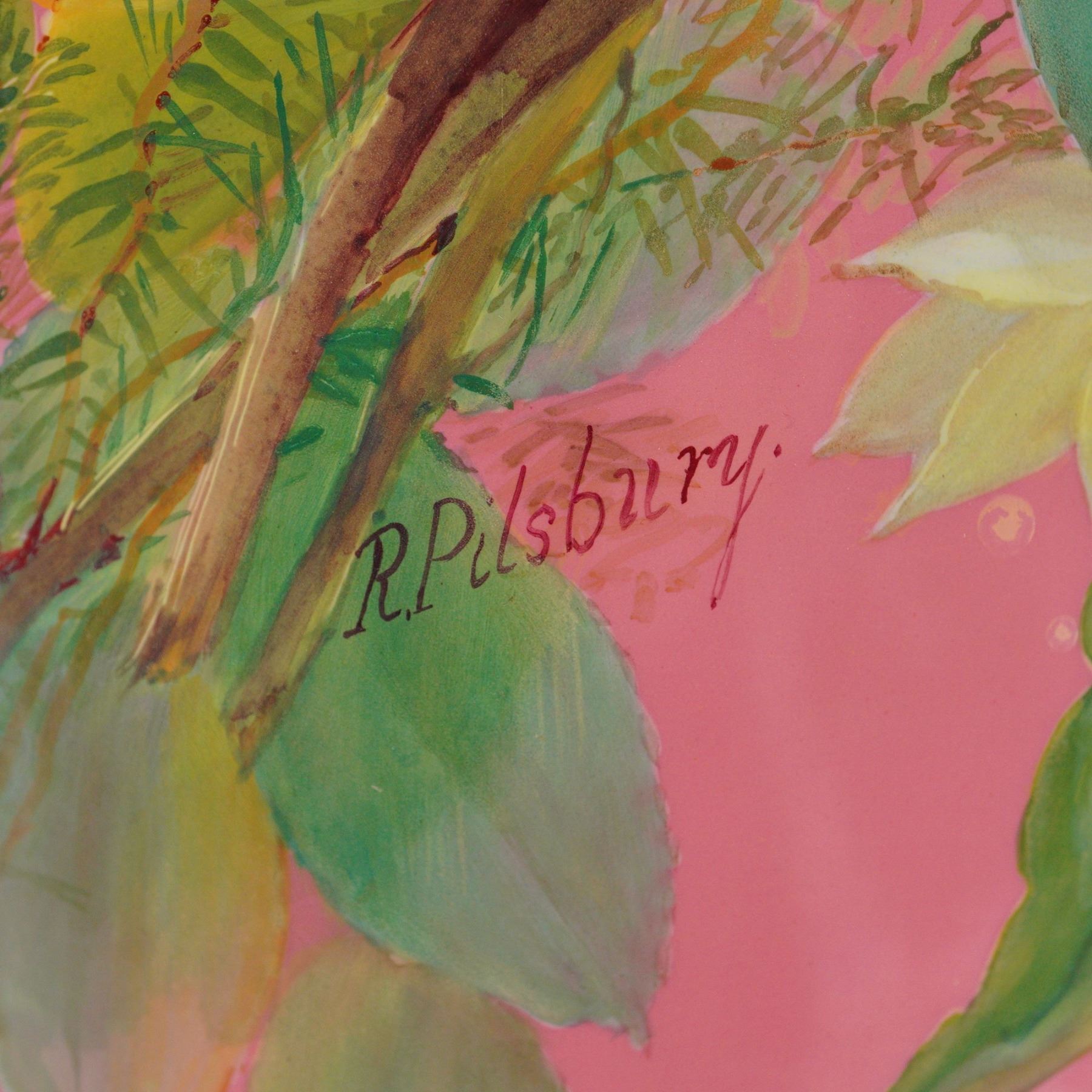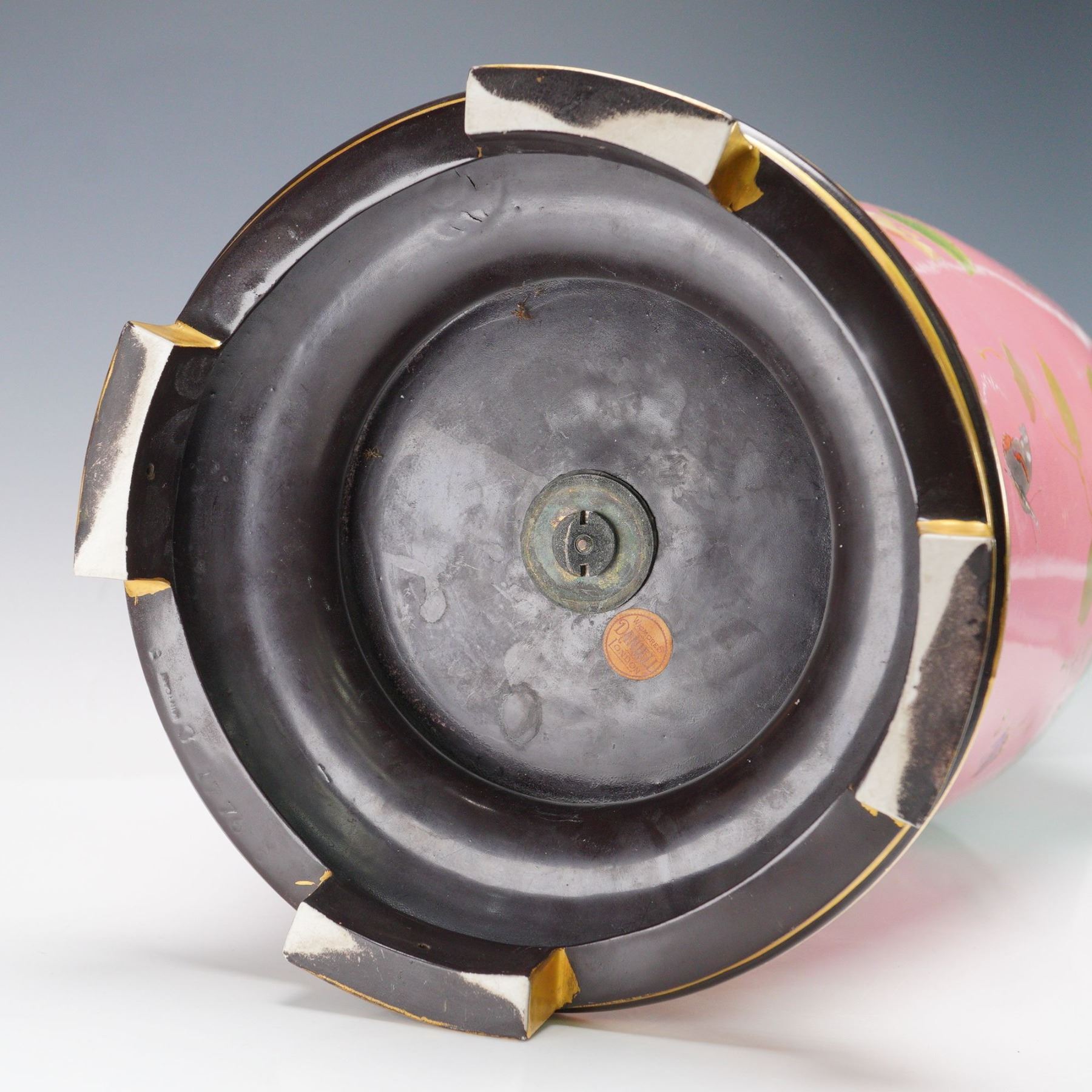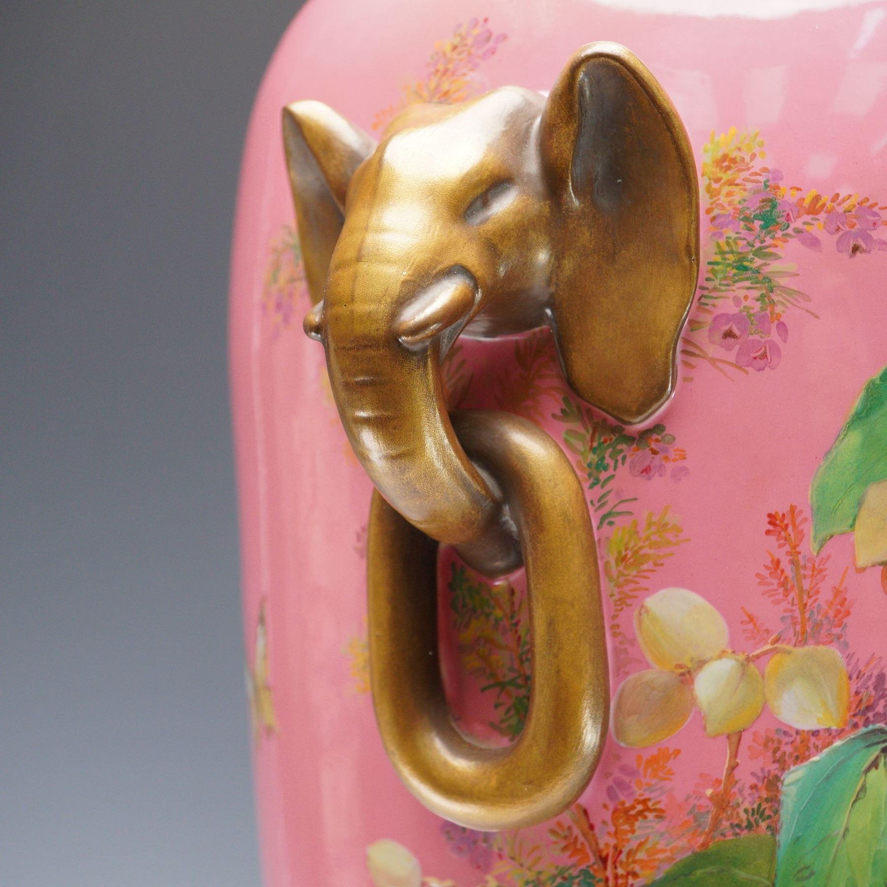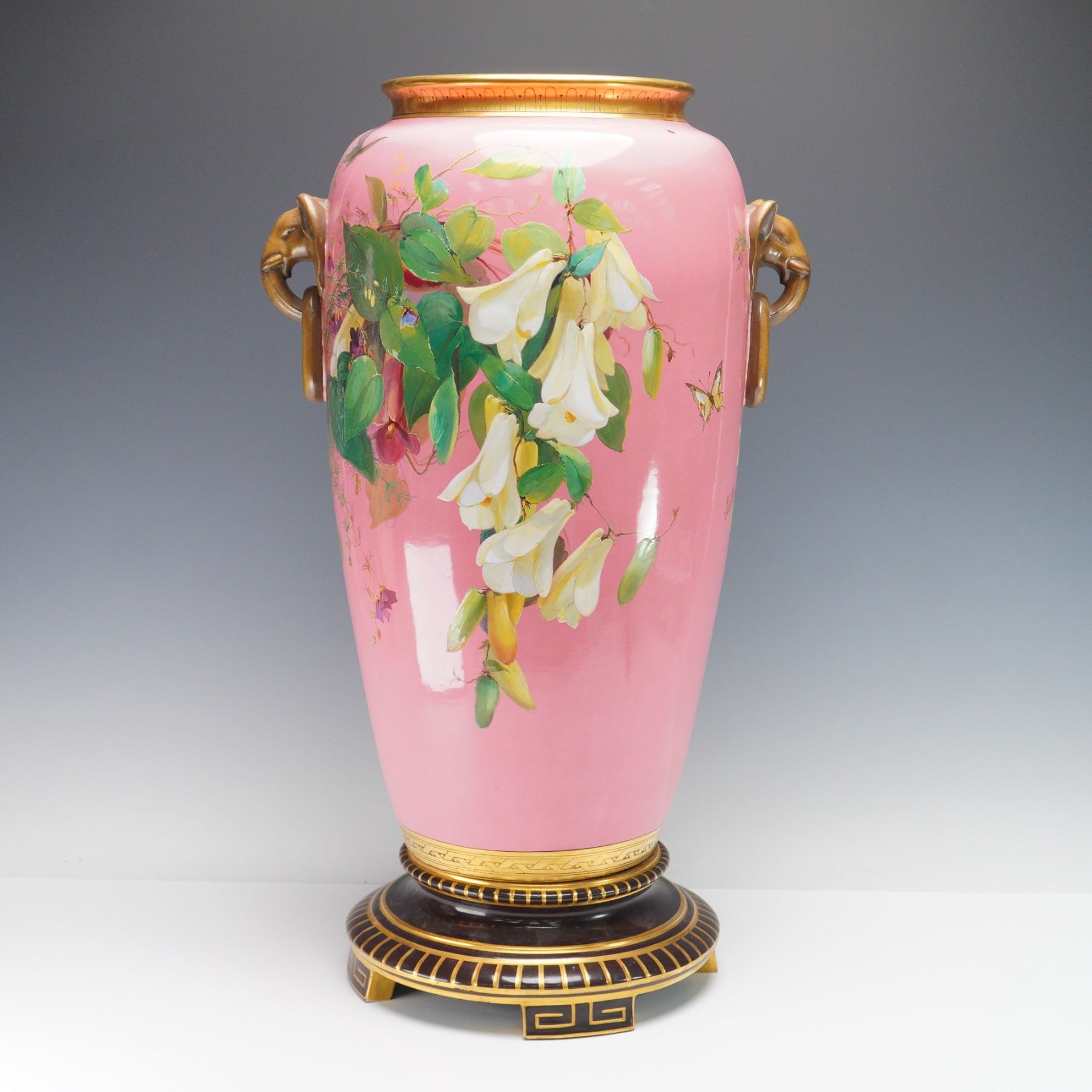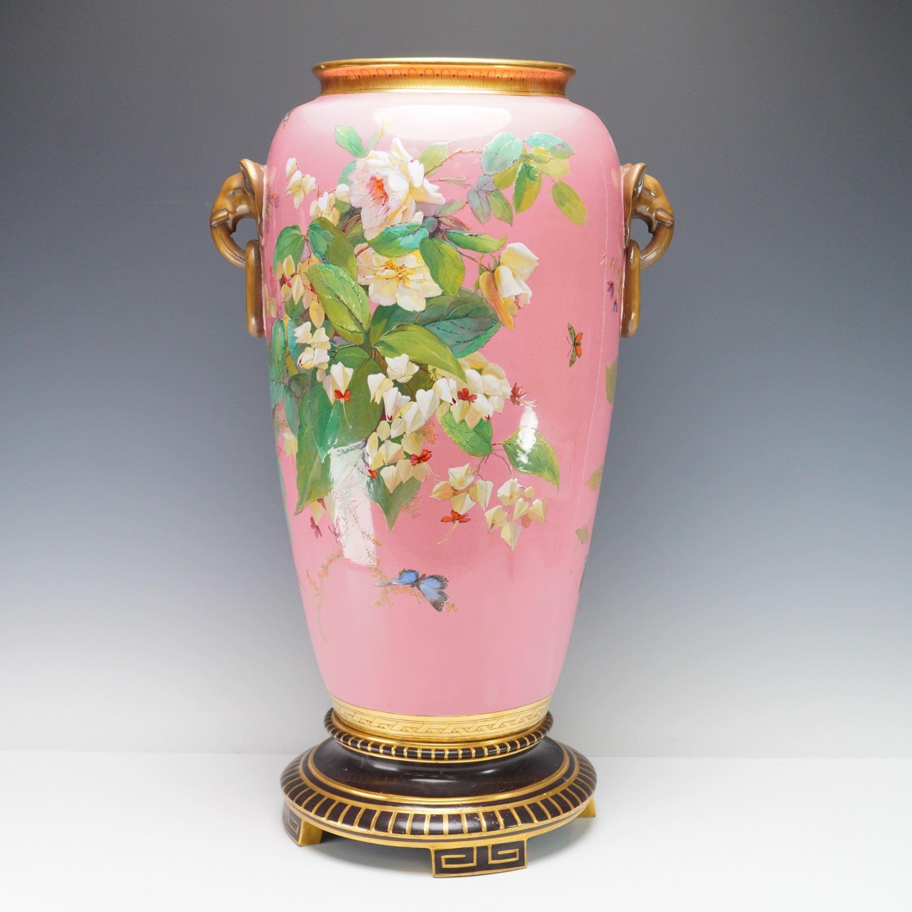 Striking, large porcelain vessel richly painted on both sides with flowers and butterflies against a pink ground. This piece is further embellished with gilt elephant head handles and a black and gilt decorated foot. Retailed by A. B. Daniell & Sons of Wigmore St. London. Signed "R. Pilsbury" to side. stamped Mintons 1776. Daniell Wigmores paper label to the base.