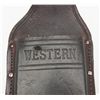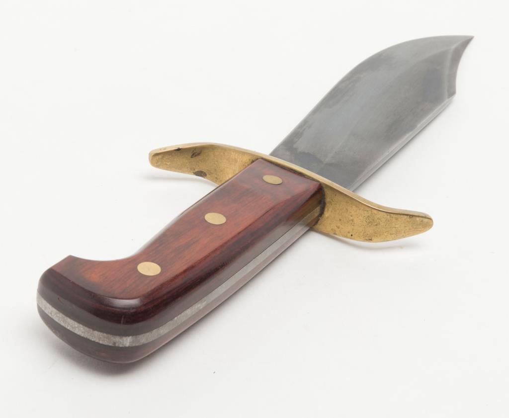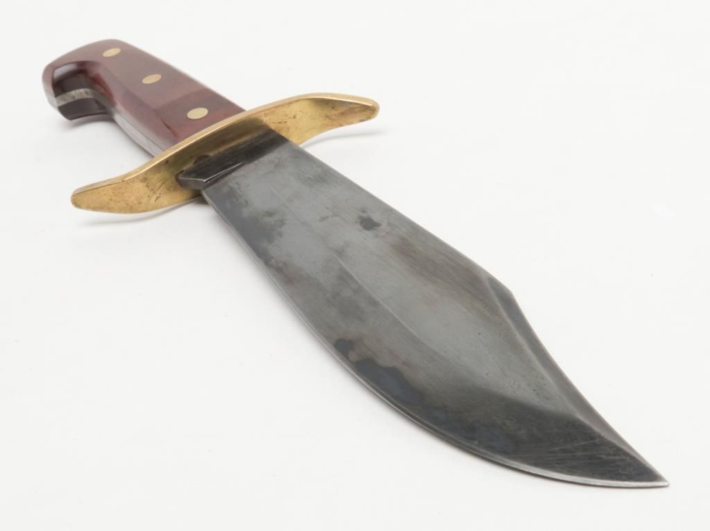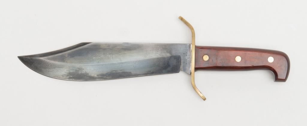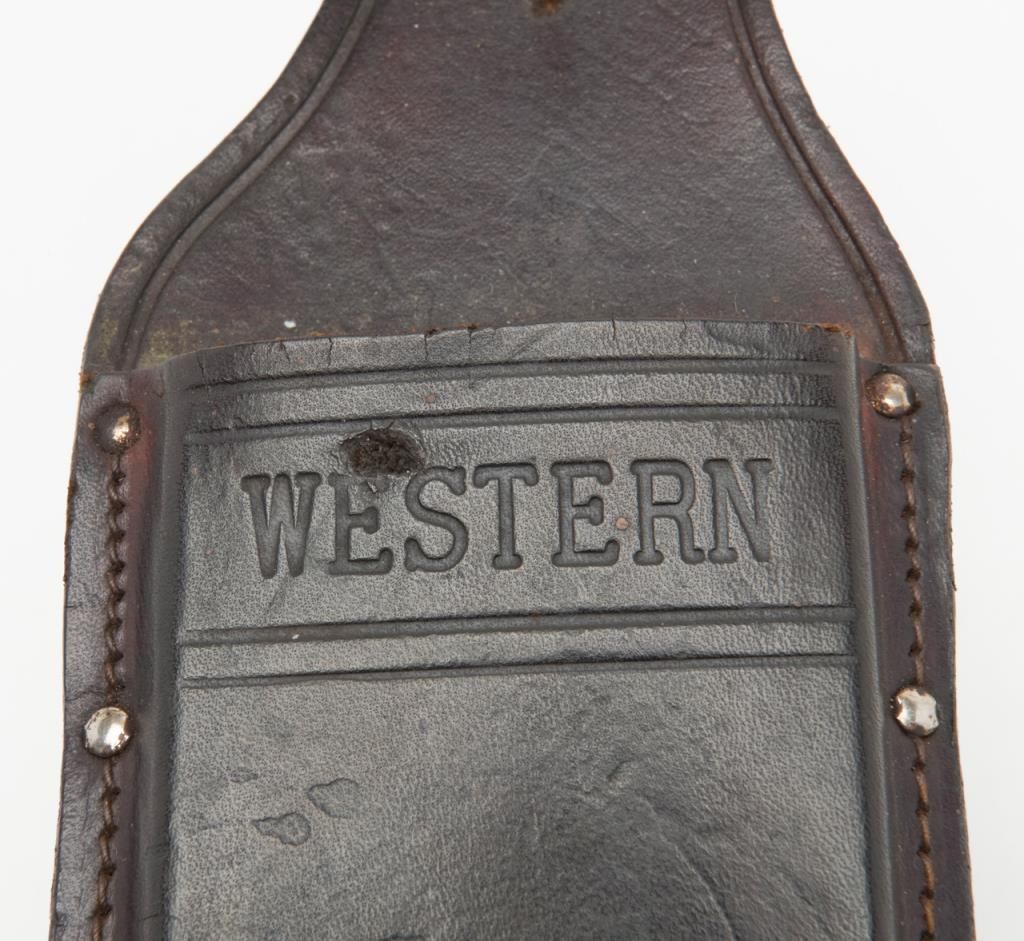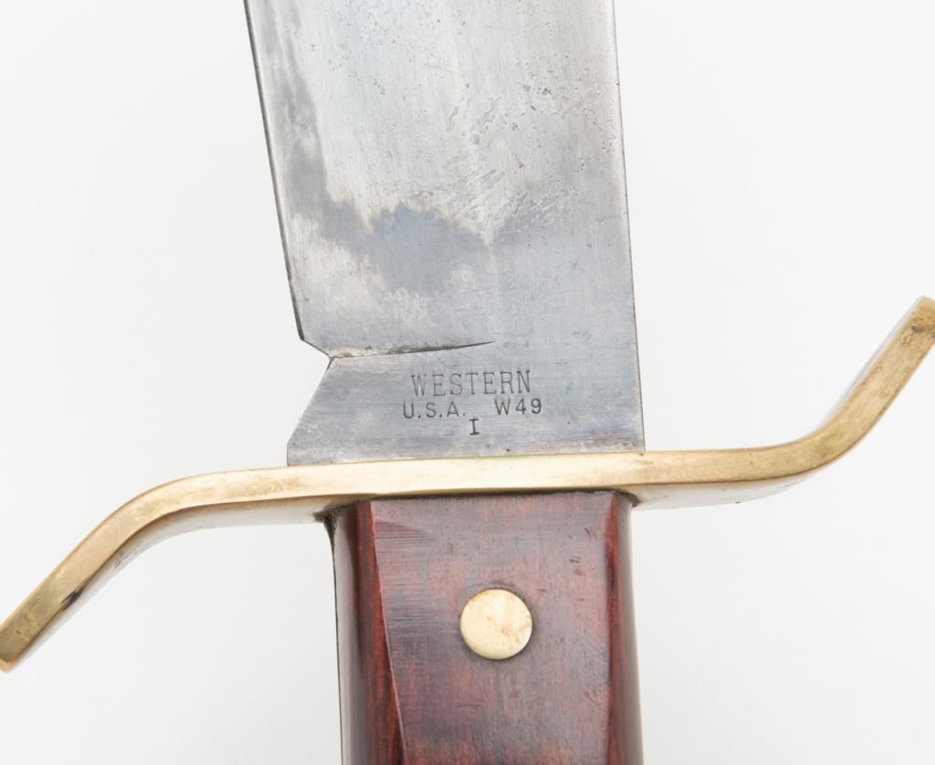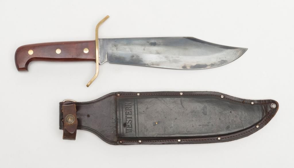 Large Modern Bowie knife by Western, Model W49 in overall fine condition with leather sheath, approx. 14-1/2” overall with a 9-1/2” blade that has been professionally sharpened (CAUTION: THIS BLADE IS VERY SHARP: HANDLE WITH EXTREME CARE).Est.: $50-$150.