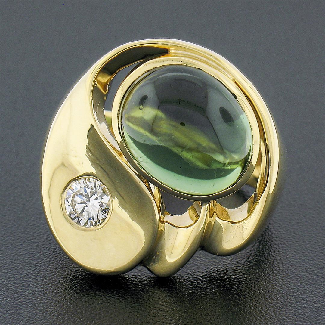 A solid 18k yelow gold geometric ring, with 1 oval cabochon cut natural tourmaline (12.4x10.3mm - 9.0ct), and 1 round brilliant cut natural diamond ( G - VS2 ; 0.31ct). The ring is size 8.0, weighs a total of 17.57 grams, and measures 22.25mm wide.