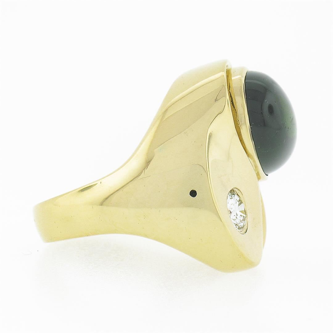 A solid 18k yelow gold geometric ring, with 1 oval cabochon cut natural tourmaline (12.4x10.3mm - 9.0ct), and 1 round brilliant cut natural diamond ( G - VS2 ; 0.31ct). The ring is size 8.0, weighs a total of 17.57 grams, and measures 22.25mm wide.