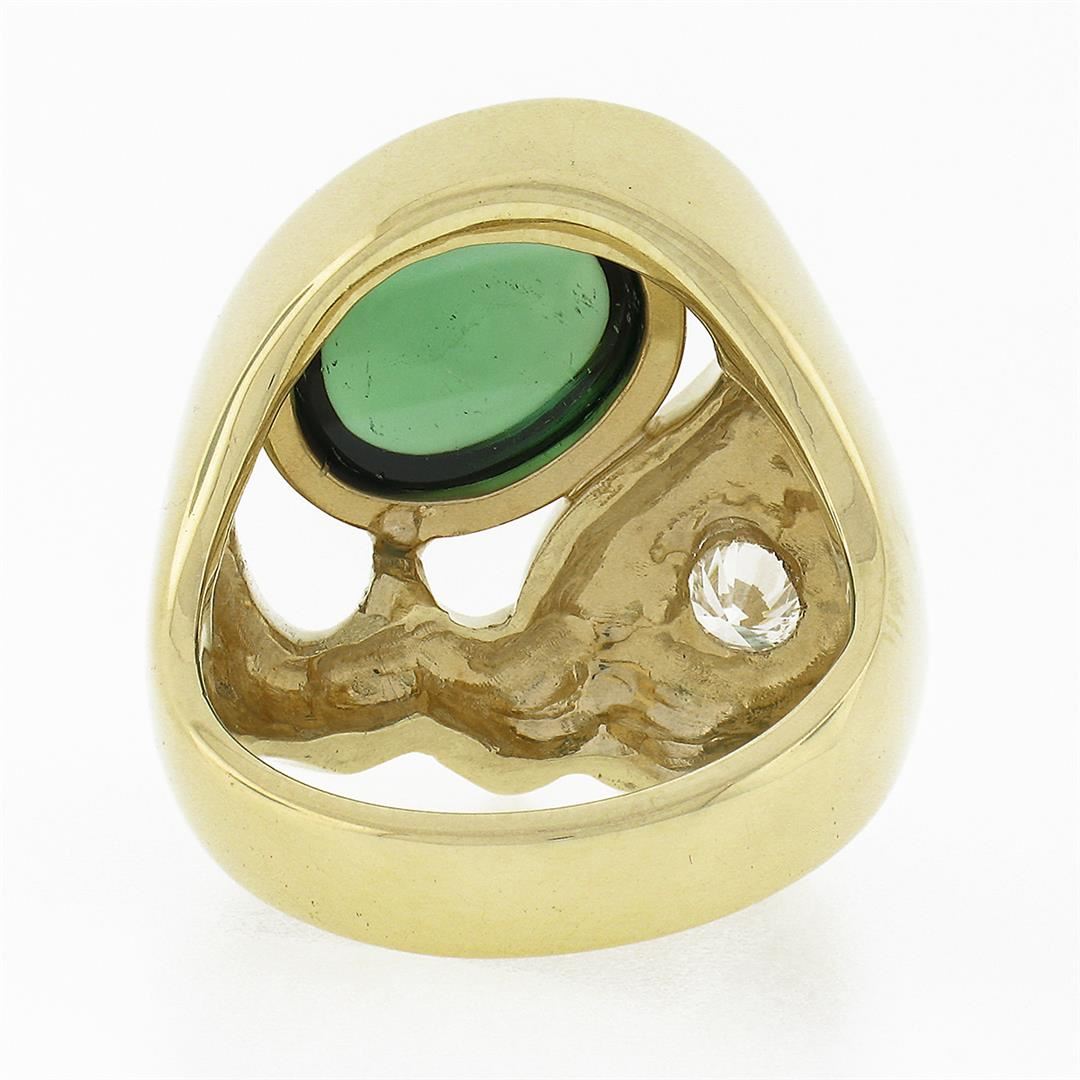 A solid 18k yelow gold geometric ring, with 1 oval cabochon cut natural tourmaline (12.4x10.3mm - 9.0ct), and 1 round brilliant cut natural diamond ( G - VS2 ; 0.31ct). The ring is size 8.0, weighs a total of 17.57 grams, and measures 22.25mm wide.