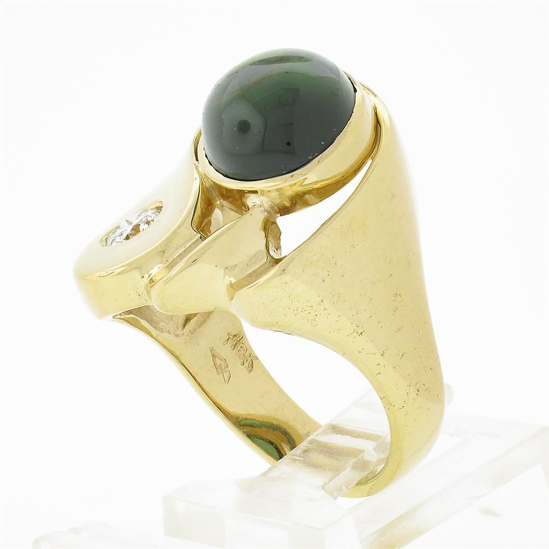 A solid 18k yelow gold geometric ring, with 1 oval cabochon cut natural tourmaline (12.4x10.3mm - 9.0ct), and 1 round brilliant cut natural diamond ( G - VS2 ; 0.31ct). The ring is size 8.0, weighs a total of 17.57 grams, and measures 22.25mm wide.
