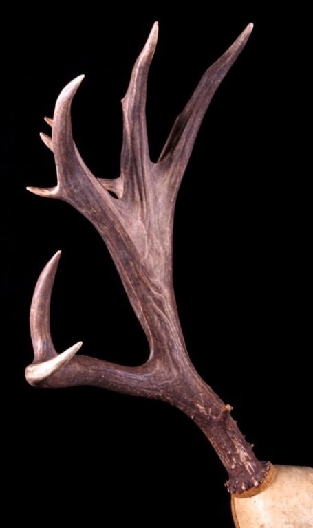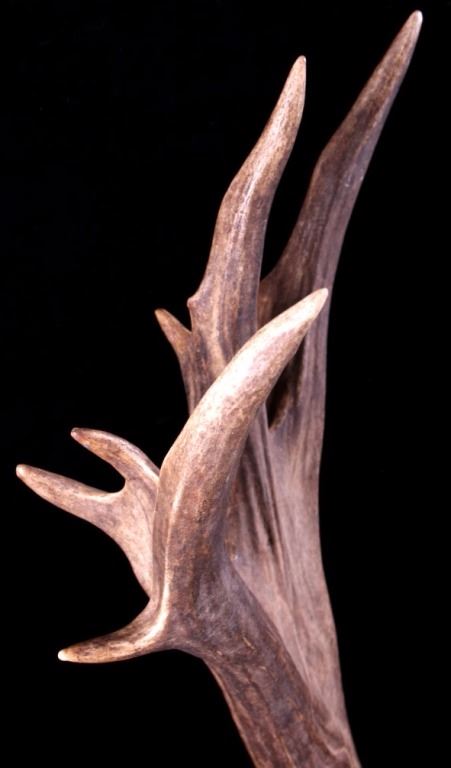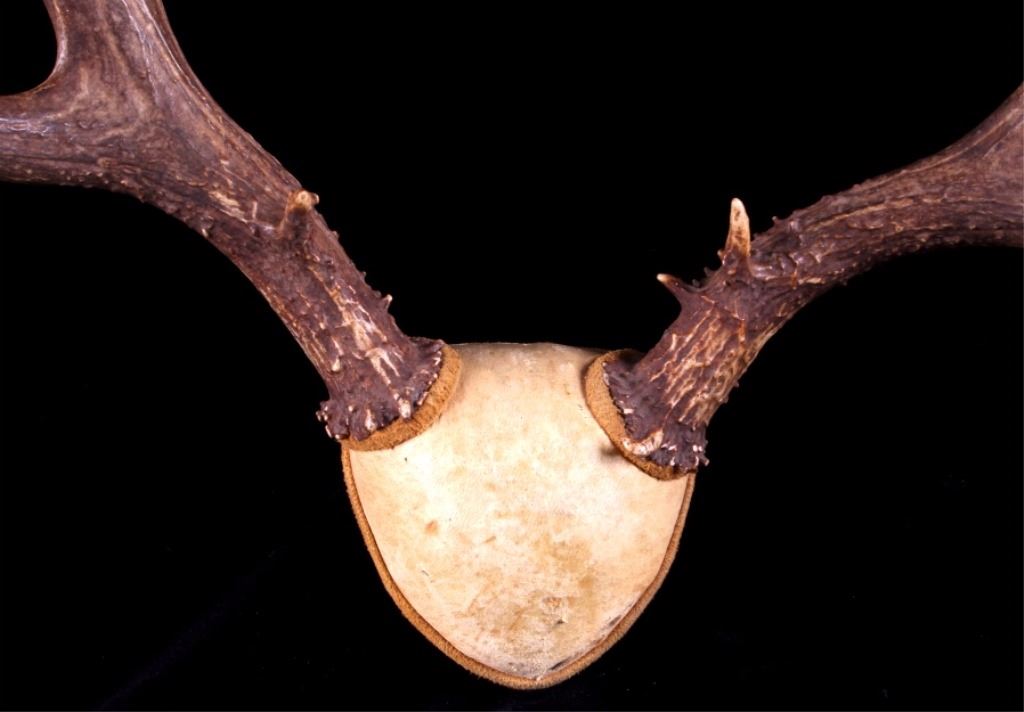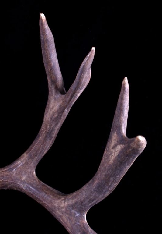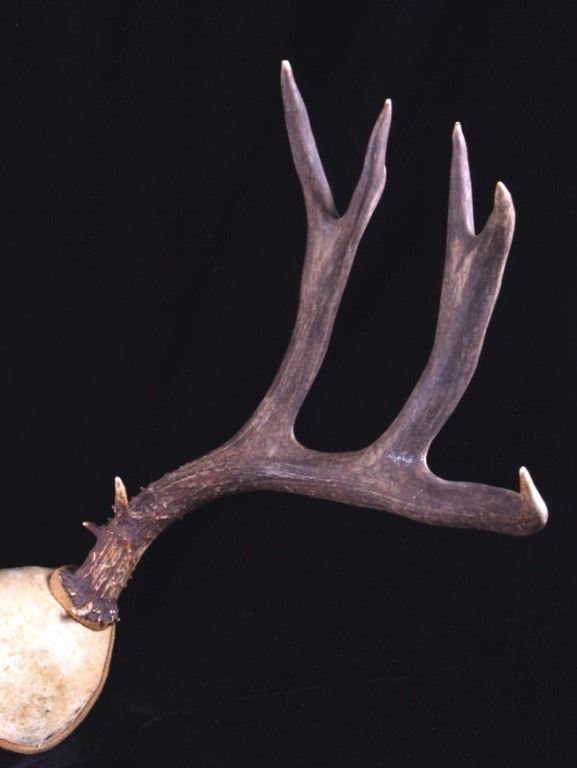 This is a set of large Montana non-typical mule deer antlers. The antlers are 7x11 and show good condition with great color. Great cabin or Western decor piece. The antlers have been mounted to a wooden plaque covered in buckskin. The antlers measure 26" wide.