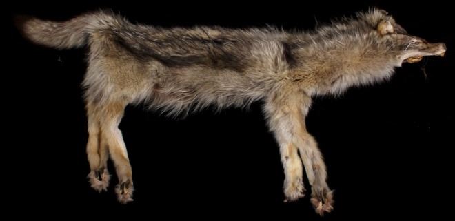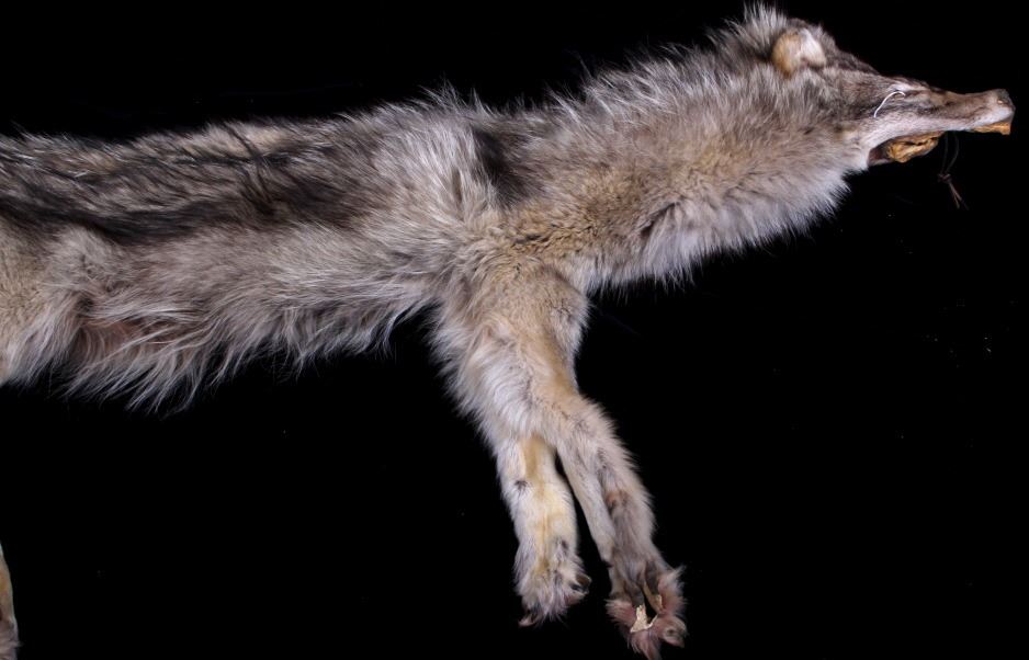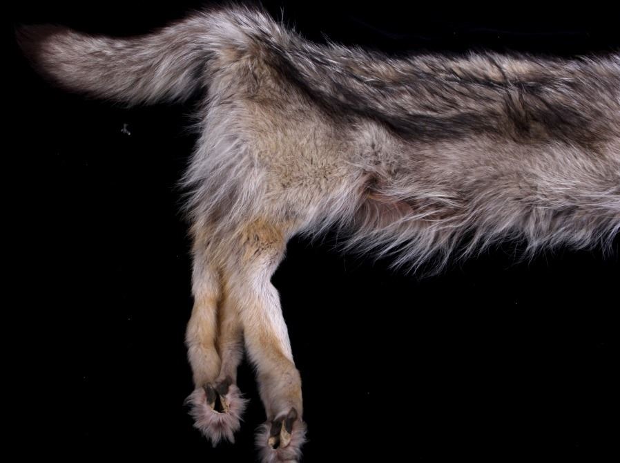 This is a tanned Montana wolf hide. The hide has been prepared by a professional taxidermist. It shows great black, tan, white, and gray colors. The Montana wolf hide is in good condition. It measures