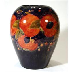Large Moorcroft pottery vase of ovoid form, hand painted and tubelined with the Pomegranate pattern onto a blue ground, impressed Moorcroft and signature to base, 34cm high