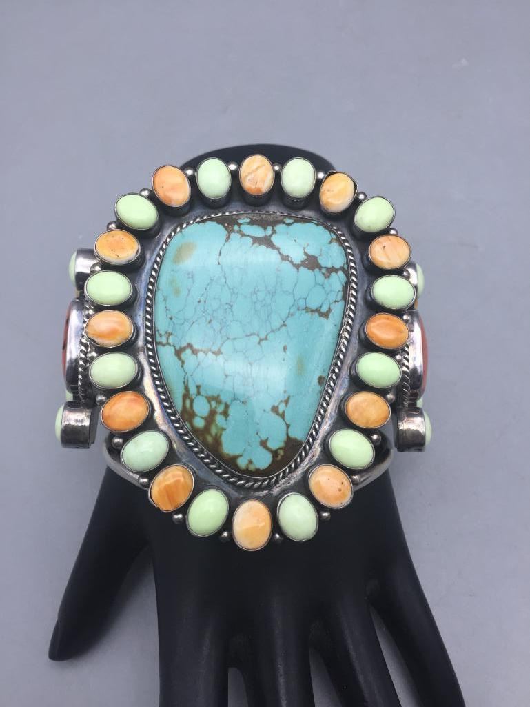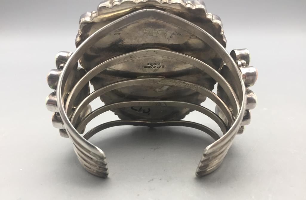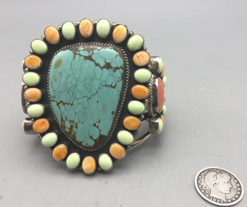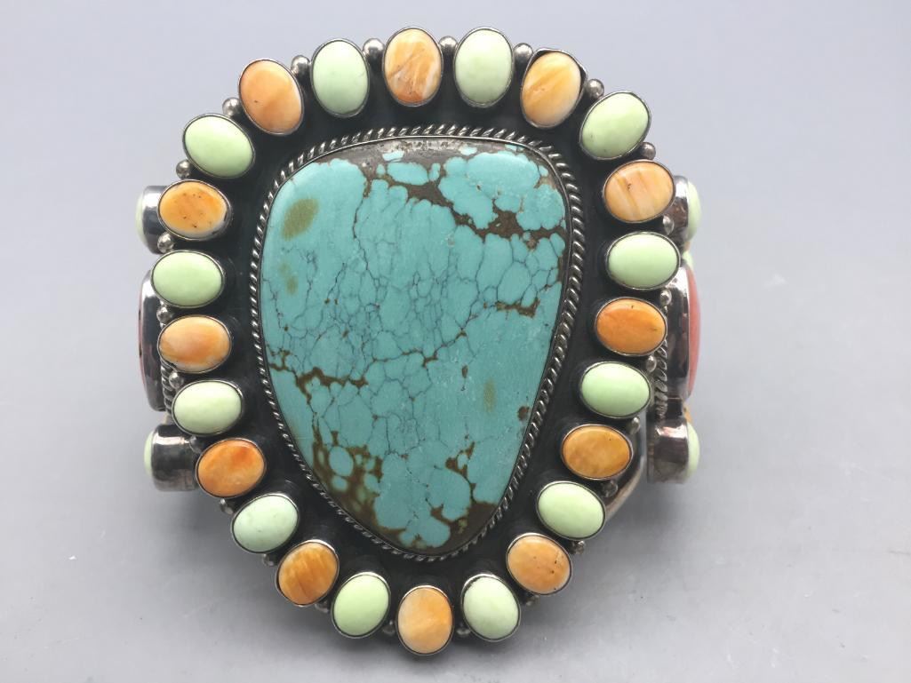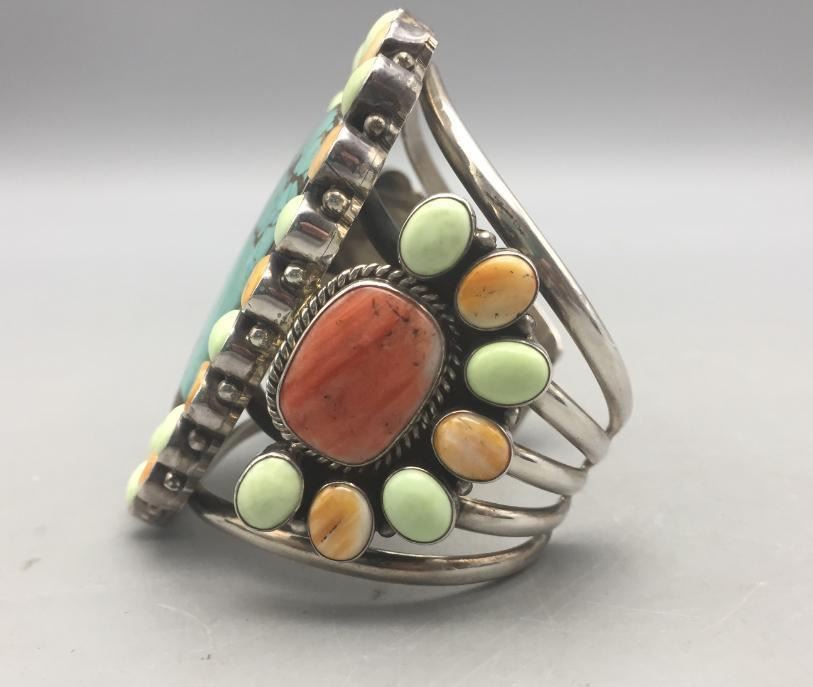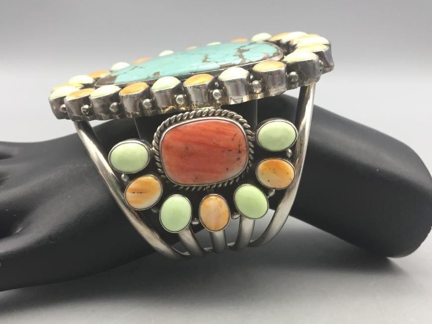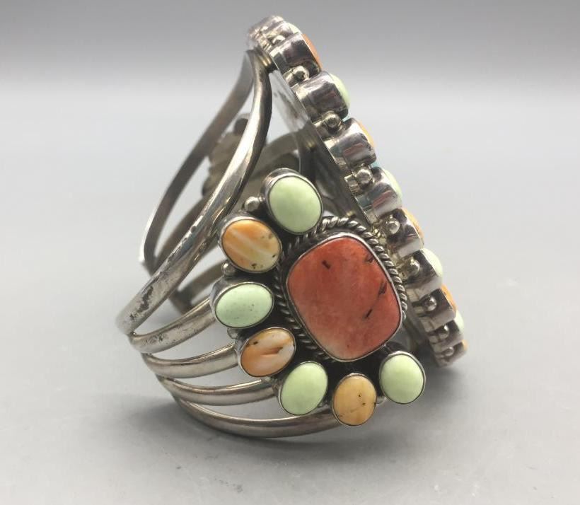 Presented for sale in this lot is a large, multi-stone cluster bracelet featuring two colors of spiny oyster, turquoise and other stones surrounded by sterling silver accents. Maker: Hallmarked D Livingston. Darren Livingston, Navajo. Approx. Age: Contemporary. Size: Measures 5-3/4" with a 1-3/8" opening, fits a 7-1/8" wrist. It is 3-1/8" wide and weighs 198.2 grams. Condition: Good for its age, normal wear expected. Please look closely at the pictures - they are an important part of our description. Shipping: There will be a $5 handling, packaging fee for shipping this lot. The actual cost of postage will be added on top of that.