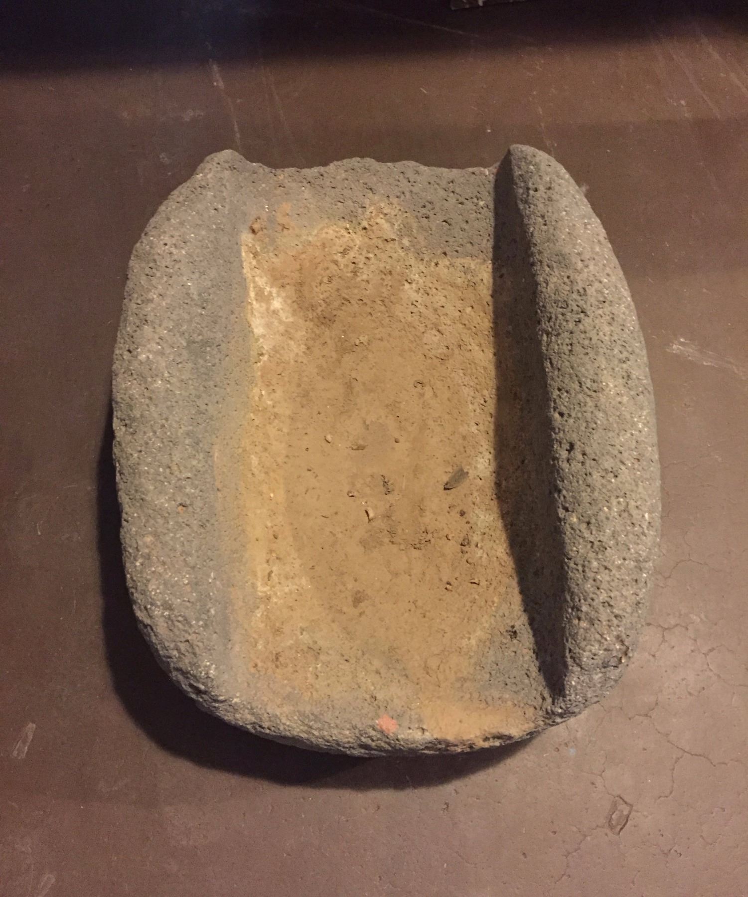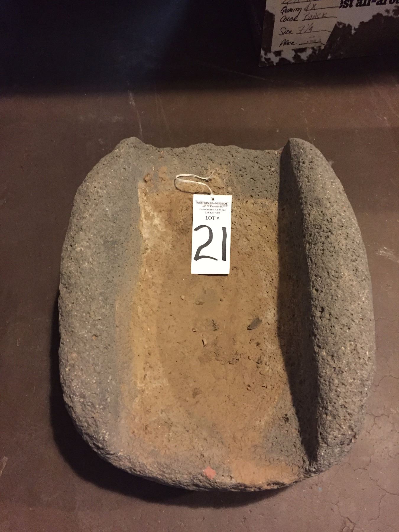Description: Museum quality, large and deep grinding stone. Maker: Unknown. Approx. Age: Prehistoric. Size: 13” w x 17” l. Condition: Good for its age, wear expected. Please look closely at the pictures - they are an important part of our description. Shipping: There will be a $10 handling / packaging fee for shipping this lot. The actual cost of postage will be added on top of that.