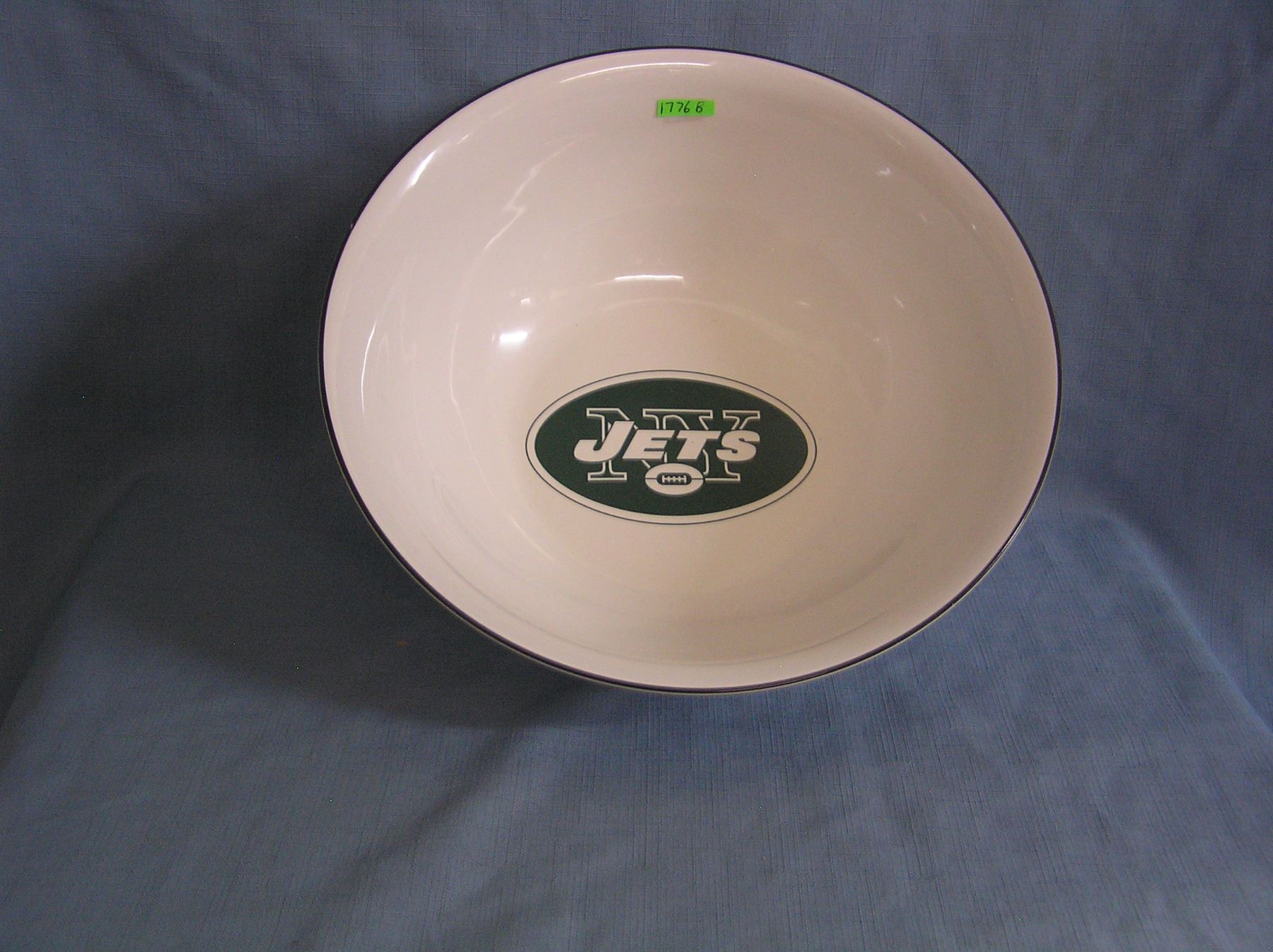 Large NY Jets serving bowl with multiple Jets logos around the outer bowl and inside Jets logos around the outer bowl and inside center of the bowl, there is a small chip on the outside of rim otherwise very good est. value $50.00-$60.00