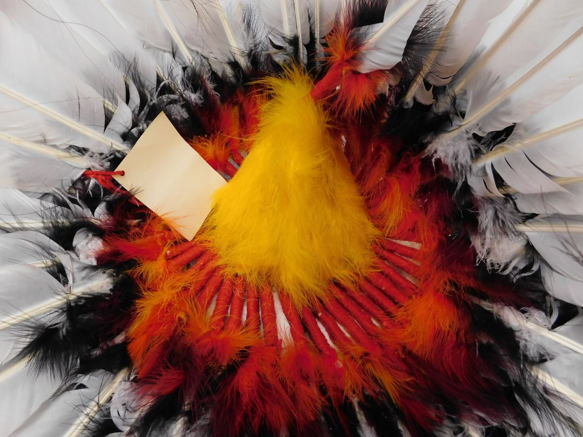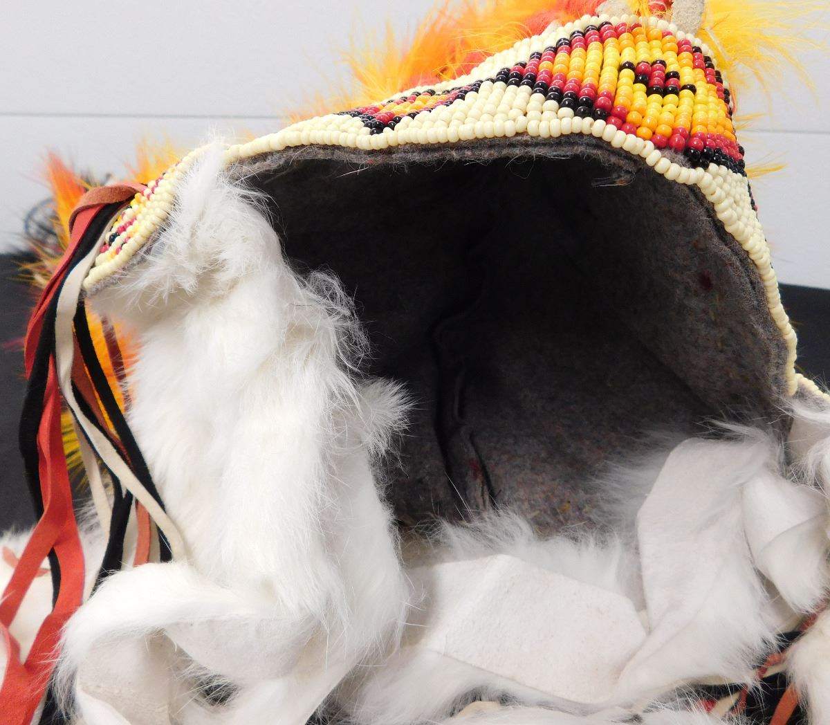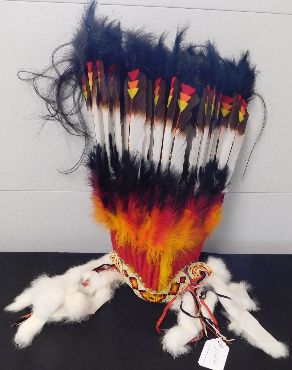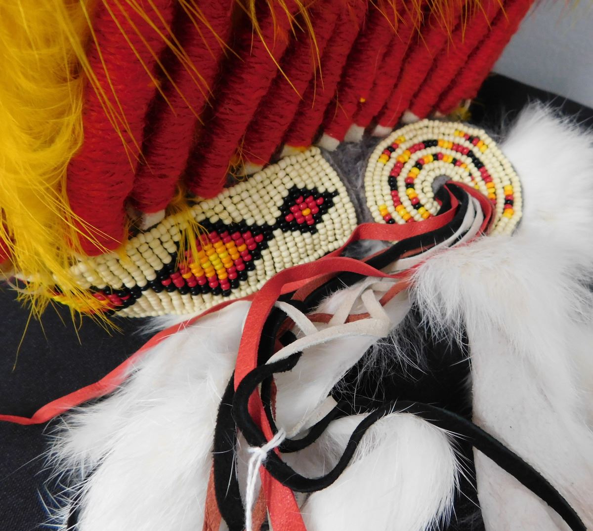 Large Native American Headdress, 20th century item. Made of glass beads, feathers and cloth, this item measures roughly 32" x 22". Navajo, from New Mexico. Still has the original tag and price from gallery. Ceremonial headdress. Condition: Very good, fine condition, see images. Shipping: $30.00.