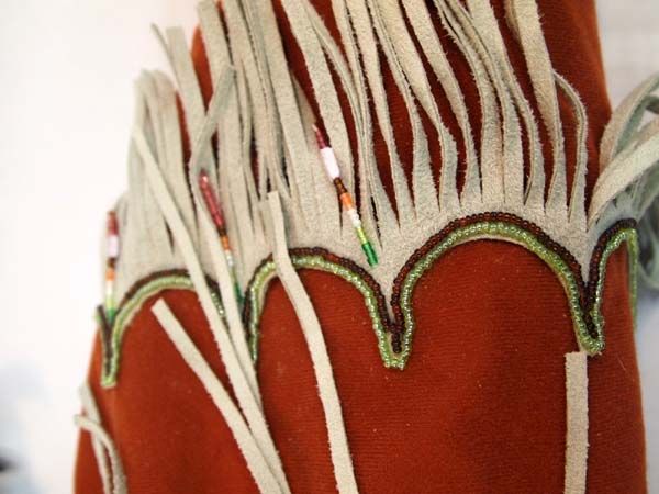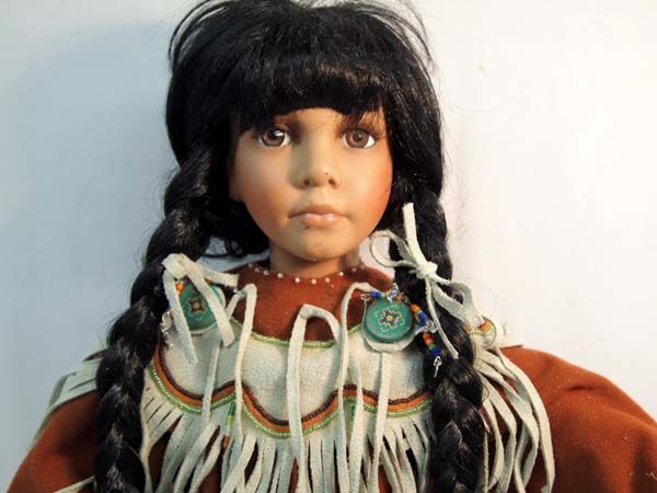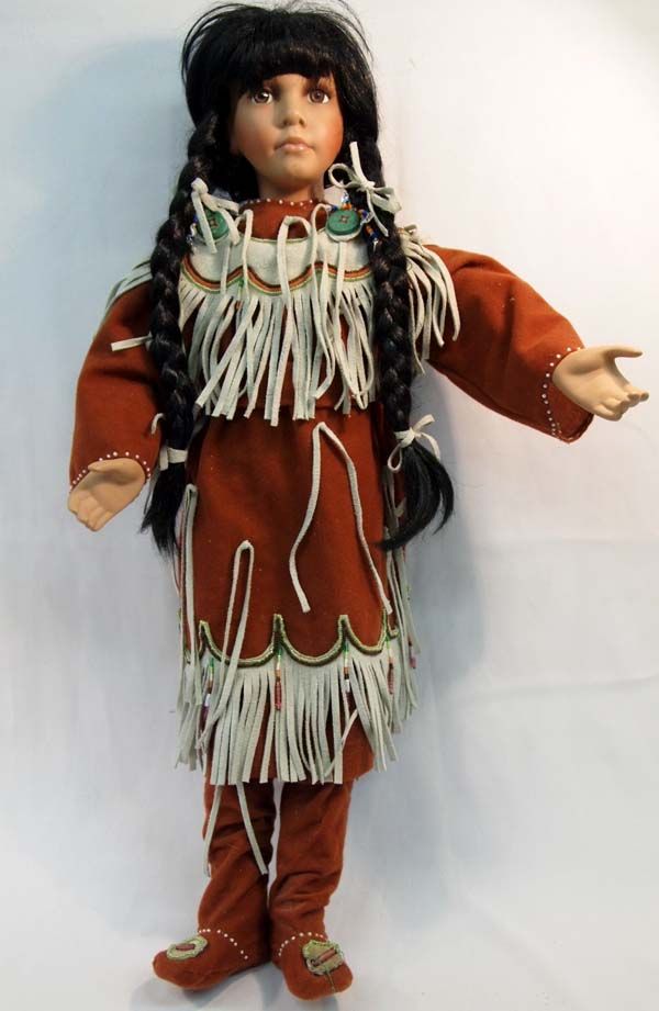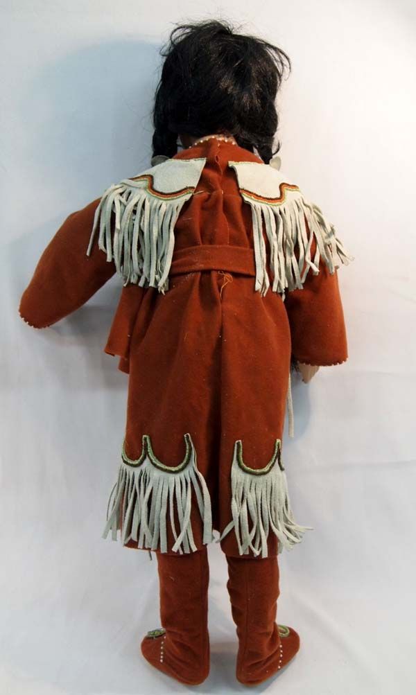 Large Native American Indian Doll. This young lady is dressed in suede dress and boots with bead and leather fringe. The doll is cloth and composition. She stands 24''H and 13.5'' across.