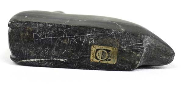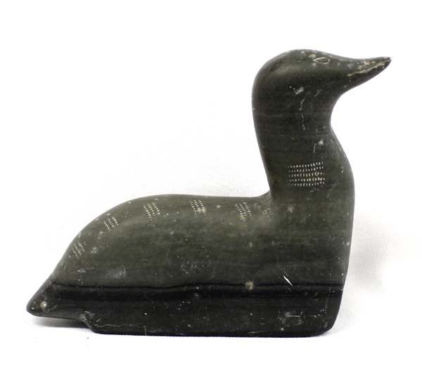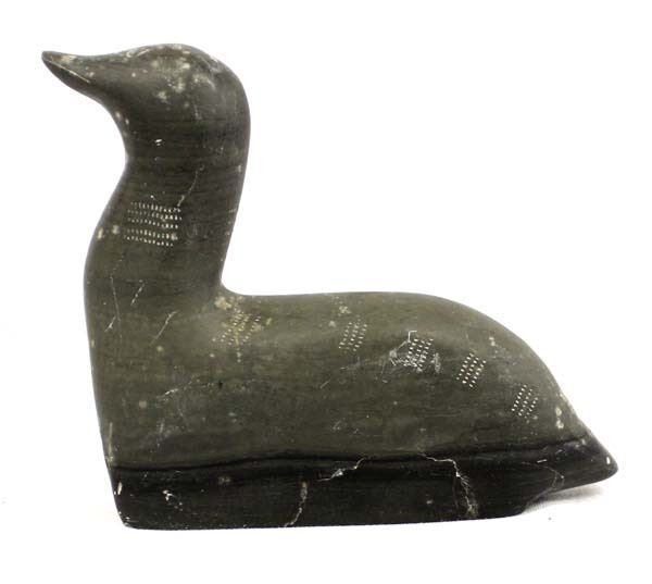 Large Native American Inuit Carved Stone Loon, measures 1.5'' x 4'' x 5'', signed in Inuktitut and Roman with disc number