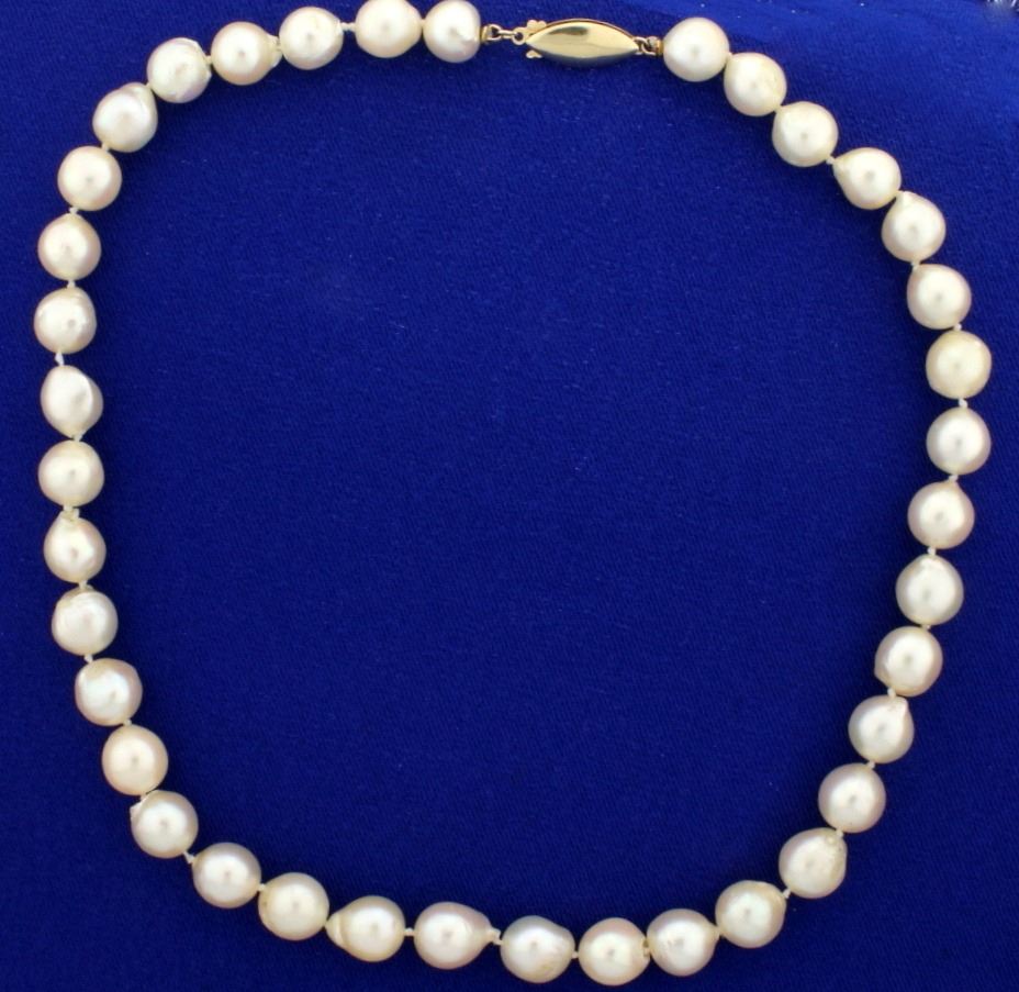 In 14k yellow gold. Contains thirty eight high quality 9mm baroque shaped akoya pearls with high luster and excellent color. 16" long. 35.0g.