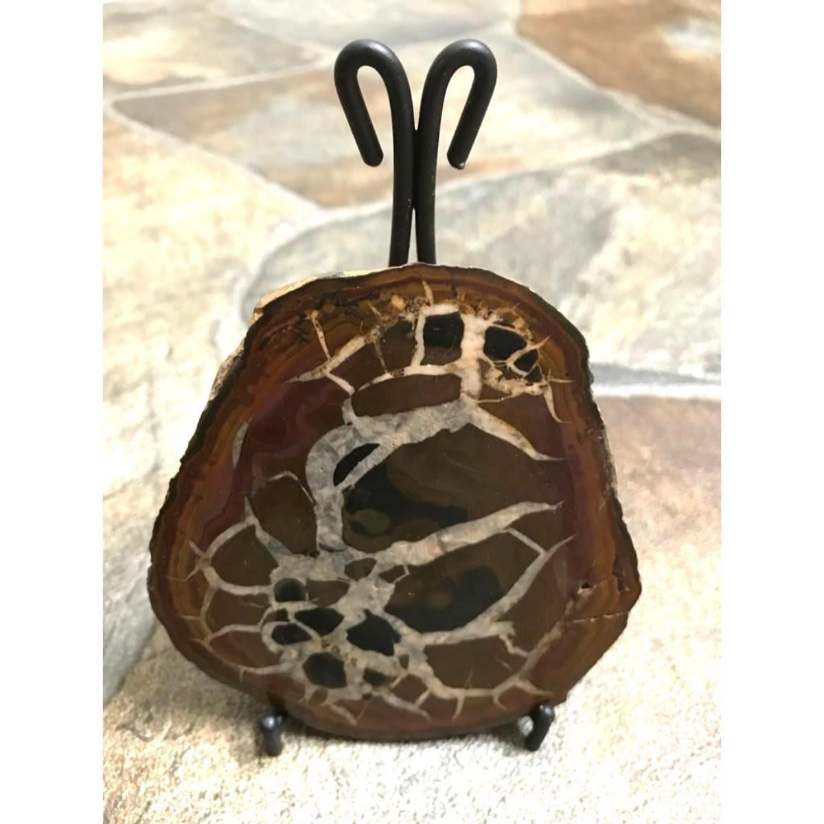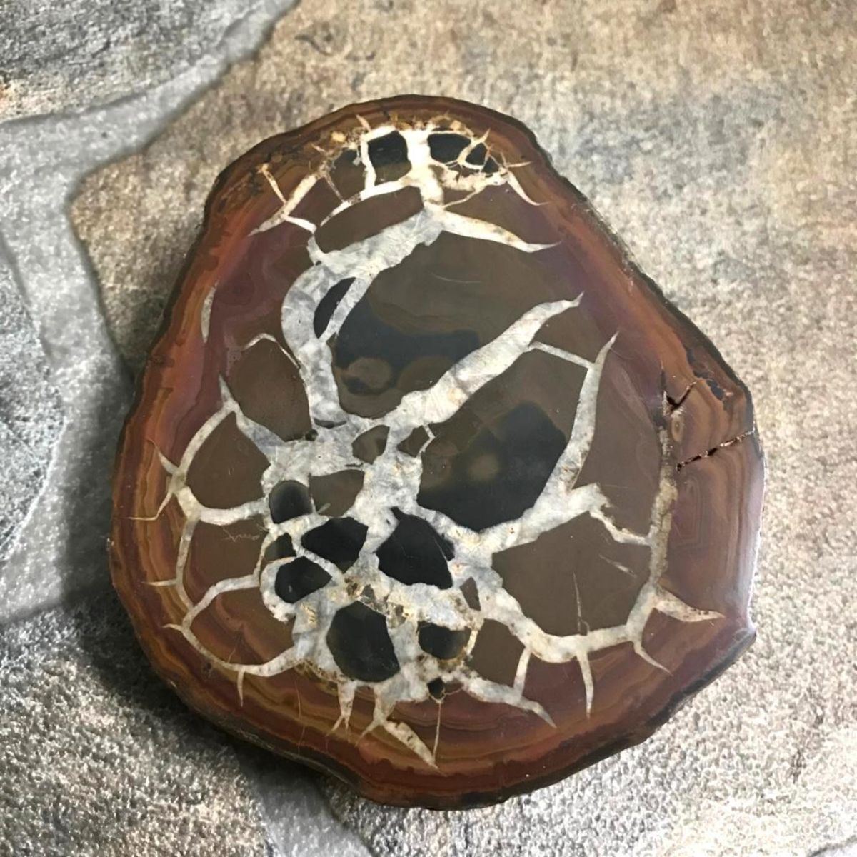 Large size, natural cut & polished display specimen half stoneslice,SeptarianNodule / Dragon's Stone. Morocco origin. Sharp contrasting colors & lighting claw pattern. Comes with metal display stand. 777 grams weight. 4" H X 3 1/2" W. 5" H stand.