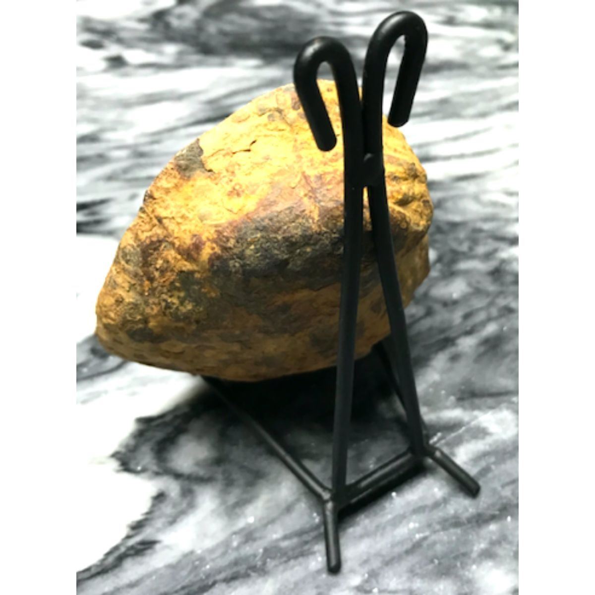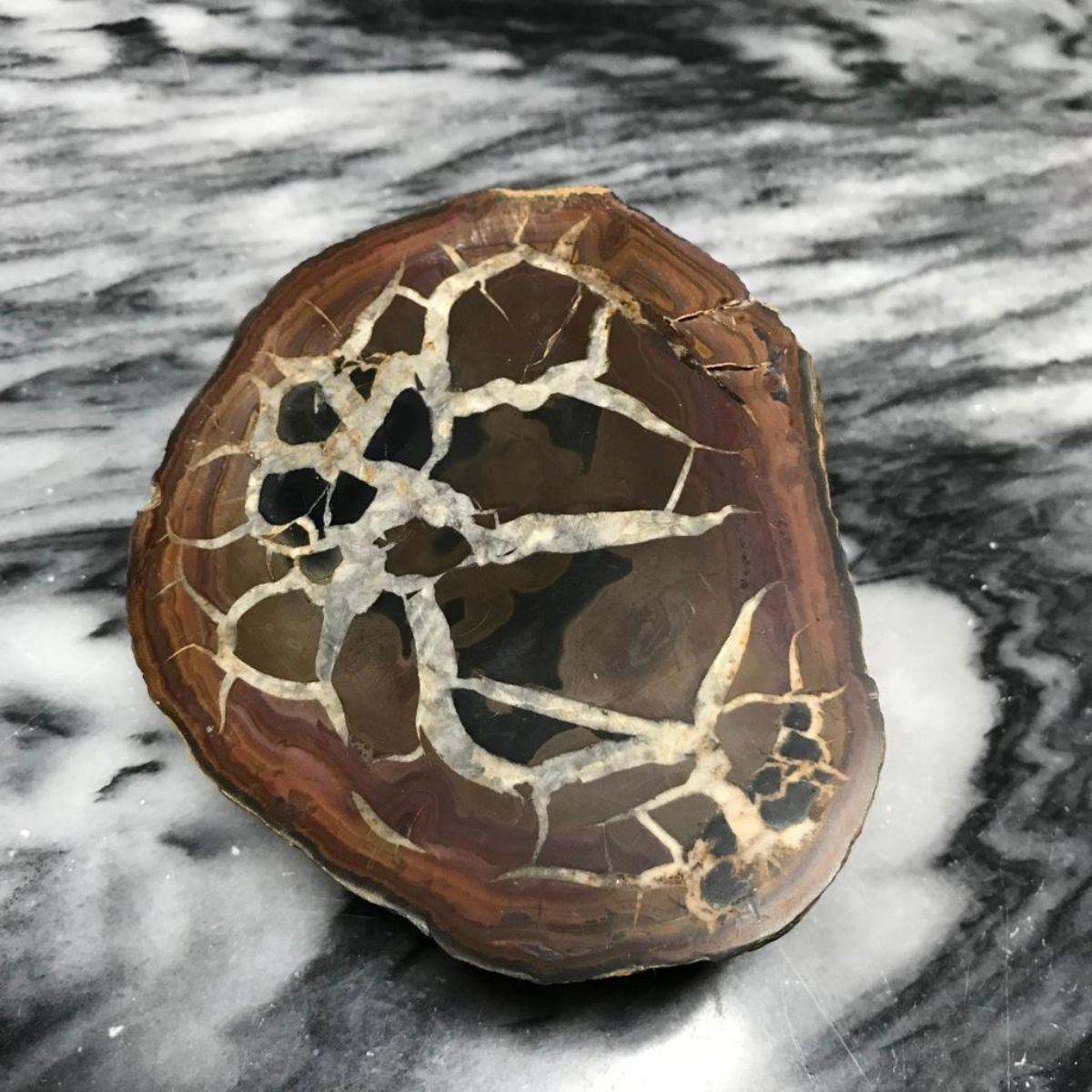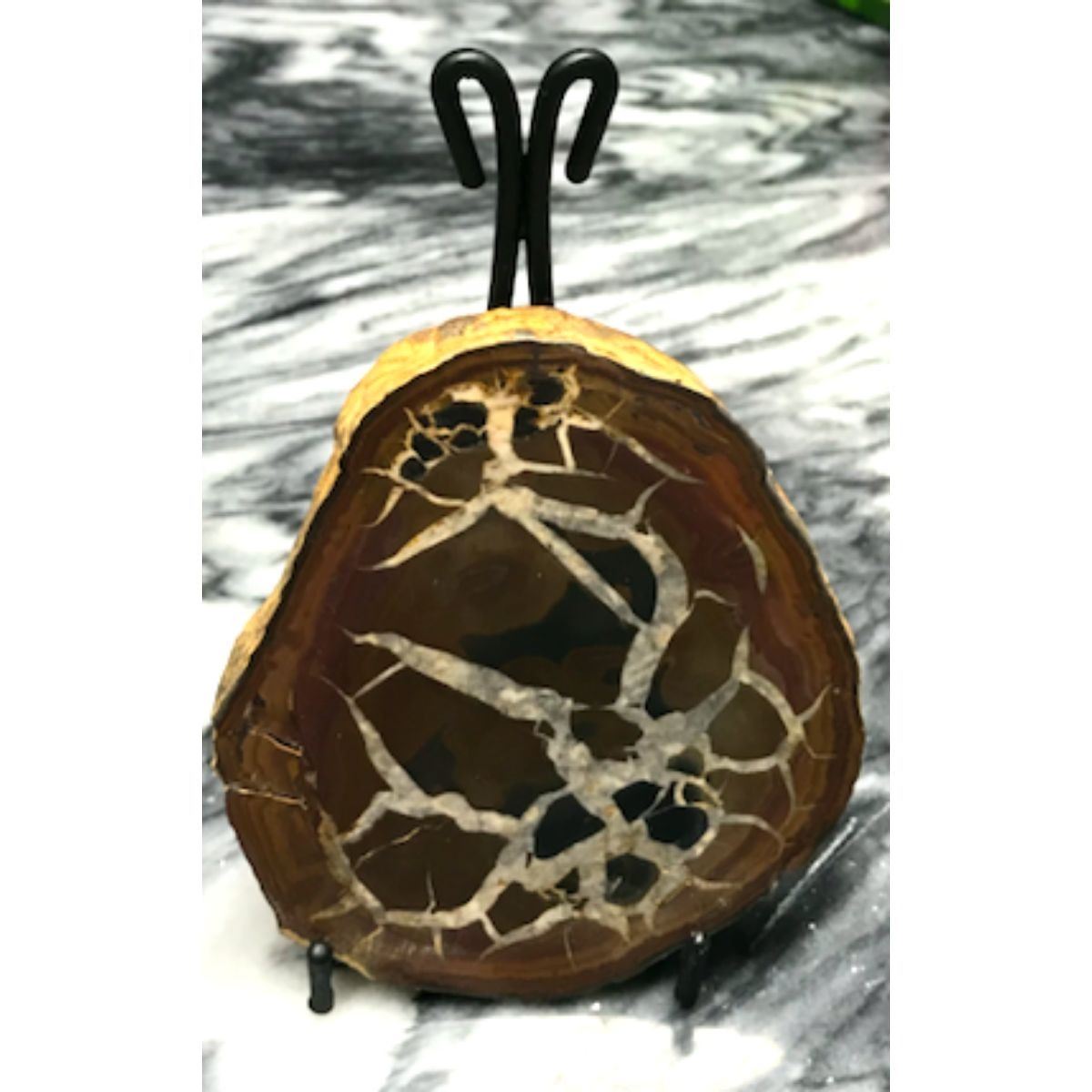 Large size, natural cut & polished display specimen half stone slice, Septarian Nodule / Dragon's Stone. Morocco origin. Sharp contrasting colors & lighting claw pattern. Comes with metal display stand. 777 grams weight. 4" H X 3 1/2" W. 5" H stand.Â