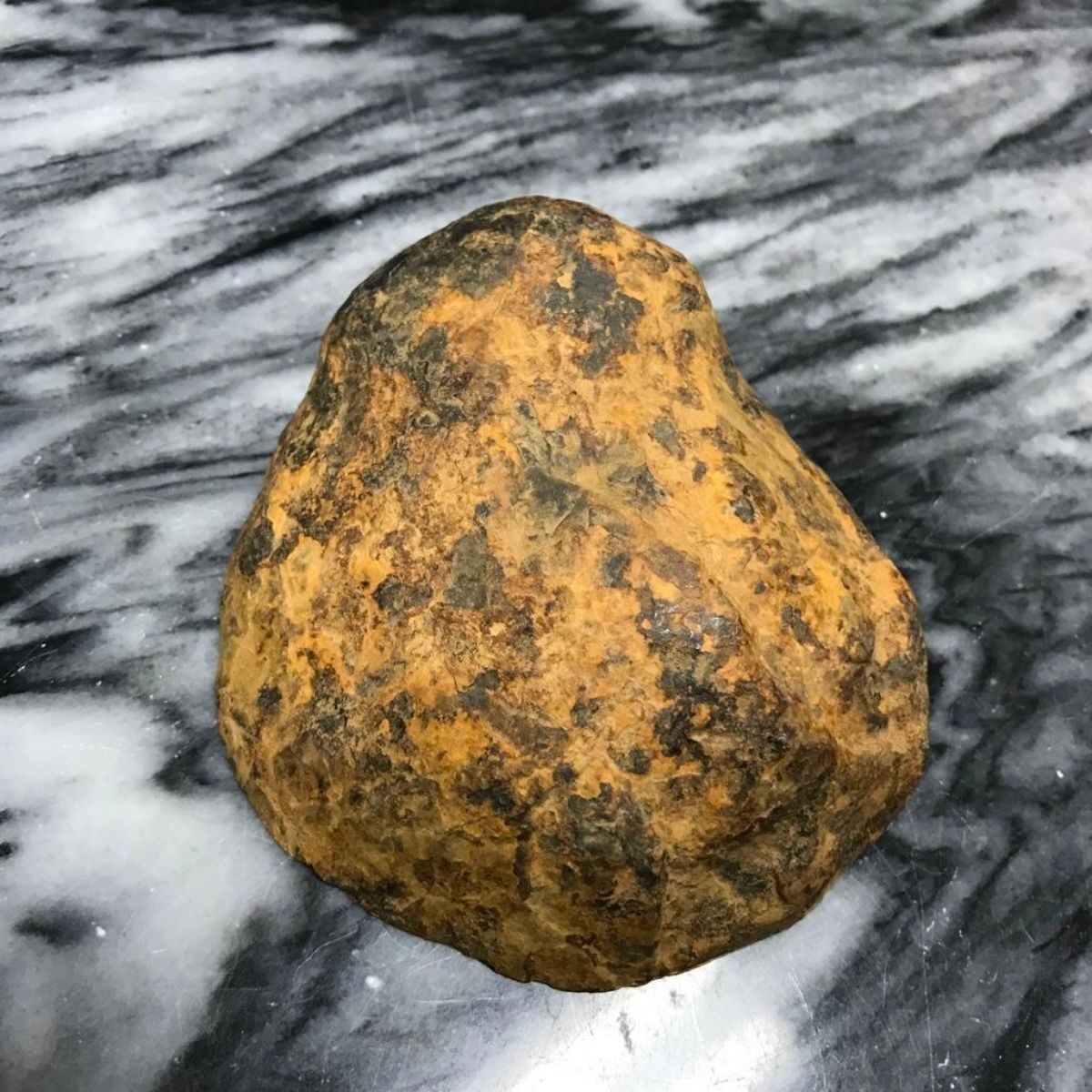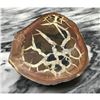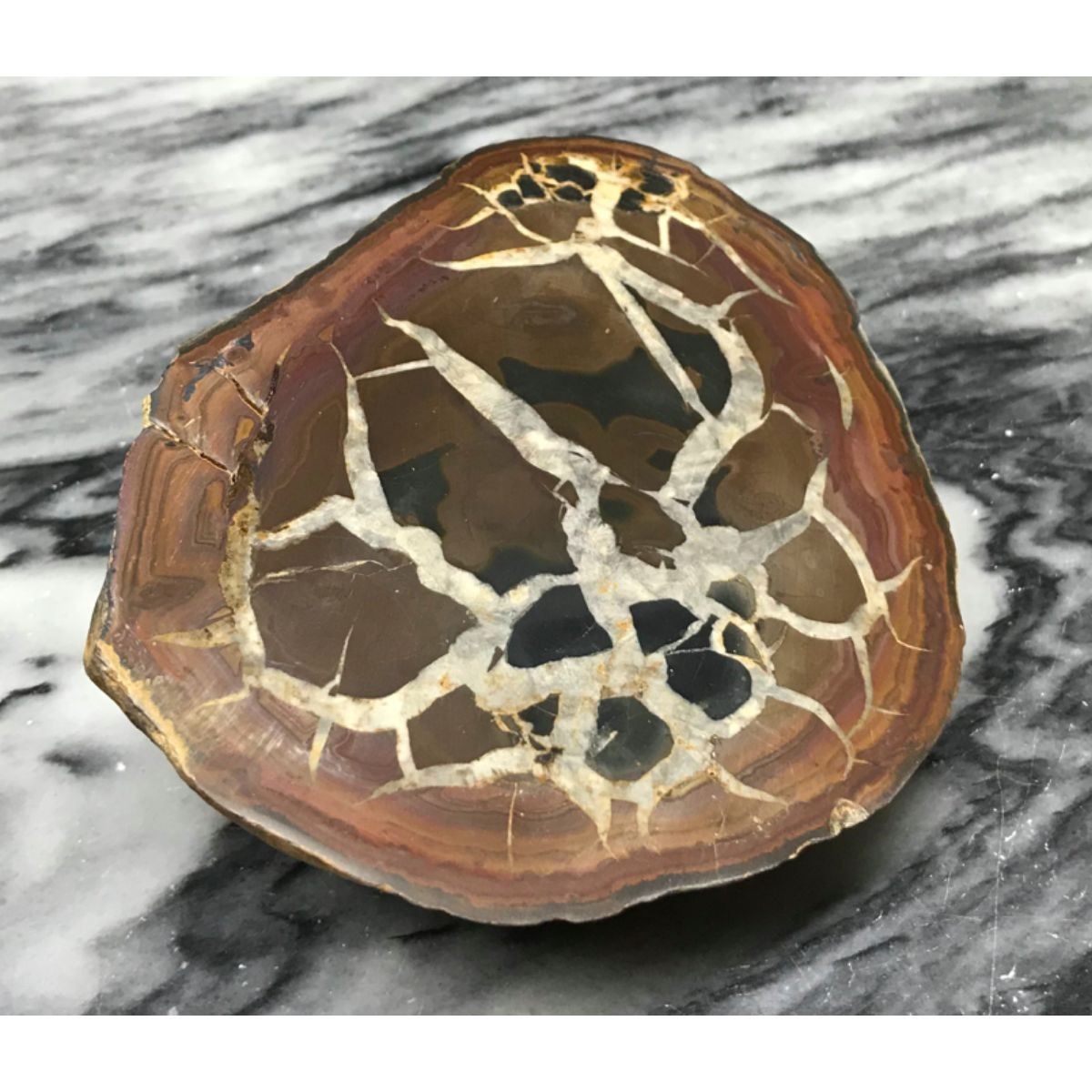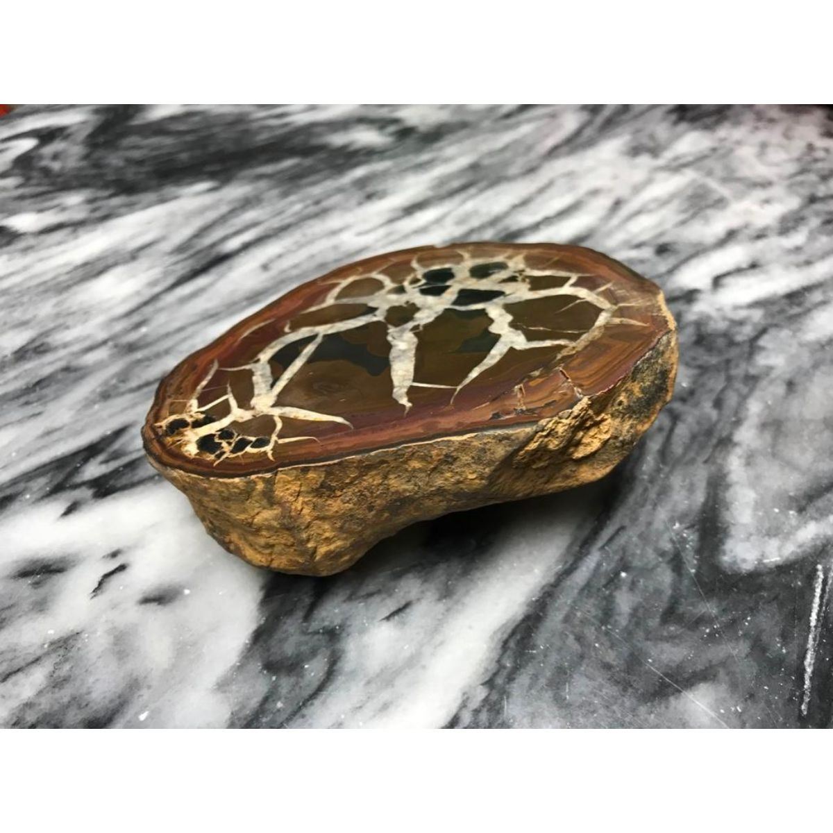 Large size, natural cut & polished display specimen half stone slice, Septarian Nodule / Dragon's Stone. Morocco origin. Sharp contrasting colors & lighting claw pattern. Comes with metal display stand. 777 grams weight. 4" H X 3 1/2" W. 5" H stand.Â