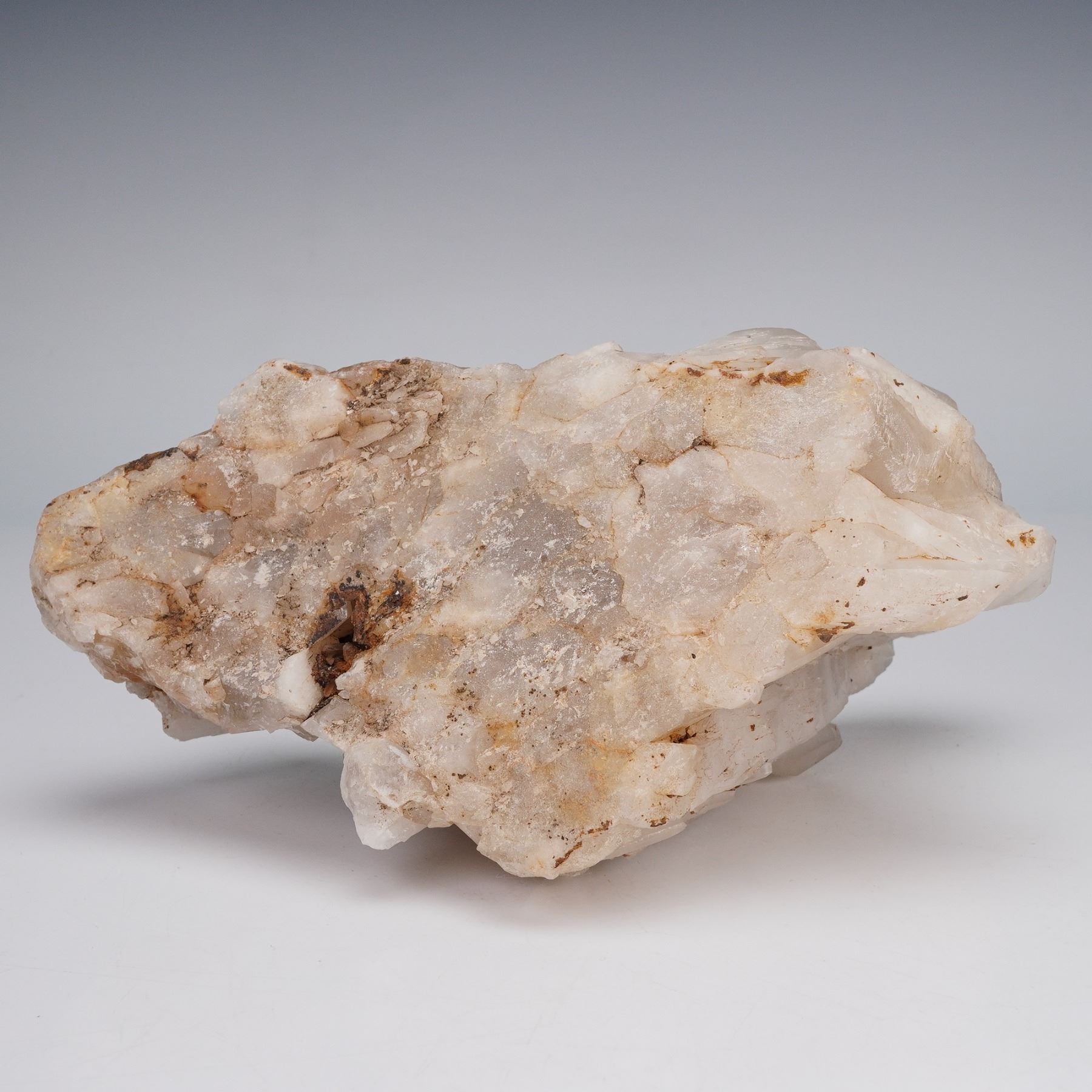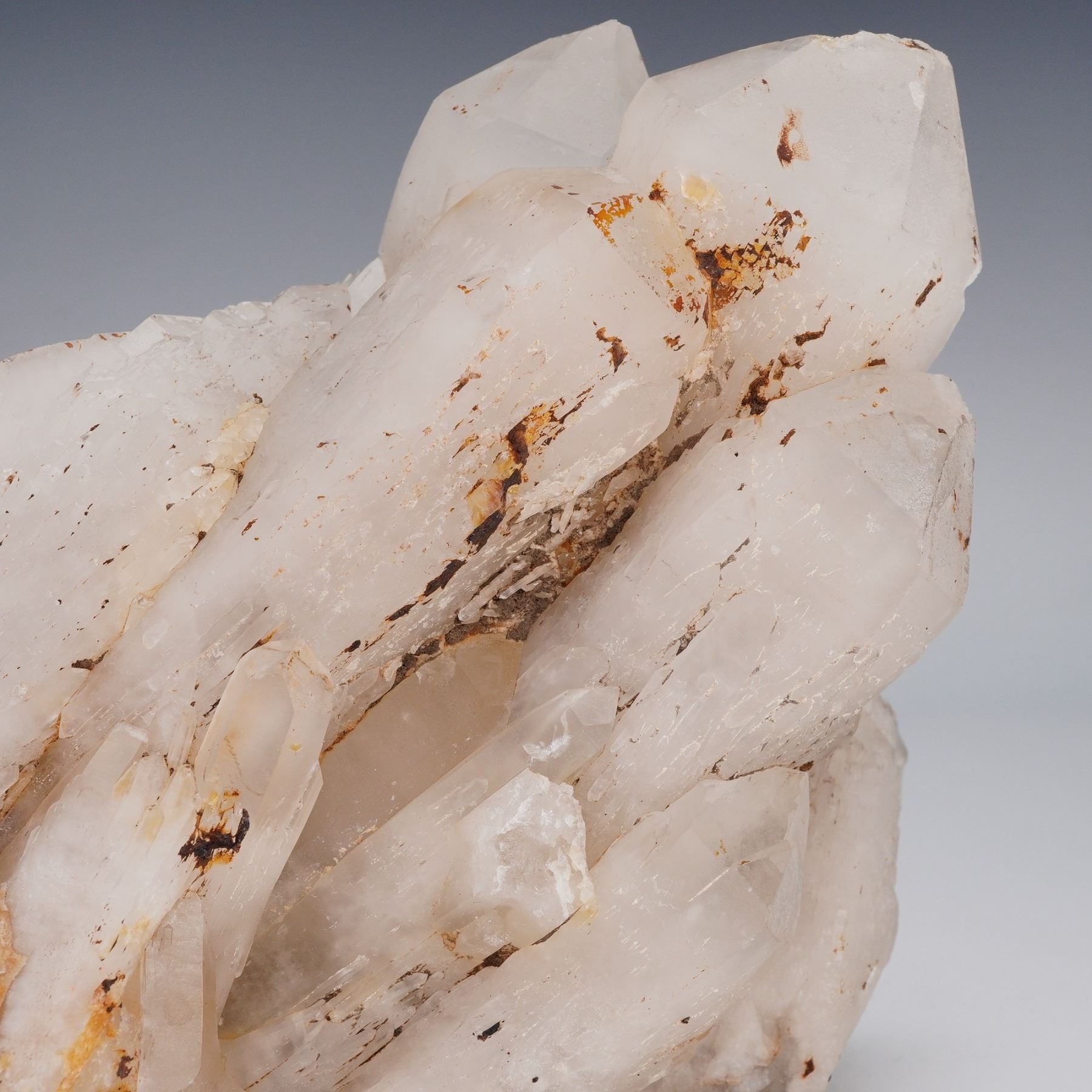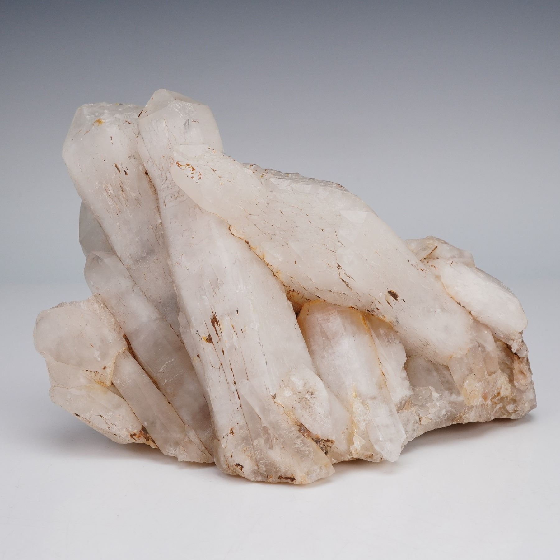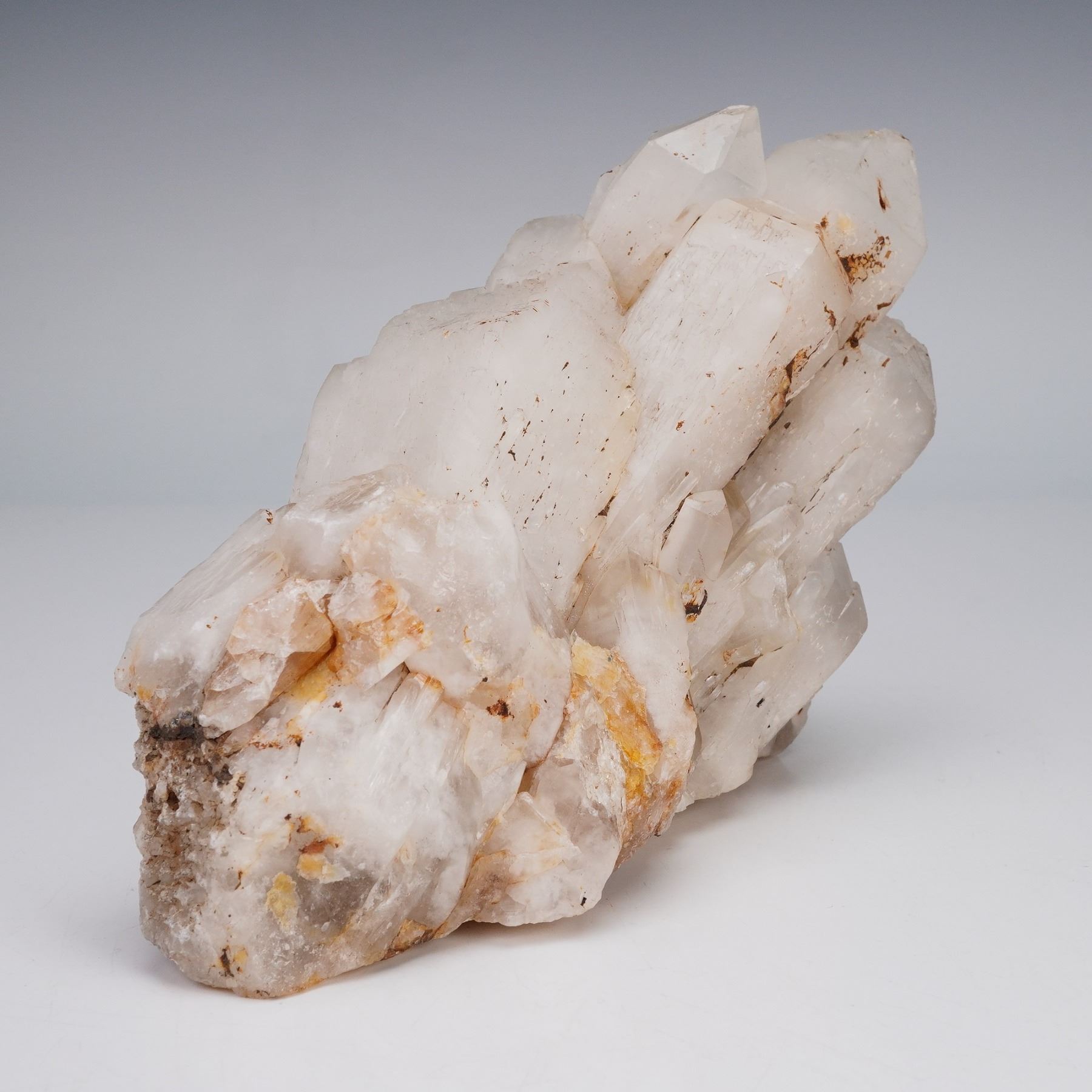 Substantial natural quartz crystal cluster featuring multiple terminated points in a striking formation. The specimen displays translucent to milky white crystal growth with natural inclusions and iron oxide deposits adding character. A bold decorative mineral suitable for display or study.