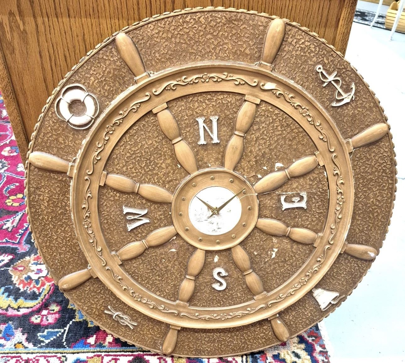 Large round nautical-themed wall clock designed in the style of a ship’s wheel with raised decorative elements including an anchor and maritime motifs. The clock face is centered with cardinal direction letters (N, S, E, W) arranged around the outer ring. The piece shows scattered paint wear and age marks throughout, adding to its vintage character. The reverse side is inscribed and dated “1976,†and the battery-operated movement is present but working condition is untested. A substantial display piece with rustic nautical charm.