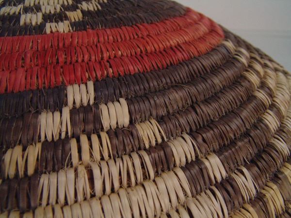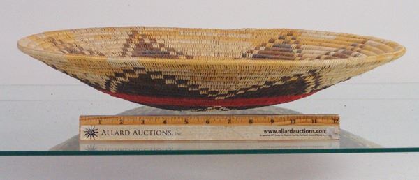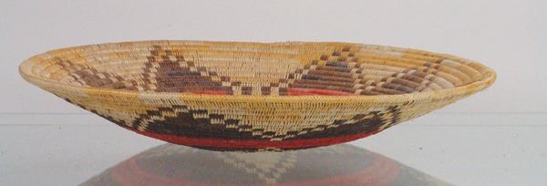 Large, finer weave polychrome basketry tray with popular wedding basket design. Very good condition.Ca. 1970s-1980s4" x 22"