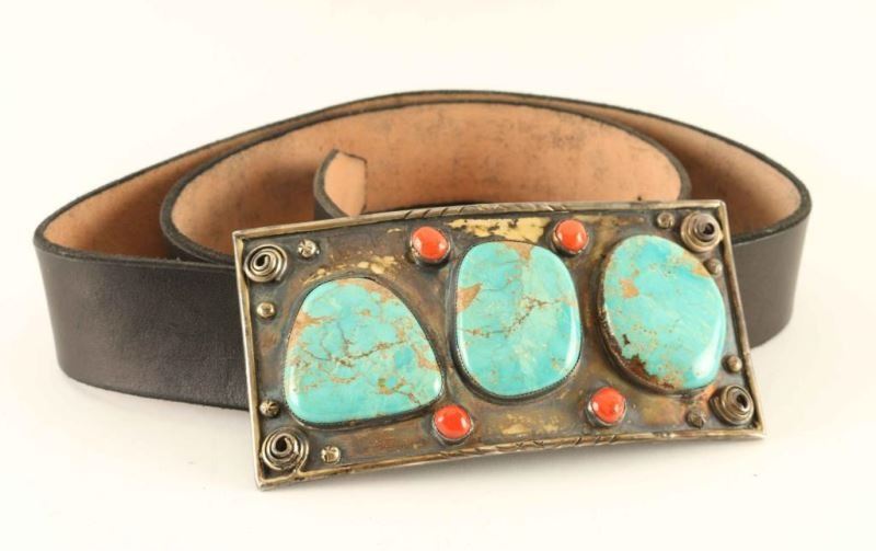 Large 6"x3" buckle of sterling silver with three large 2" cabs of Kingman turquoise with four small coral accent stones in the center. Comes on a smooth black leather belt size 42.