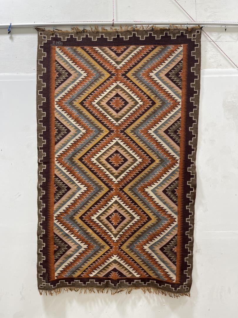 Looks like a Burntwater Navajo Rug, but it is fringed on the ends. 47 1/2" by 77".