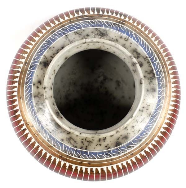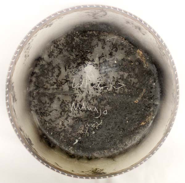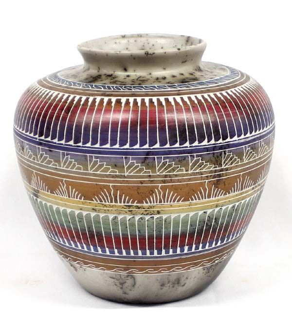 Brand New Native American Navajo Carved Pottery Jar by Whitegoat, measures 9'' x 9'' and is signed on the bottom, beautifully etched stylized feather designs, beautiful colors