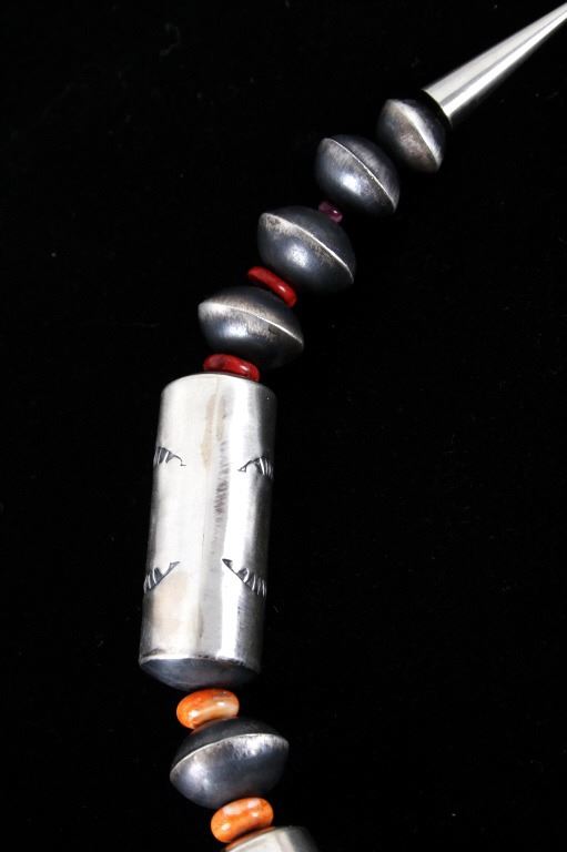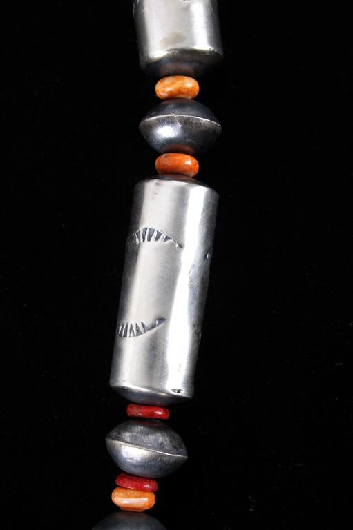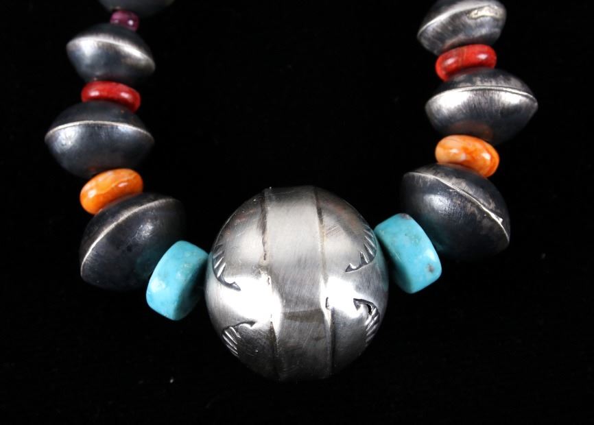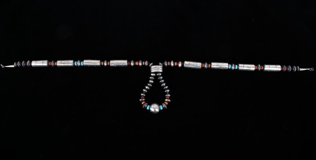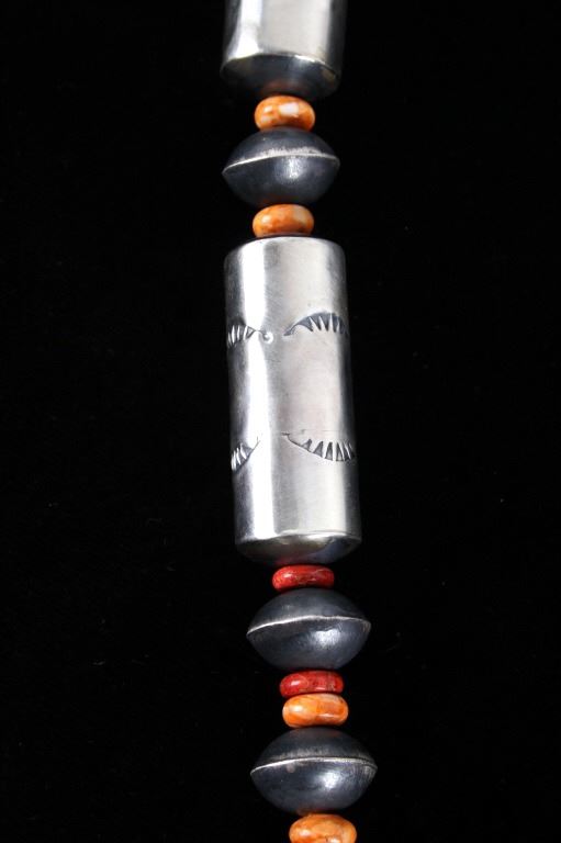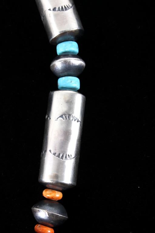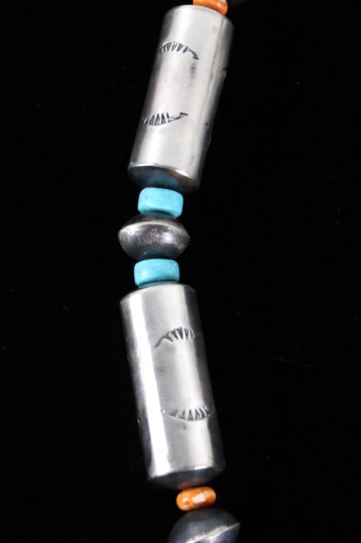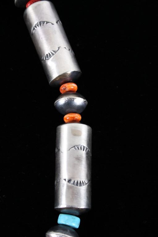 Featured in this lot is this sterling silver, turquoise, spiny oyster, and red branch coral necklace from Navajo artist Sam Begay. The necklace features wonderfully and professionally crafted discoidal cabochons of turquoise, spiny oyster, and red branch coral with sterling silver beads and cylindrical constructed beads that are stamped and embossed. The necklace is stamped with the artist’s hallmark on the central bead with 'sterling' stamps on the aglets and underneath the hallmark. The condition of this necklace is good, with no obvious signs of damage. The measurement from clasp to clasp is 30 1/2". The weight of this necklace is 148.1 g.