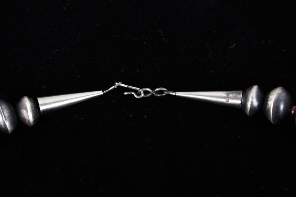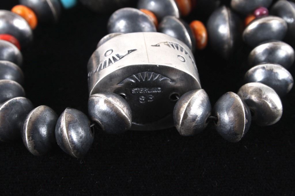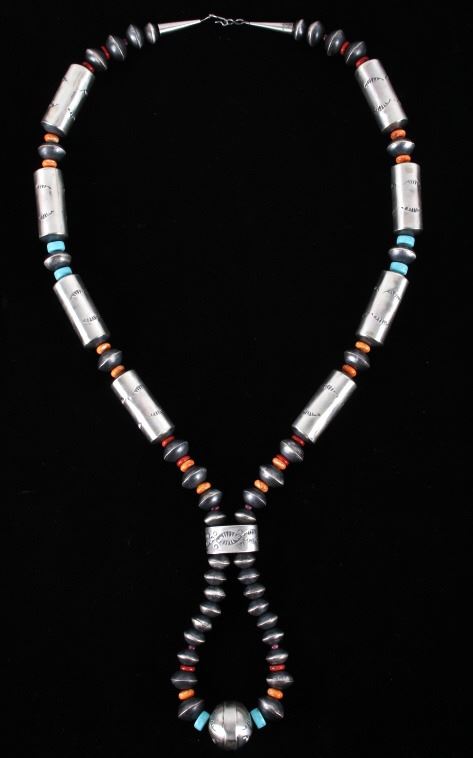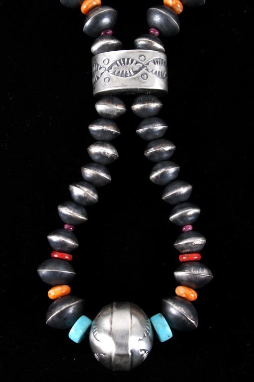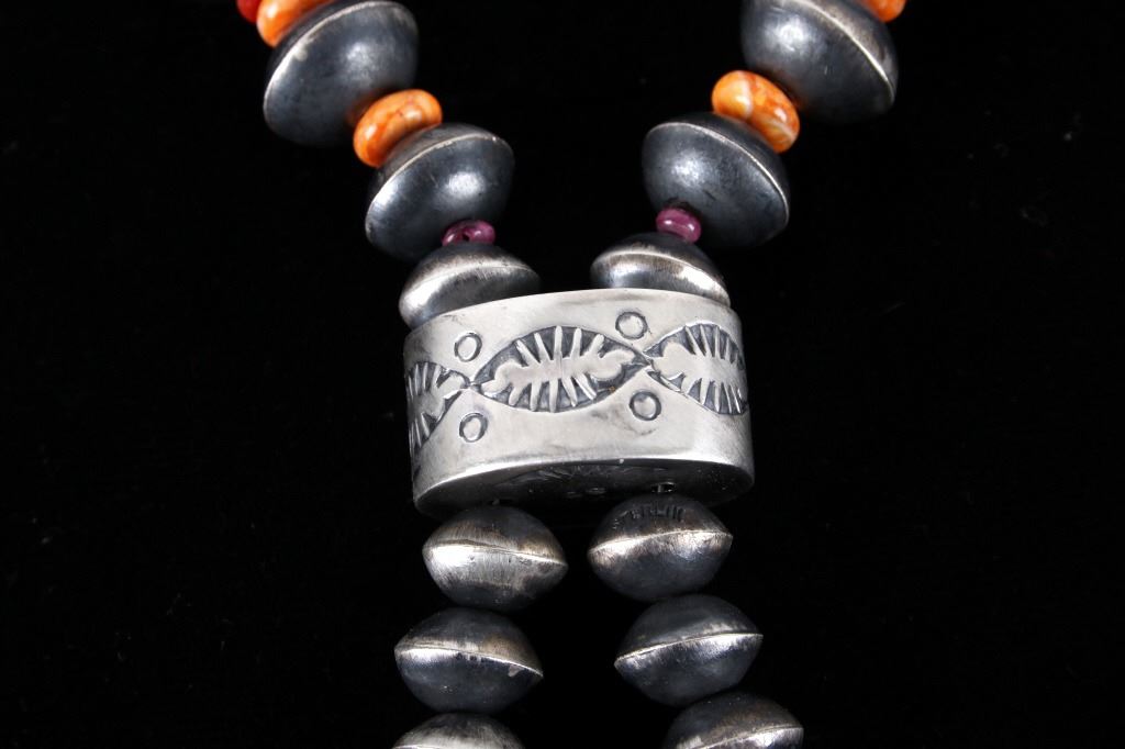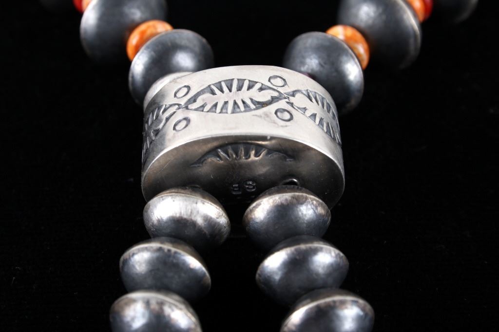 Featured in this lot is this sterling silver, turquoise, spiny oyster, and red branch coral necklace from Navajo artist Sam Begay. The necklace features wonderfully and professionally crafted discoidal cabochons of turquoise, spiny oyster, and red branch coral with sterling silver beads and cylindrical constructed beads that are stamped and embossed. The necklace is stamped with the artist’s hallmark on the central bead with 'sterling' stamps on the aglets and underneath the hallmark. The condition of this necklace is good, with no obvious signs of damage. The measurement from clasp to clasp is 30 1/2". The weight of this necklace is 148.1 g.