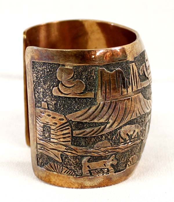 Large Native American Navajo Copper Storyteller Cuff Bracelet by Elaine Becenti, inside measures 7'' which includes the opening by 2.25''W, very intricate details, hallmarked, well executed, Truly a work of art!!!!