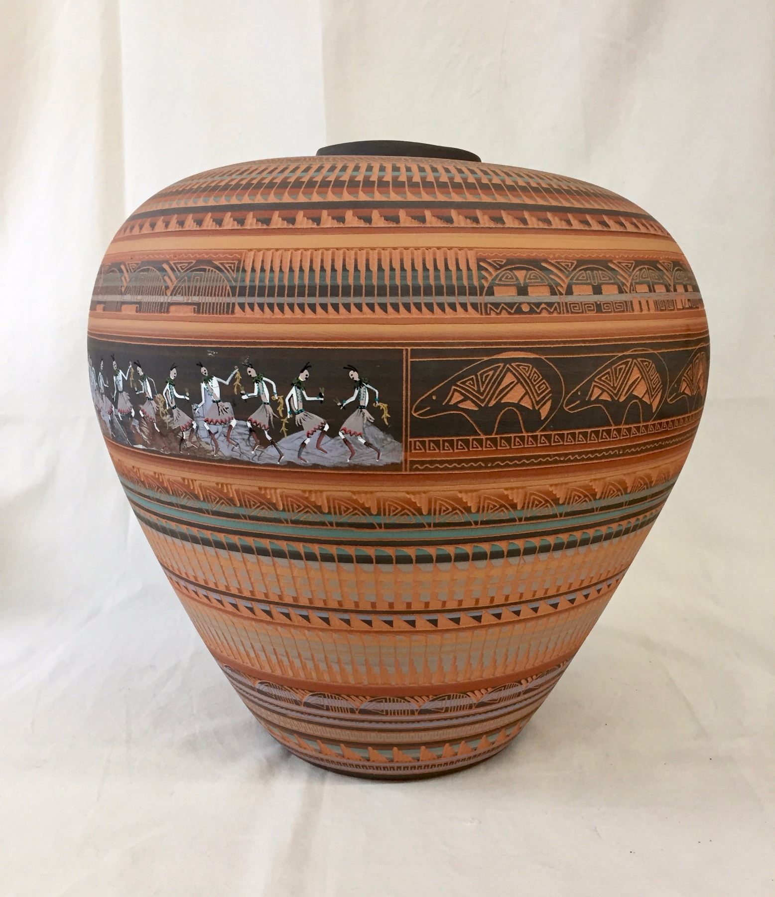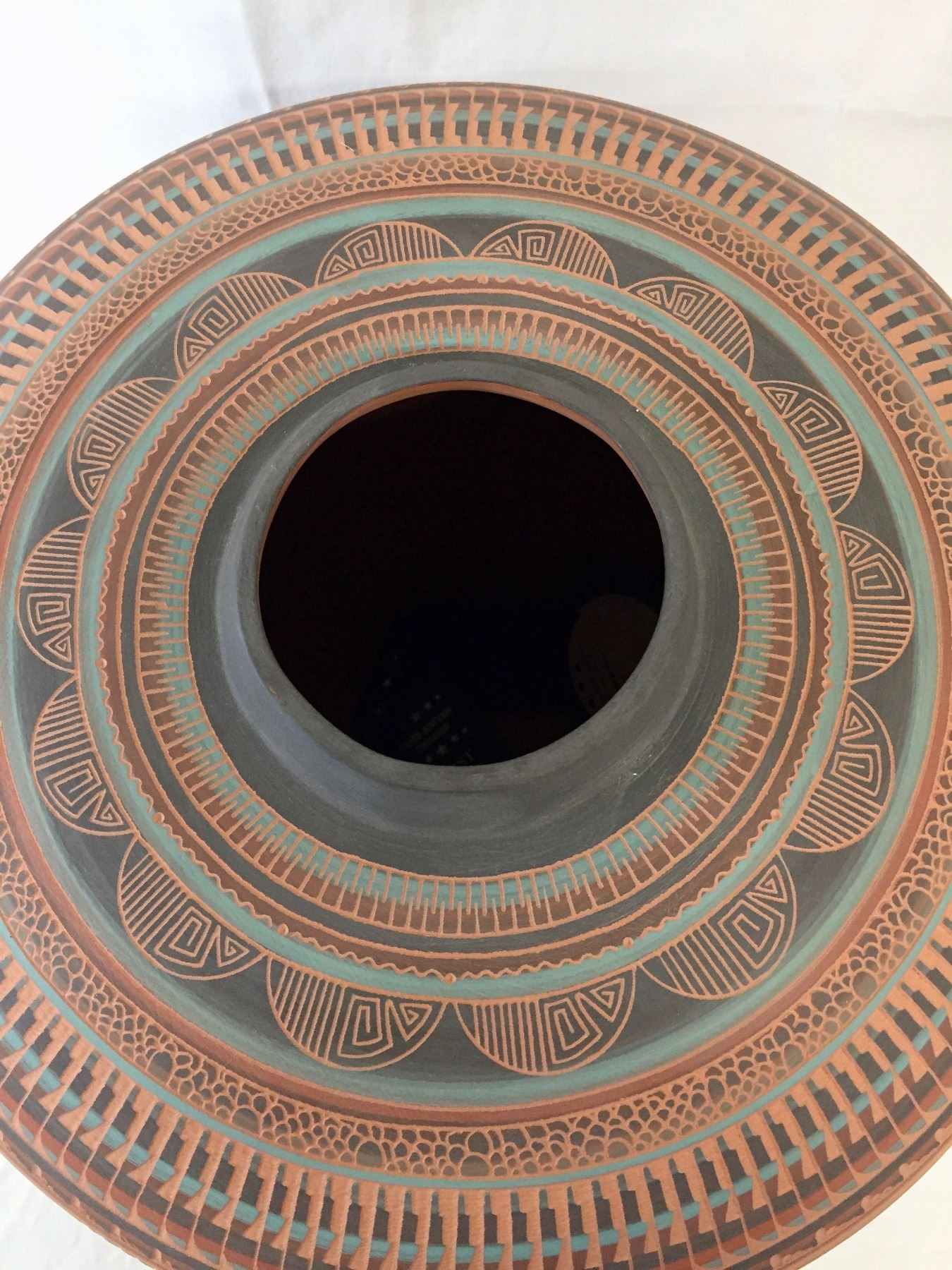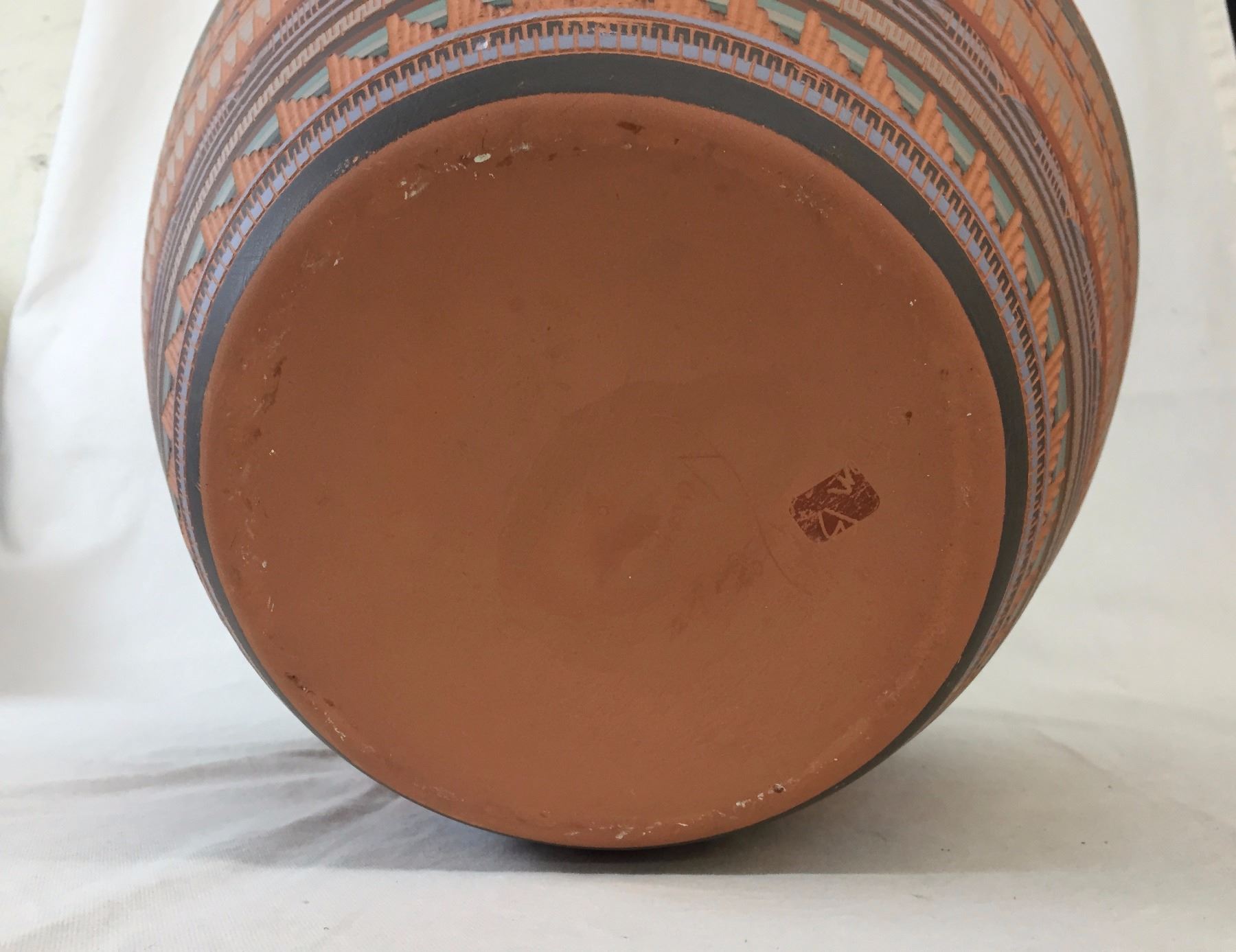 Description: A very large, etched Navajo pot with ribbons it won at a Colorado Fair. Maker: Signed, Ben Billy, Navajo. Approx. Age: 1997. Size: Measures approx. 15 1/2” w x 16” tall. Condition: Good for its age, normal wear expected. Please look closely at the pictures - they are an important part of our description. Shipping: There will be a $10 handling / packaging fee for shipping this lot. The actual cost of postage will be added on top of that.