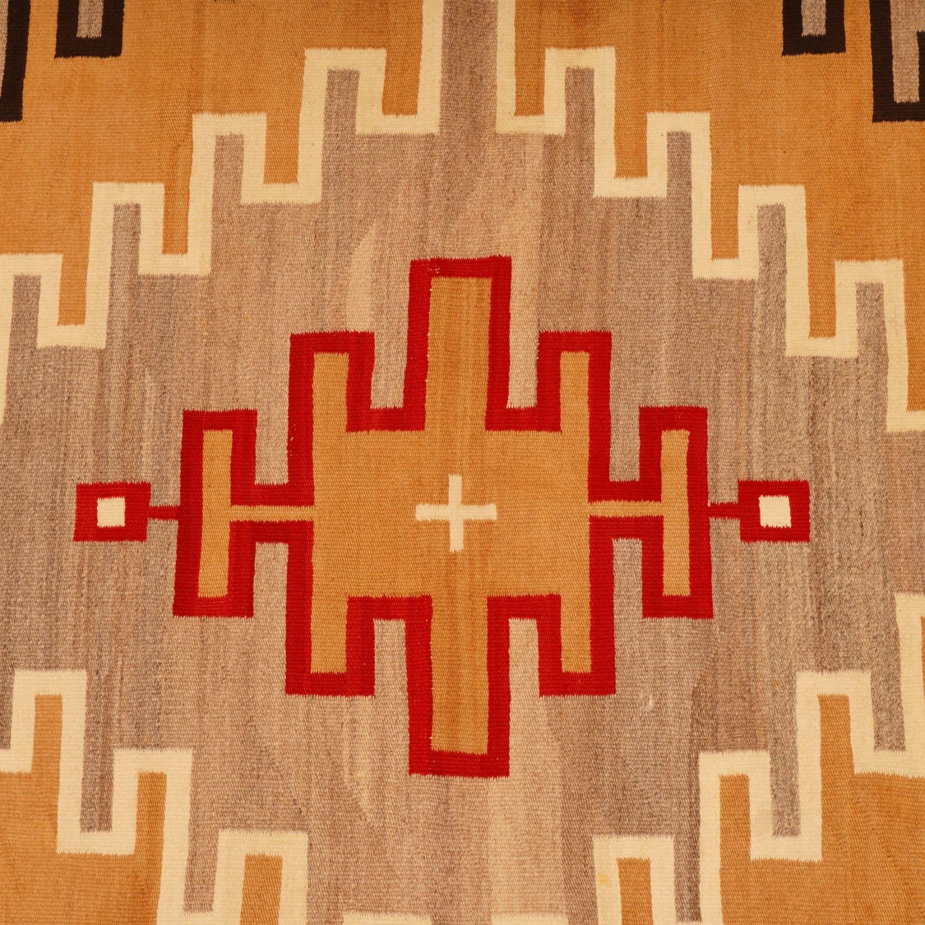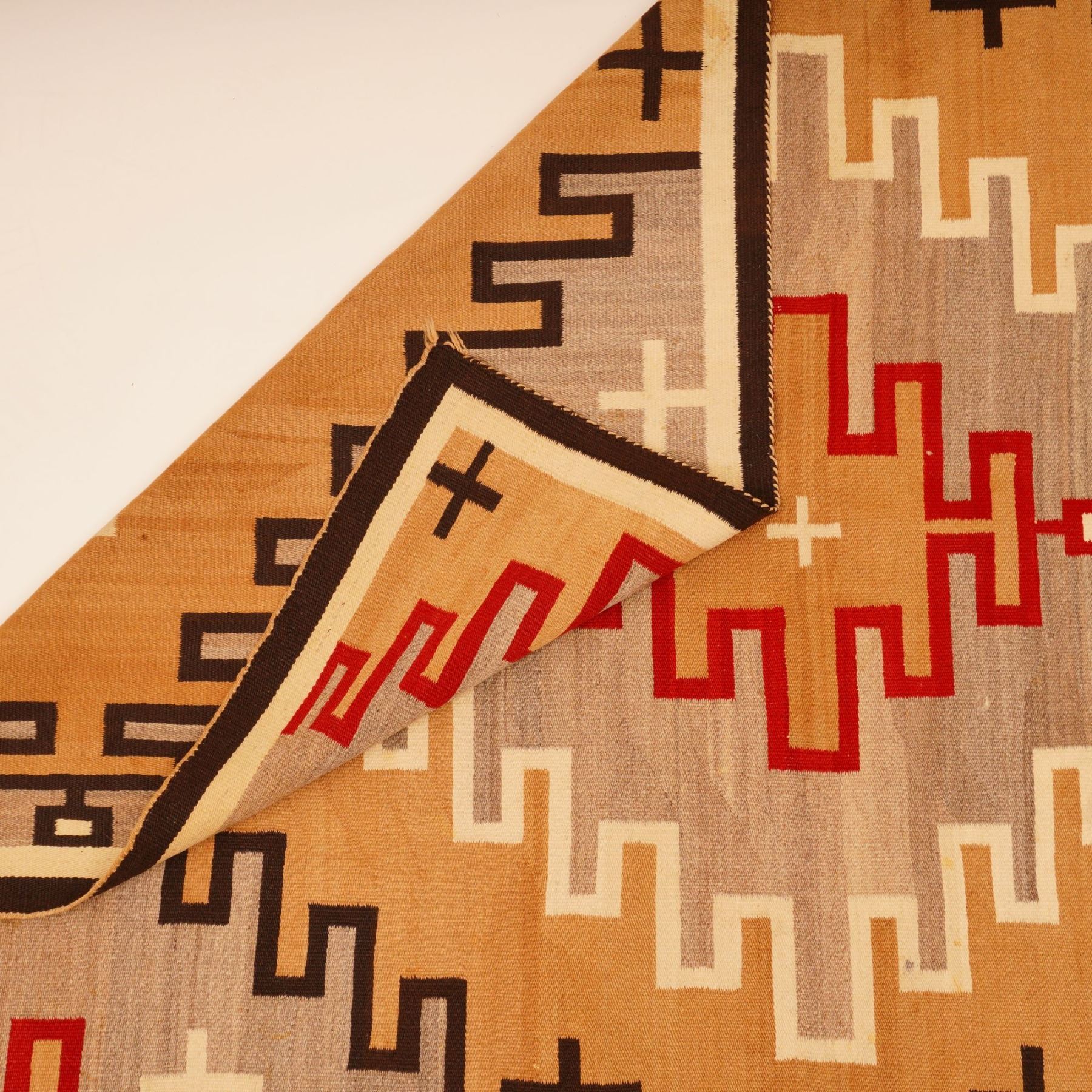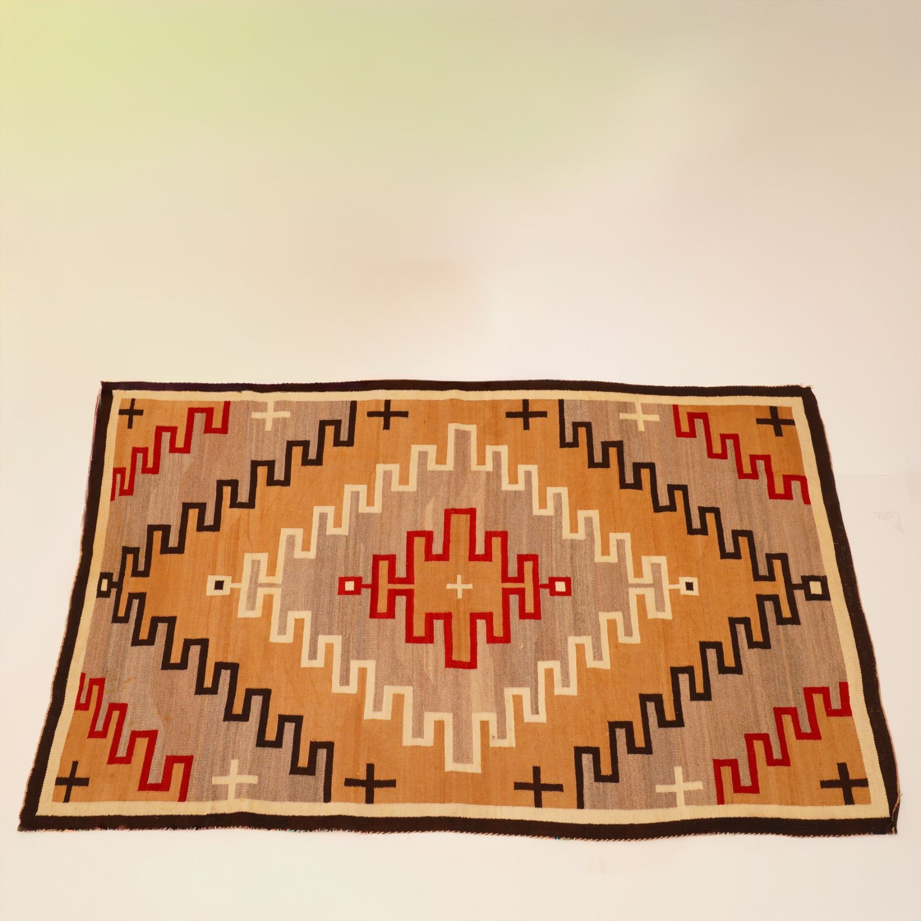 Outstanding Navajo wool rug featuring an intricate stepped-diamond pattern with central and corner cross motifs in tones of tan, beige, red, gray, and black. The geometric symmetry and finely woven wool showcase the artistry and cultural significance of traditional Navajo weaving. Reversible construction with clearly defined patterning on both sides. This large, handwoven textile exemplifies craftsmanship and balance, ideal as a floor covering or wall display.