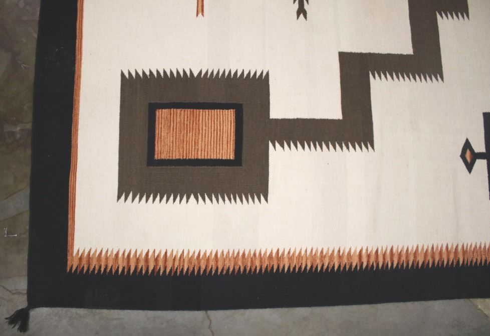 The lot features an original hand woven vertically loom wool trade rug showing an astounding size and beautiful Navajo Native American Indian Old Crystal Pattern style. The rug is from the 20th Century and was hand made by the Zapotec Native American Indians. The Zapotec are significant because 400 years ago the Spanish missionaries taught the Navajo and Zapotec how to weave. These practices are still used today in both Zapotec and Navajo Tribes. The rug shows an all 100% wool hand knotted construction with all natural dyed high quality wools and pigments in an impressive geometric pattern having a characteristic double border. The rug shows a brown, orange, red and black on white or cream field. The rug is in good condition with no visible major damage with soft wool, a very tight original weave and no fraying. Measures overall 11 foot 11 ½ inches by 9 foot 1 ½ inches. This is truly one of the largest and most impressive Native American rugs we have ever offered for sale.