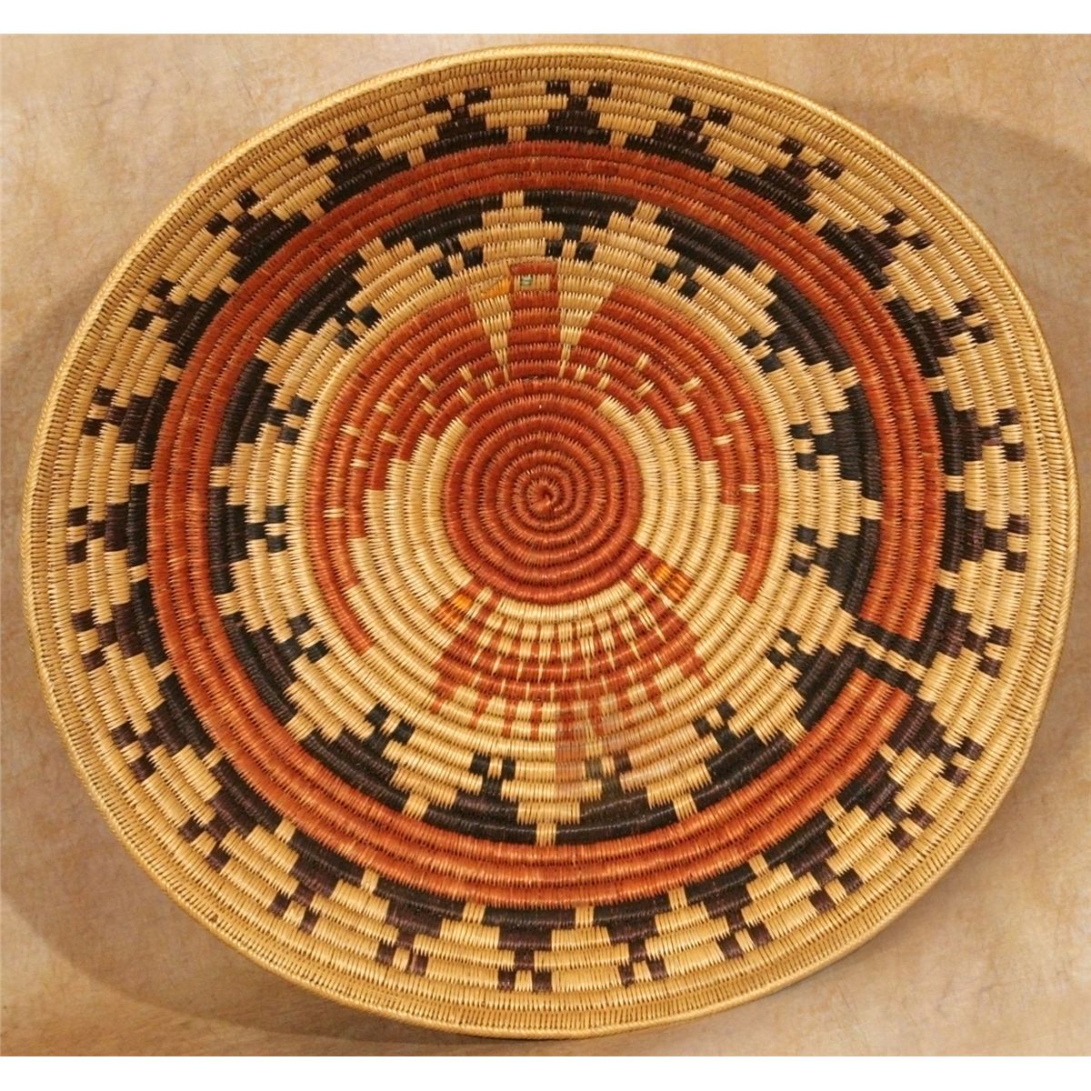 Large Navajo Pictorial Basketry Tray. 30.5" diameter. Coiled polychromatic eagle design inside star elements. Circa 1950s. Very showy! Provenance: Collection of Dr. Delwin and Karen Bokelman, PA.
