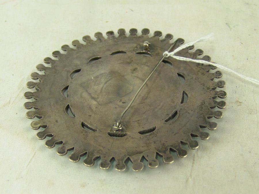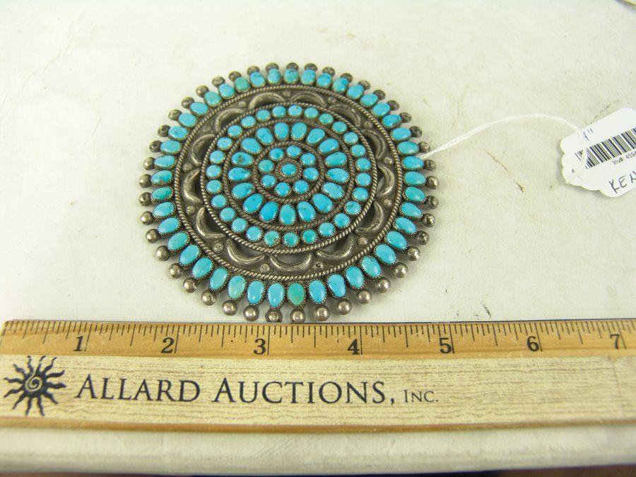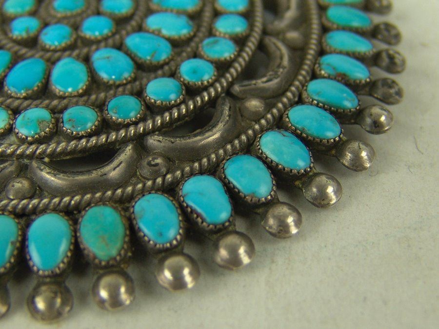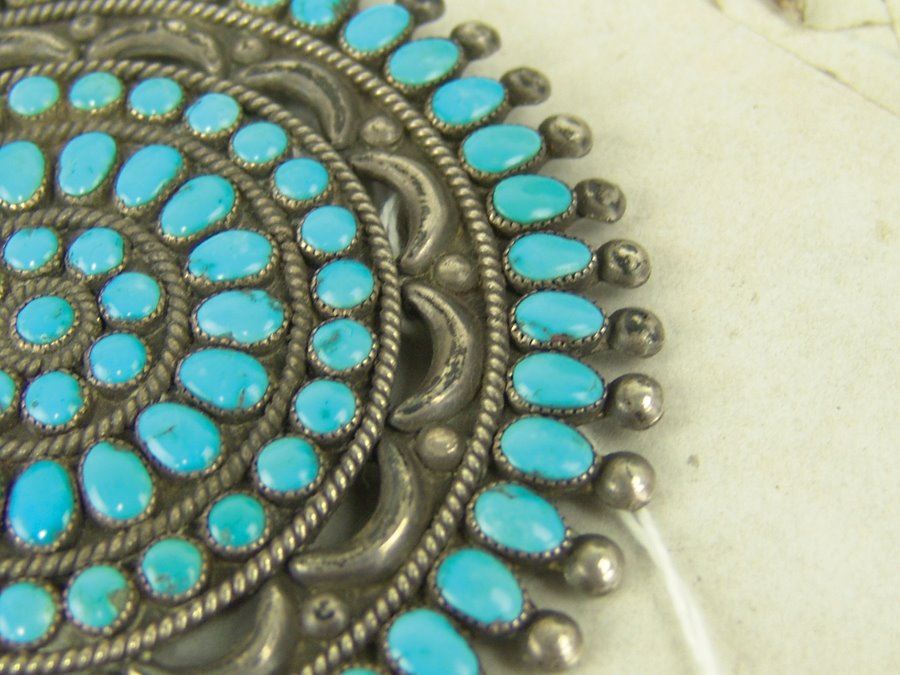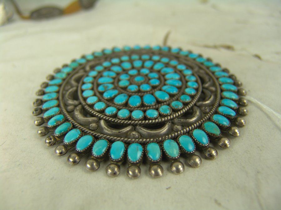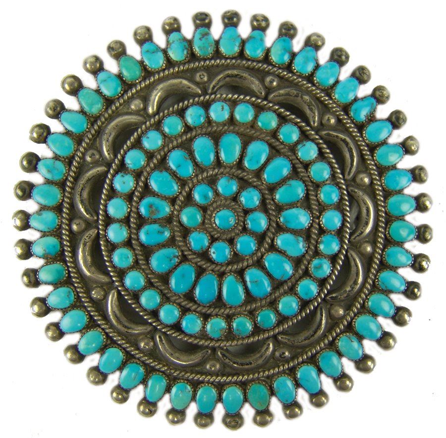 Large, round, classic cluster design turquoise and silver blouse/sash pin with 96 matching, hand-cut, round and oval stones. Very good condition, nice patina.,,4"