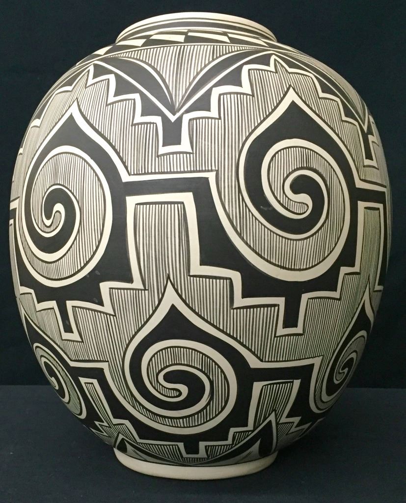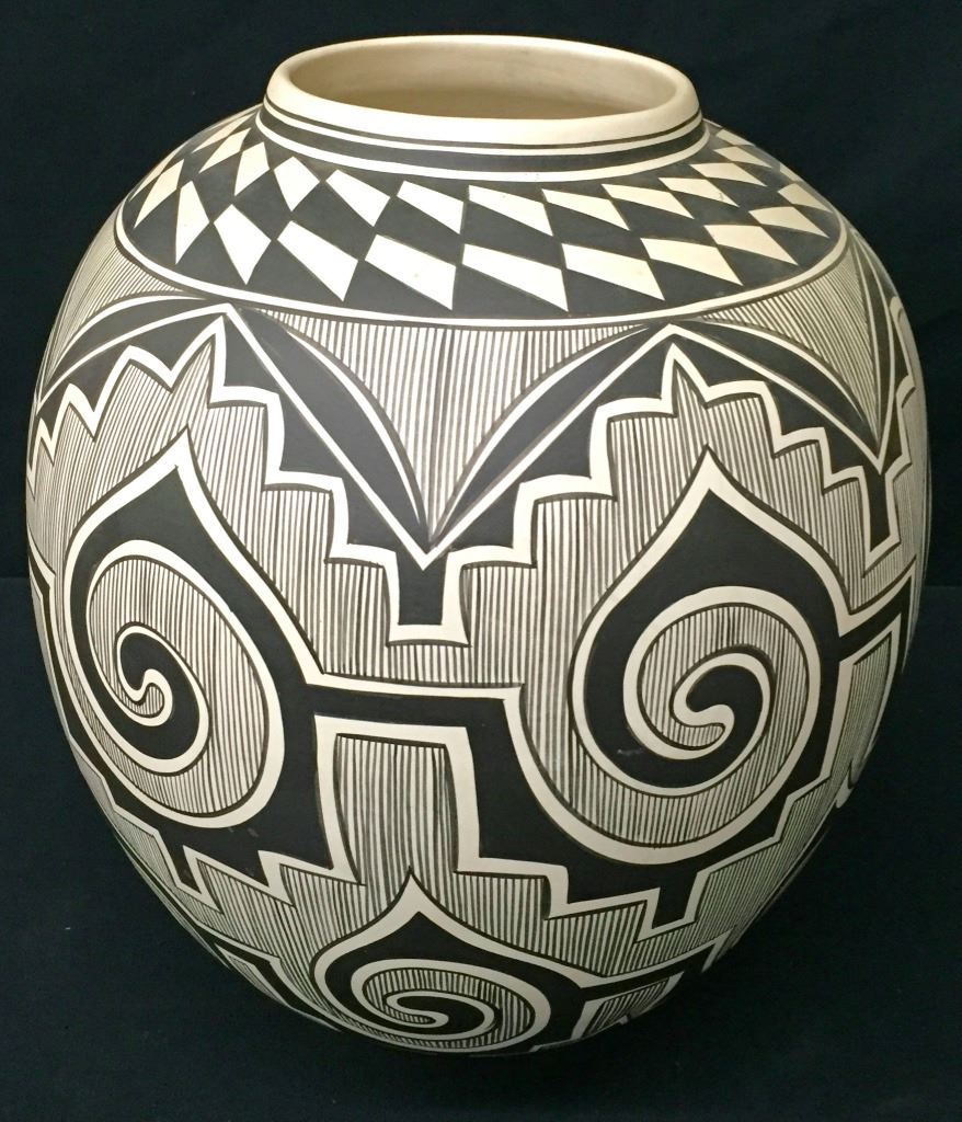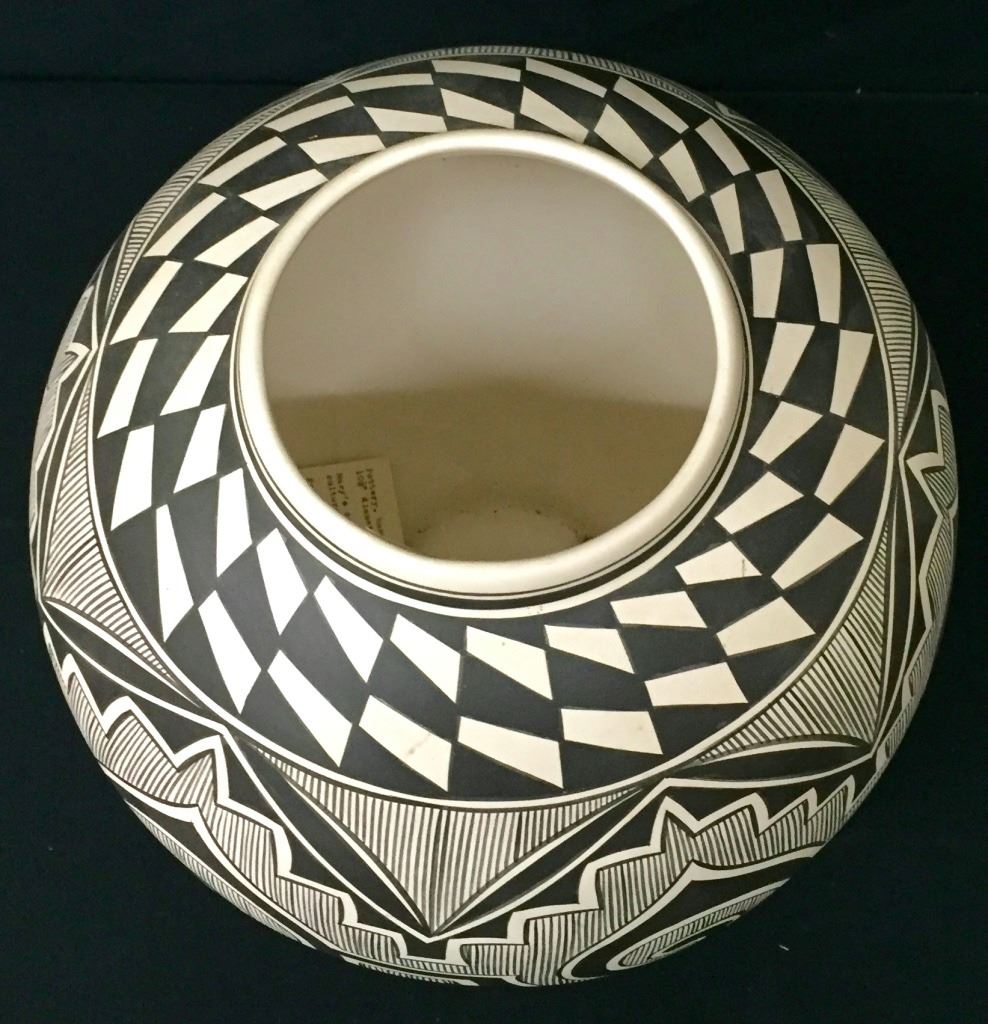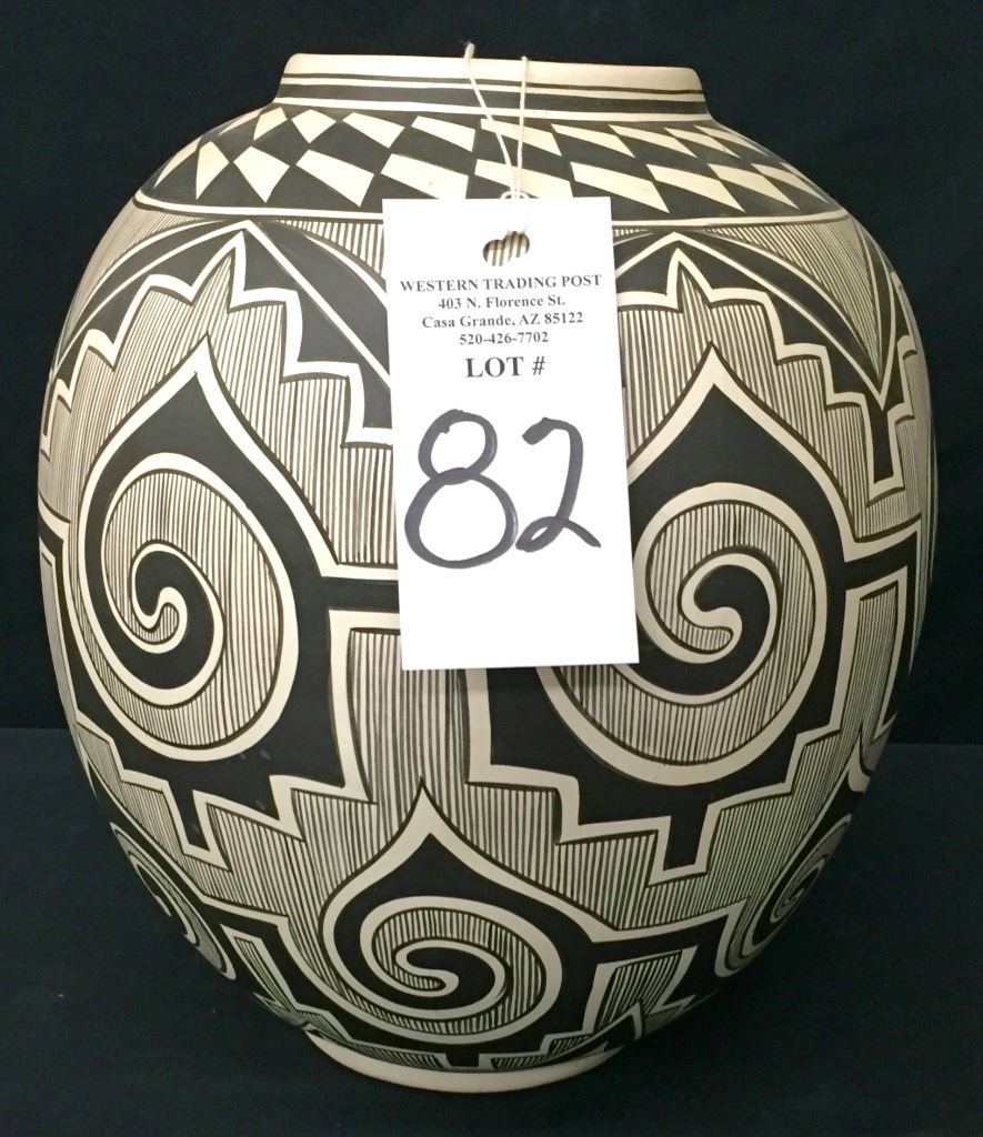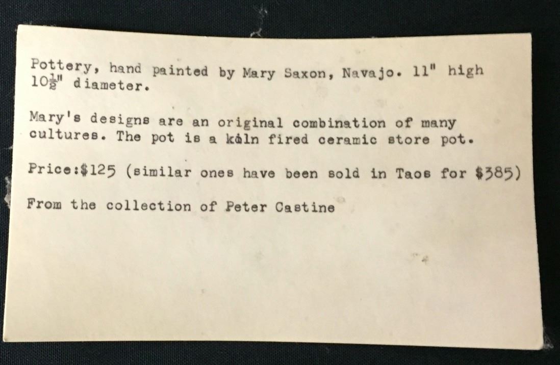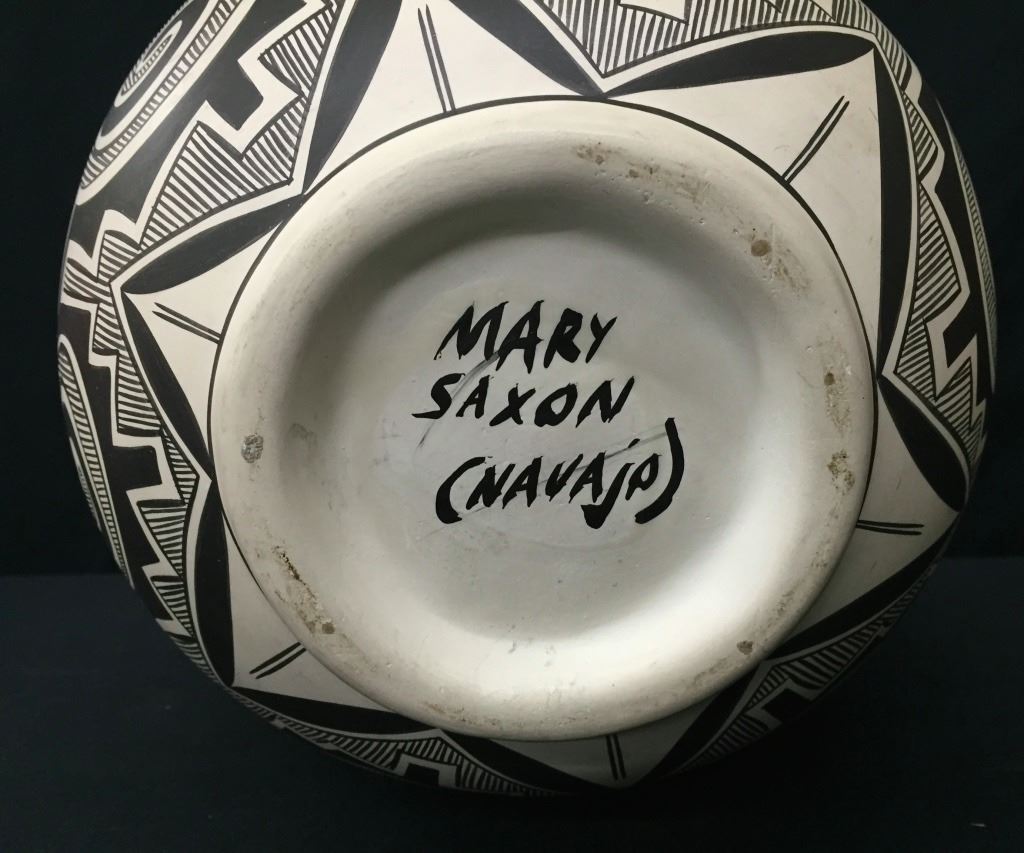 This large Navajo, hand-painted, pot is signed, Mary Saxon. It is 12” tall by 10” across. Very good condition. Please look closely at the pics as they are an important part of our description. Shipping: There will be a $7 handling / packaging fee for shipping this lot. The actual cost of postage will be added on top of that.