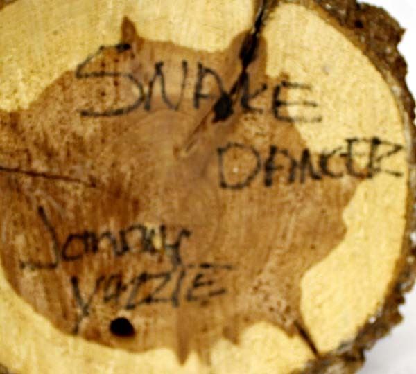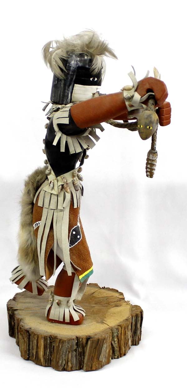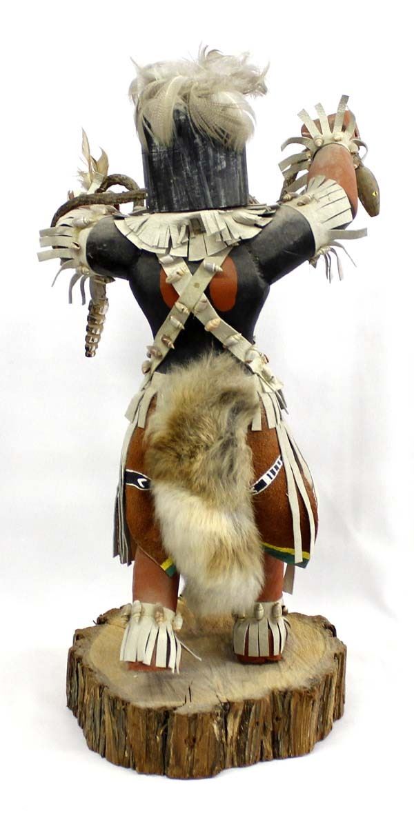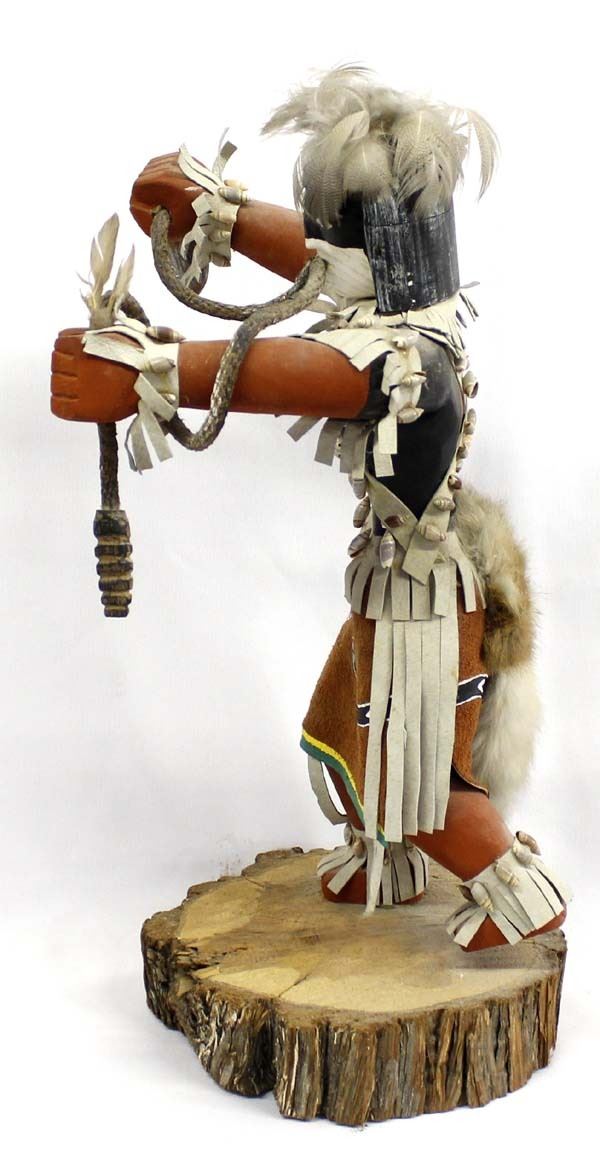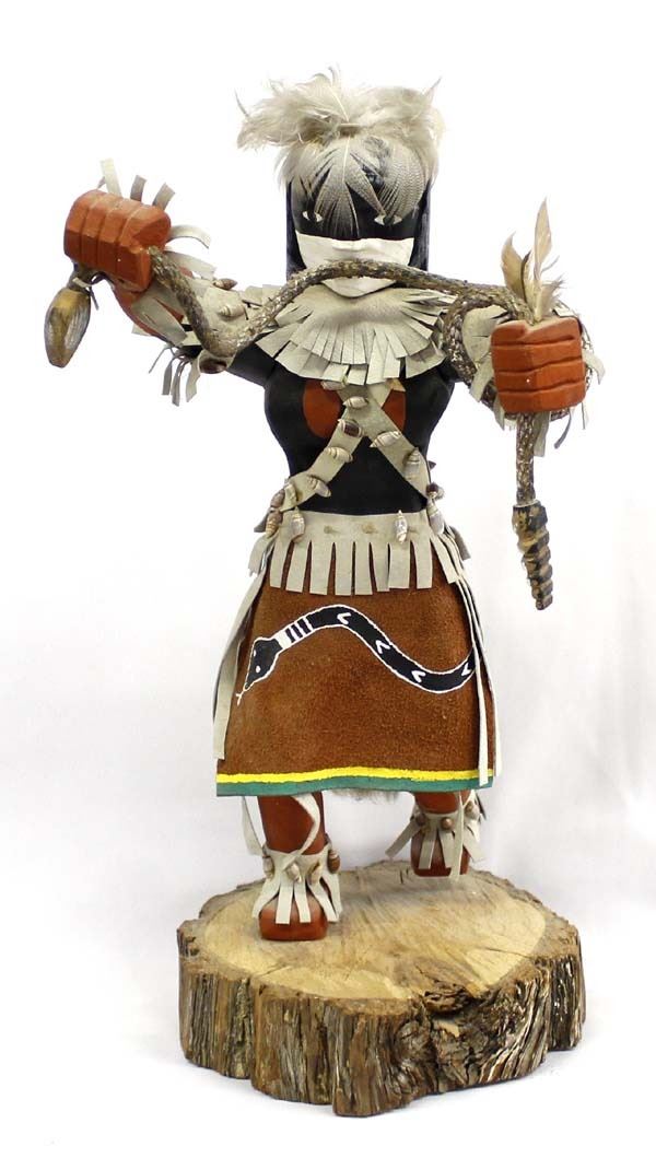 Large Native American Navajo Snake Dancer Kachina by Jonny Yazzie, measures 18'' x 9'' x 9'', embellished with leather, rabbit fur, feathers, shells, and rope, hand painted leather, missing a few shells