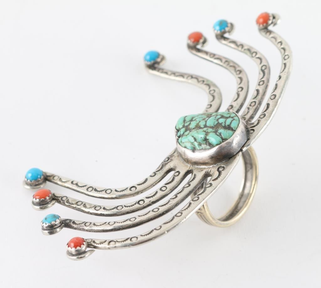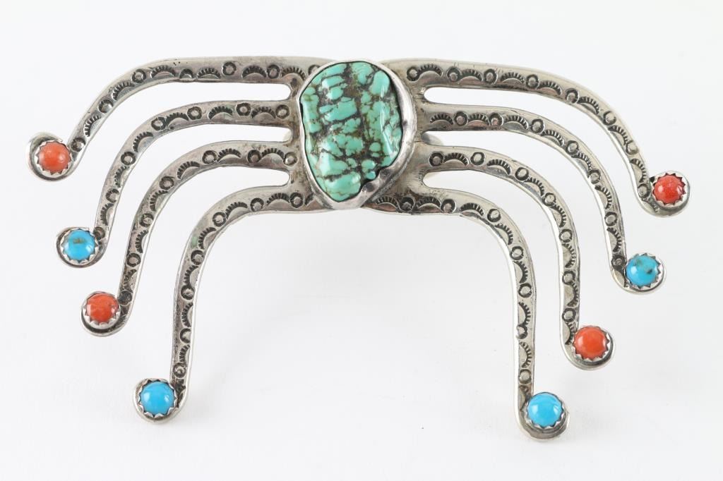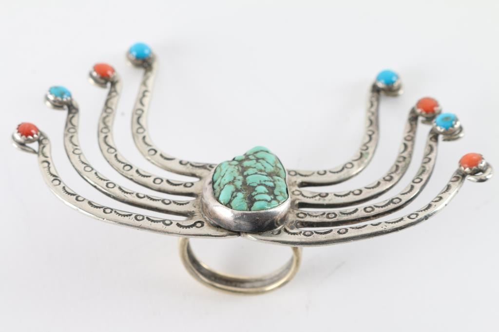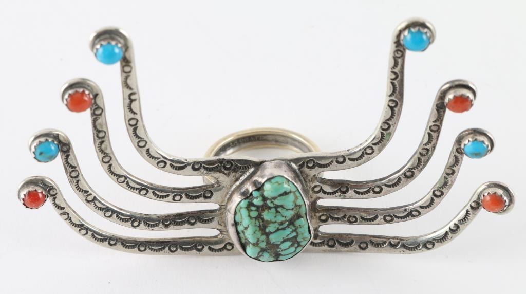 With Center Turquoise Stone With Coral Accents, Unsigned.