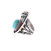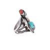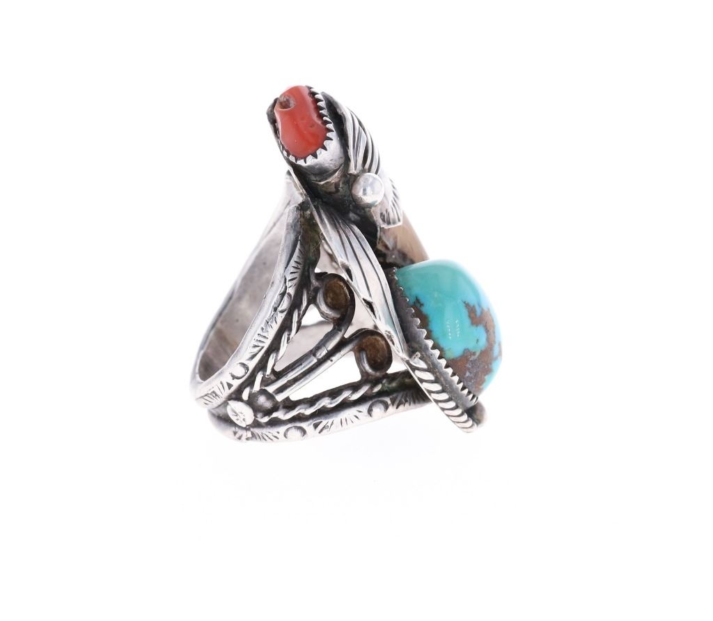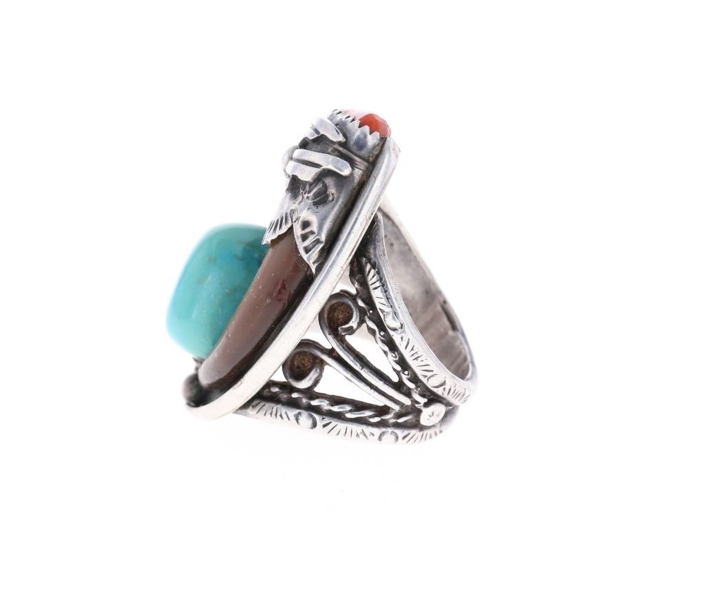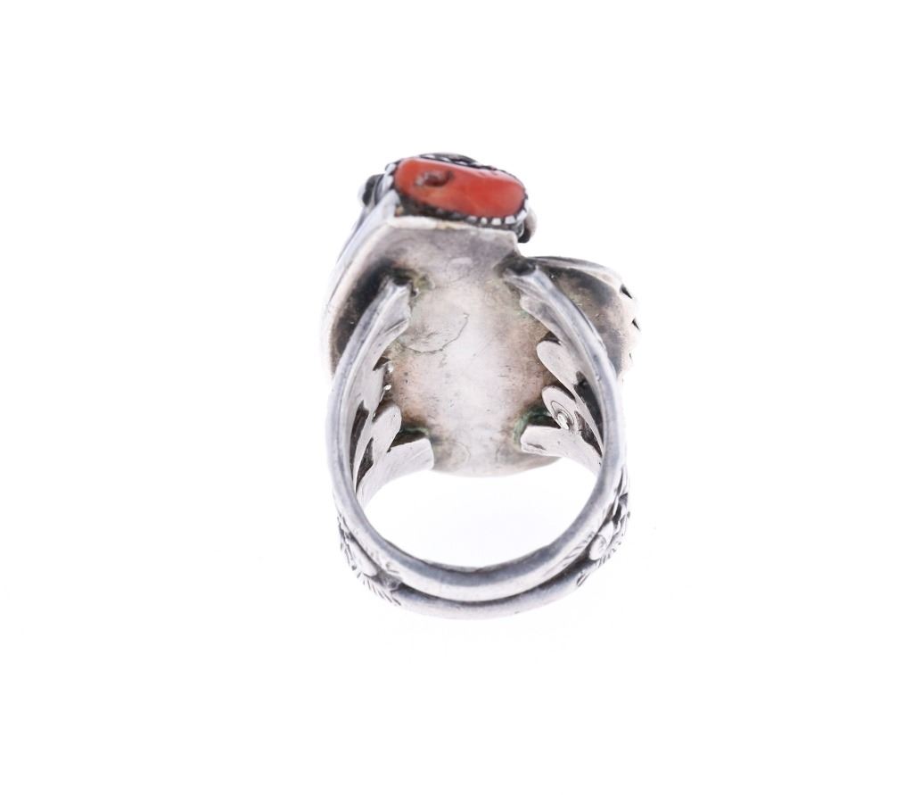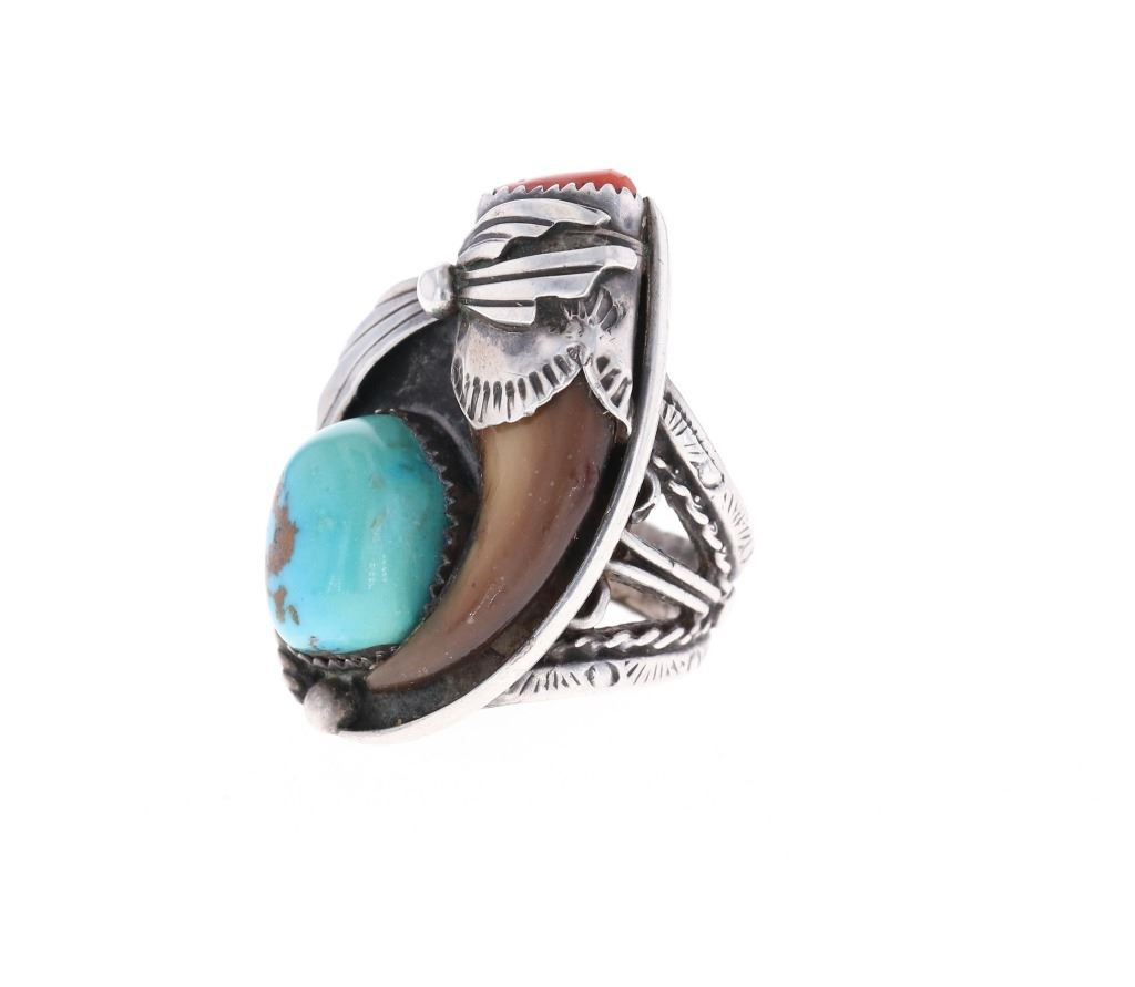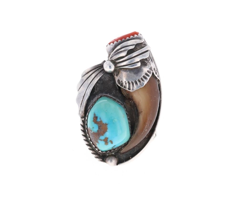 Featured in this lot is this Navajo sterling silver bear claw and multi stone ring. The ring features a wonderfully and professionally crafted sterling silver ring with a bear claw inlaid into the face of the ring with a blue gem turquoise nugget cabochon set into the bottom of the ring with a red branch coral cabochon set into the top of the claw. The condition of this ring is good with no obvious signs of damage and in good overall condition. The measurements of this ring is 1 1/4" x 1 1/2" x 1" and the ring size is US 9 1/4. The collective weight of this ring are 20.4g.