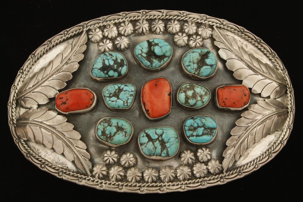 Traditional leaf design with turquoise, ox blood, and coral. Hallmarked. Approx 7" wide x 4" tall.