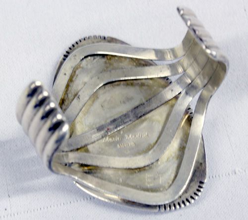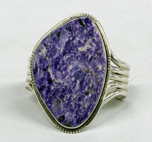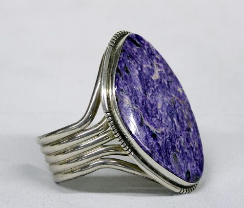 Large Navajo Sterling Charoite Bracelet - Mario Madrid, incredibly large charoite cab set in sterling silver, this stunning deep purple cab measures 2.5'' x 1 5/8'' and is set in a 5 band silver bracelet 6.5'' inside measurement which includes the opening x 2.75''W, hand stamped accented bezel completes this piece, Charoite is a rare silicate mineral, first described in 1978 and named for the Chara River. It has been reported only from the Sakha Republic, Yakutia, Siberia, Russia
