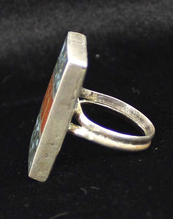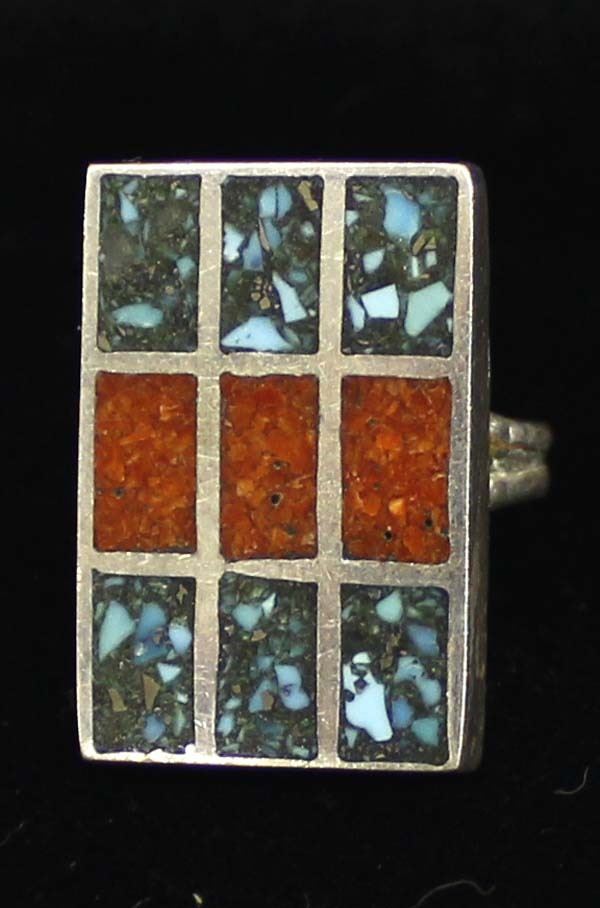 Large Native American Navajo Sterling Turquoise and Coral Chip Inlay Ring, Size 6.5, measures 1.25''L x 1''W