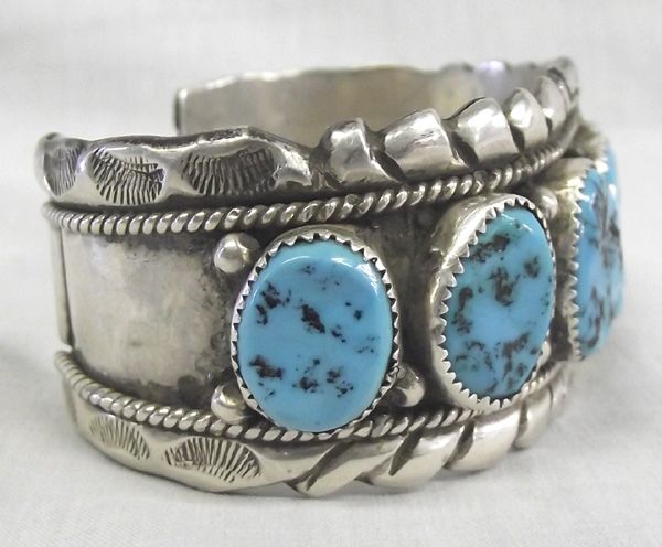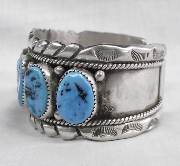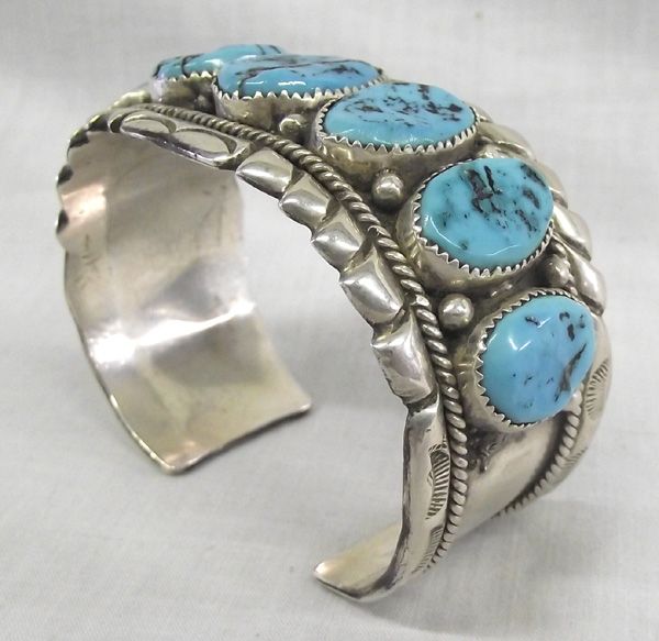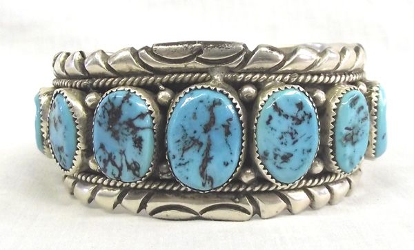 Navajo Sterling Turquoise Cuff Bracelet, inside measures 7.5'' which includes opening x 1 5/8''W, stamped sterling, stunning bracelet featuring 7 turquoise nuggets with nice black matrix, hand worked and stamping, rope edging, serrated bezel, definitely a work of art
