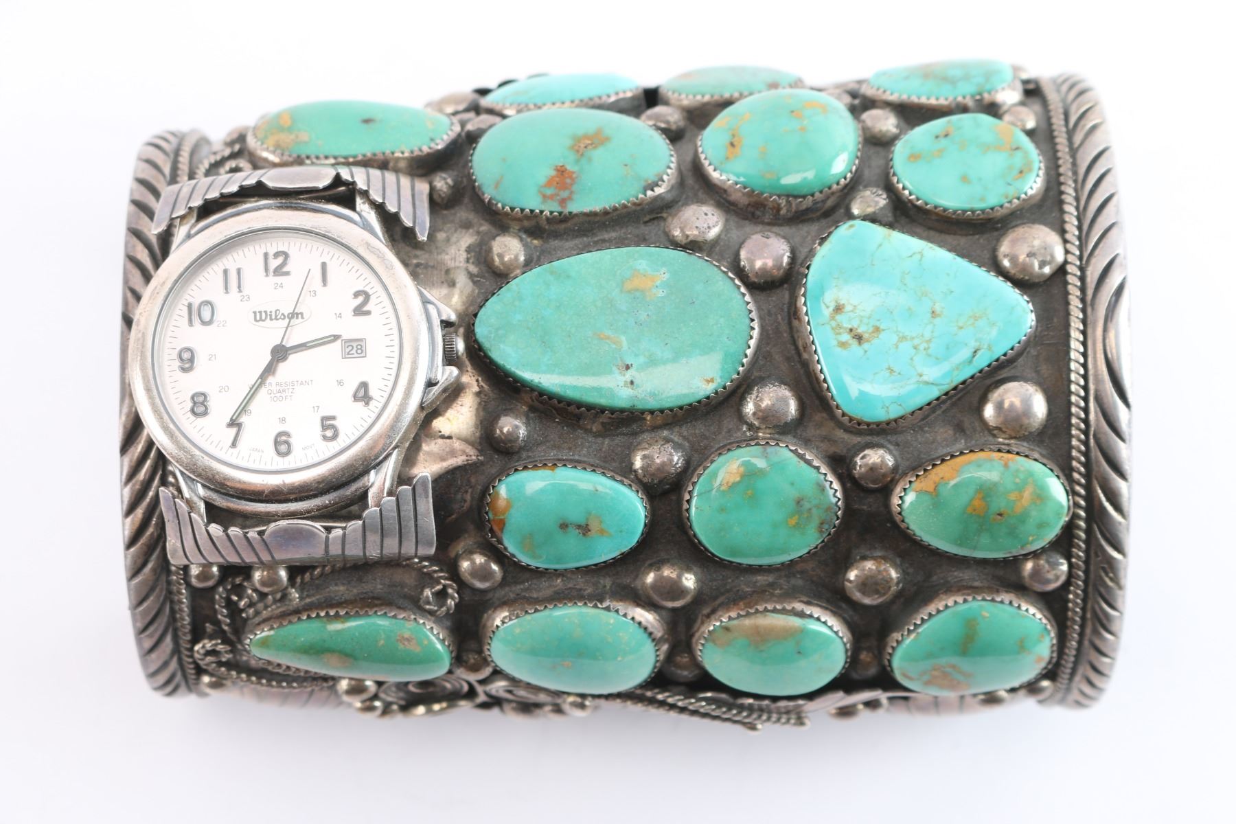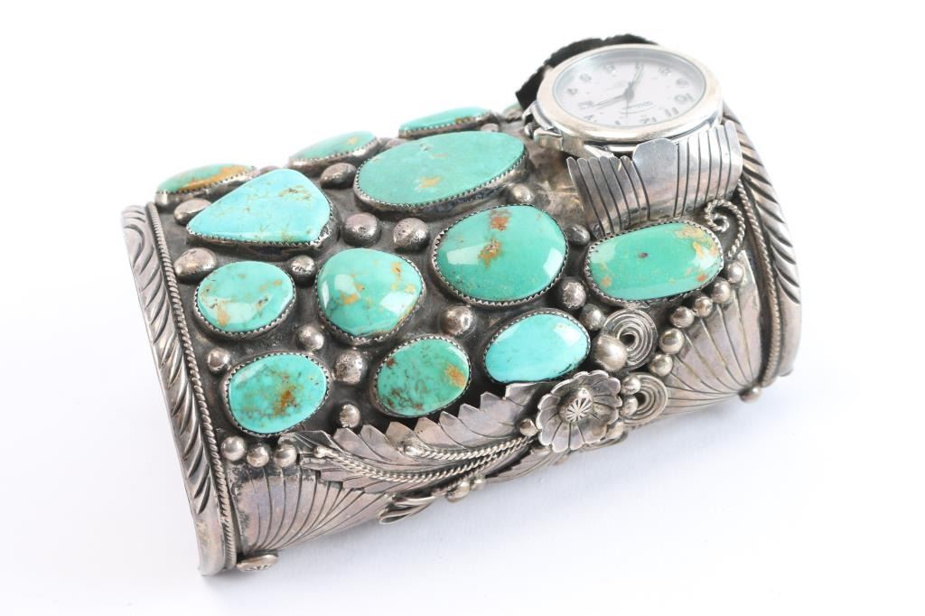 16 turquoise stones mounted in heavy sterling silver, maker marked GR with fancy stamp motif inside. Includes watch in need of battery. Measures 10.5" at widest to 9.5" at narrowest including gaps.