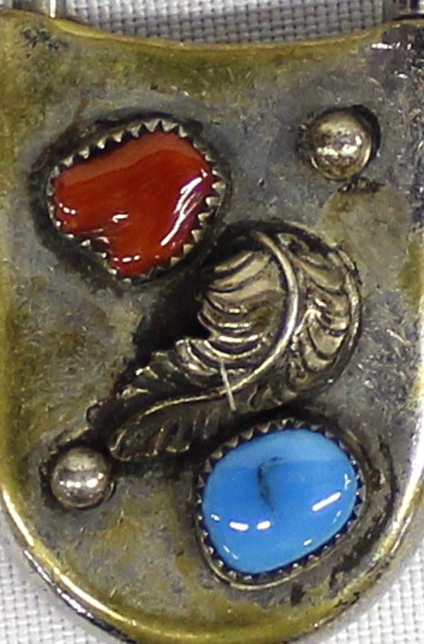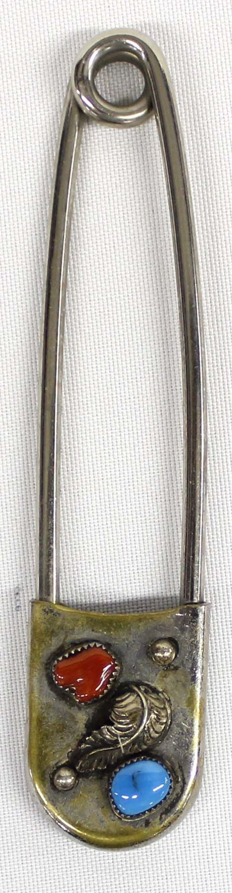 Large Native American Navajo Turquoise Coral Safety Pin Key Ring, measures 5'' x 1'' and is hallmarked