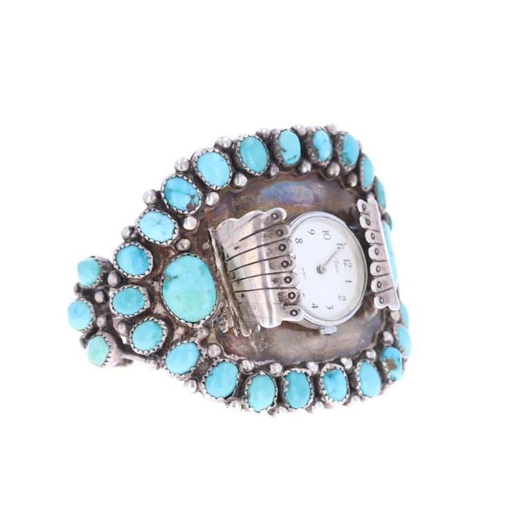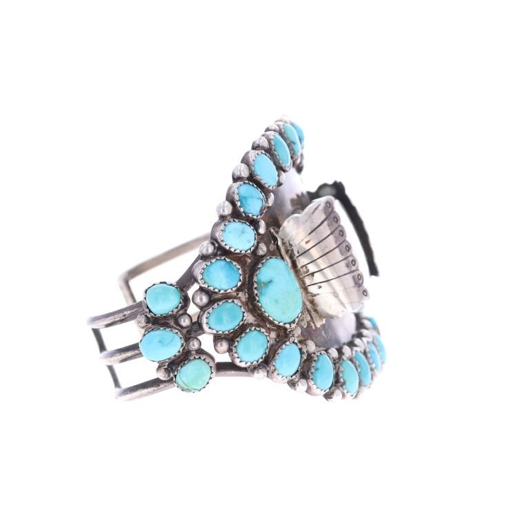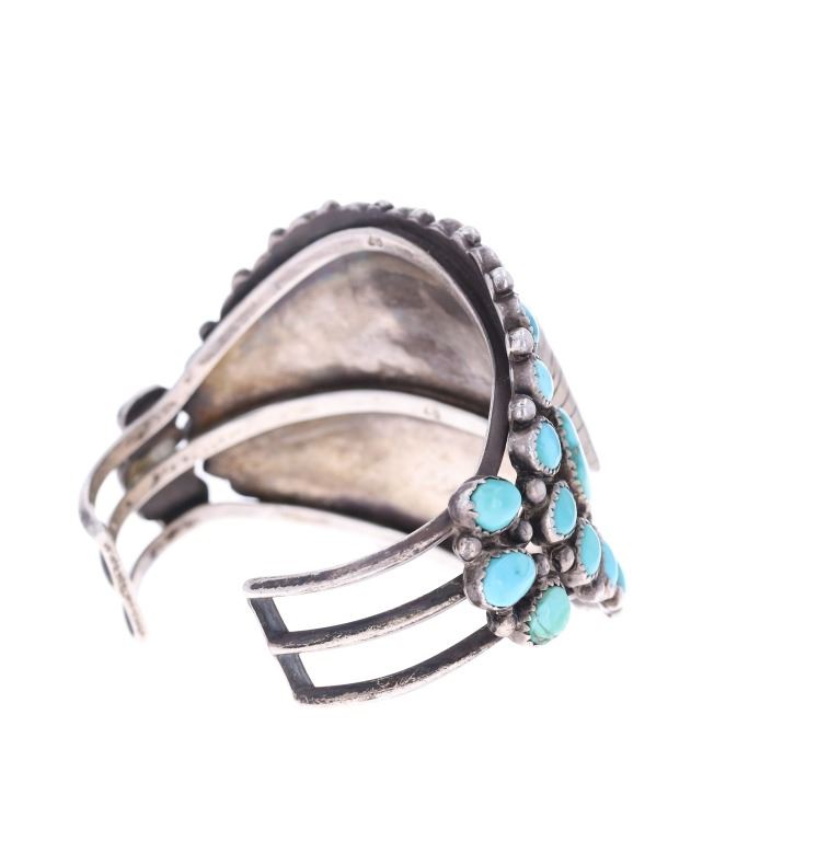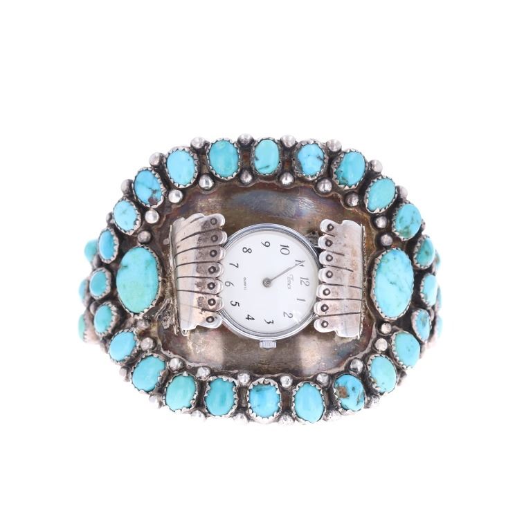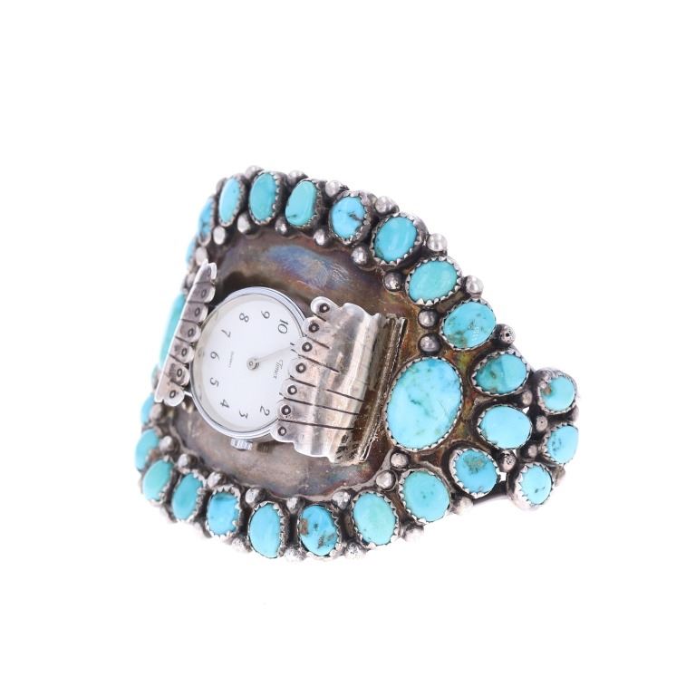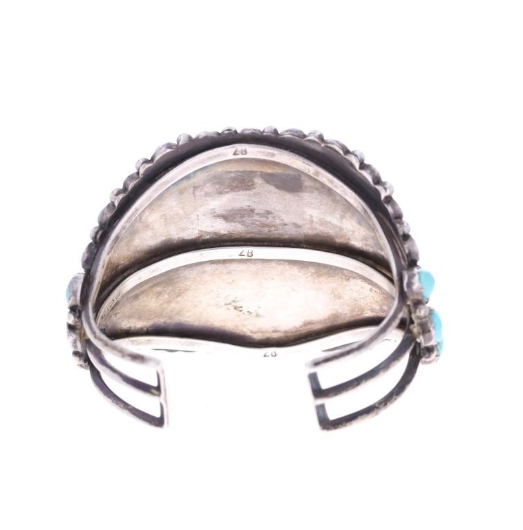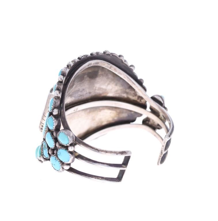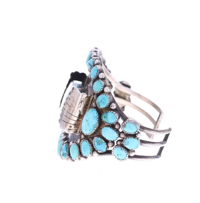 Featured in this lot is this sterling silver turquoise watchband from Navajo artist Zeta Begay in a classic petit point design. The bracelet features a wonderfully and professionally crafted sterling silver and turquoise construction that shows a very large band with a split frame and a face that is lined with graduated Cripple Creek turquoise cabochon with a variety fo coloration of light blue to dark blue with some green hue and a matrix. The bracelet is marked on the underside of the bracelet as follows: ZB. The condition of this Navajo watch band is good with no obvious signs of damage and shows good overall condition. The measurements of this watch band is 2 1/4" x 3" x 2 3/8" and shows a circumference of 4 5/8". The collective weight of this watchband is 81.6g.