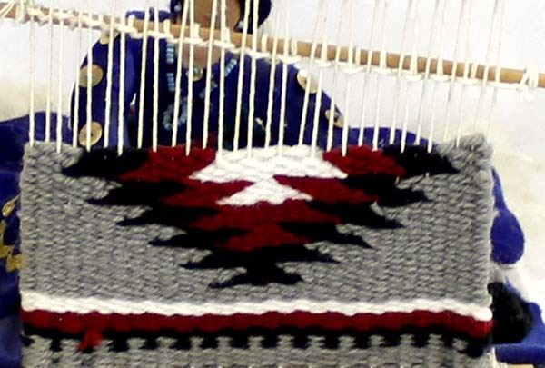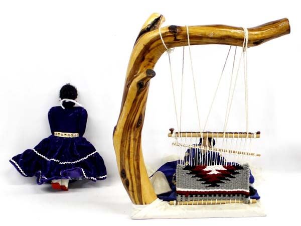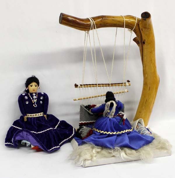 Large Native American Navajo Weaver Doll and 1 Navajo Cloth Doll, both wearing traditional dress, embellished with sequins and beaded jewelry, weaver's loom made out of cedar wood, measures 16'' x 10'' x 8''