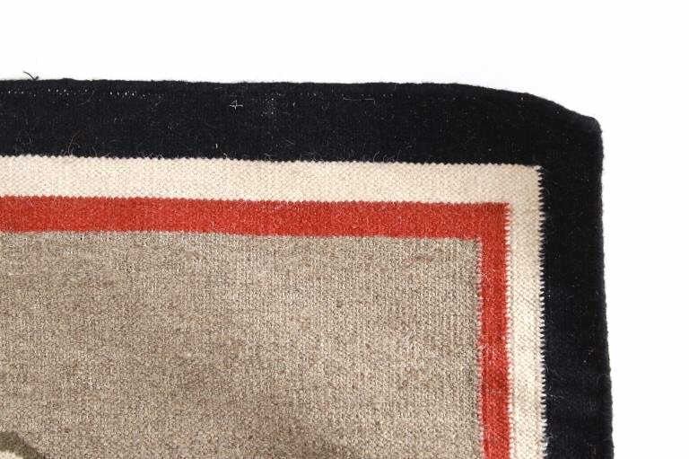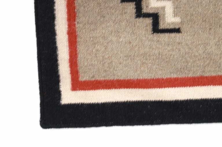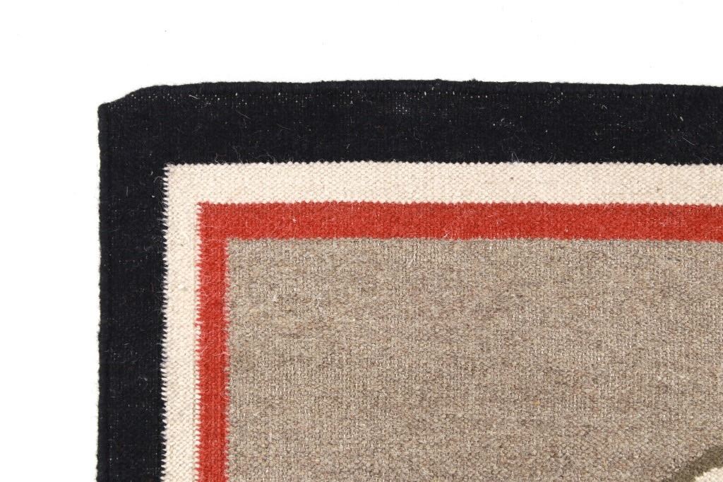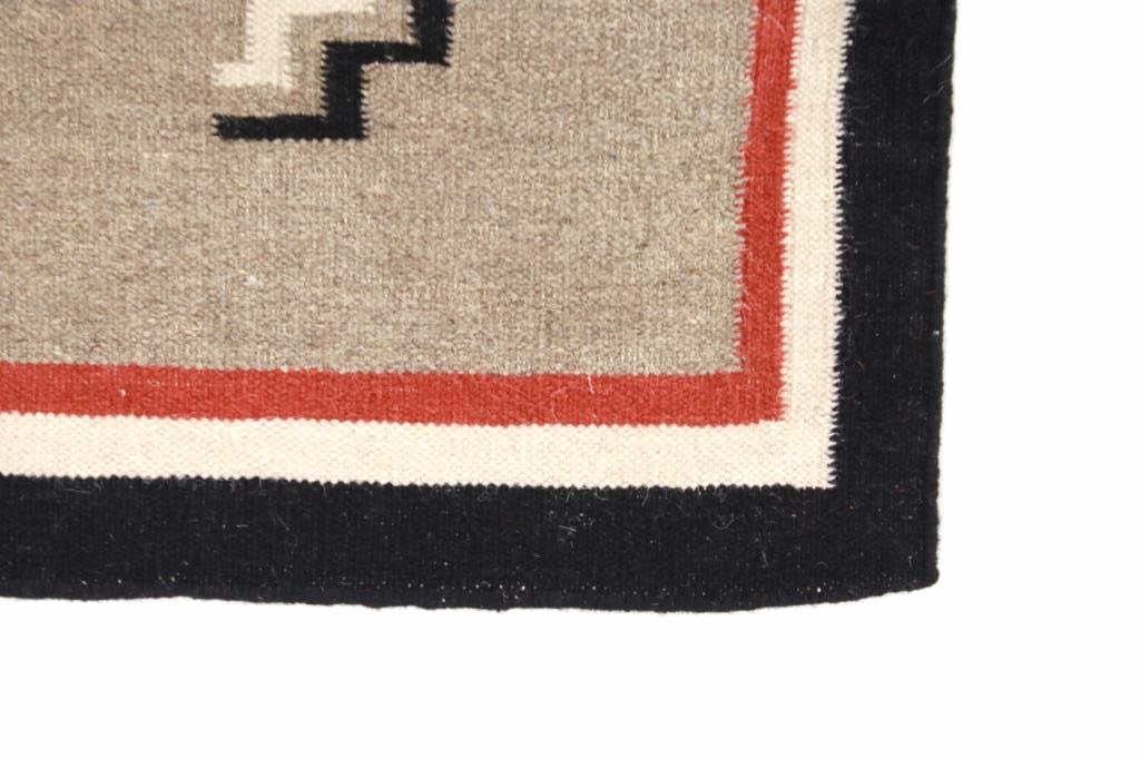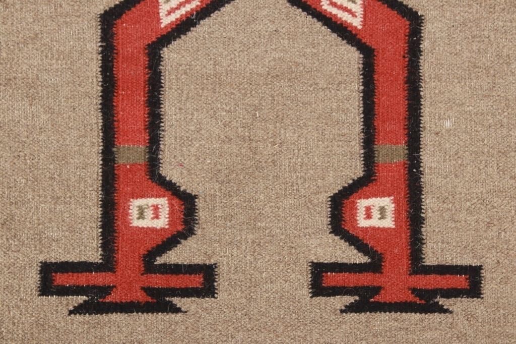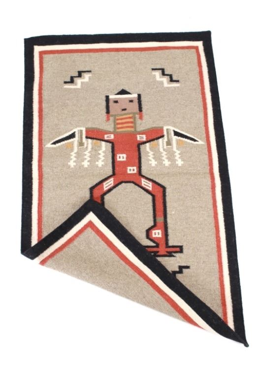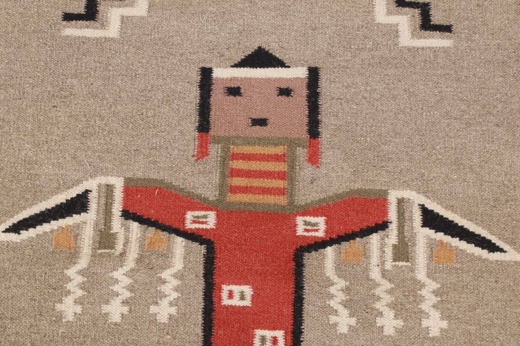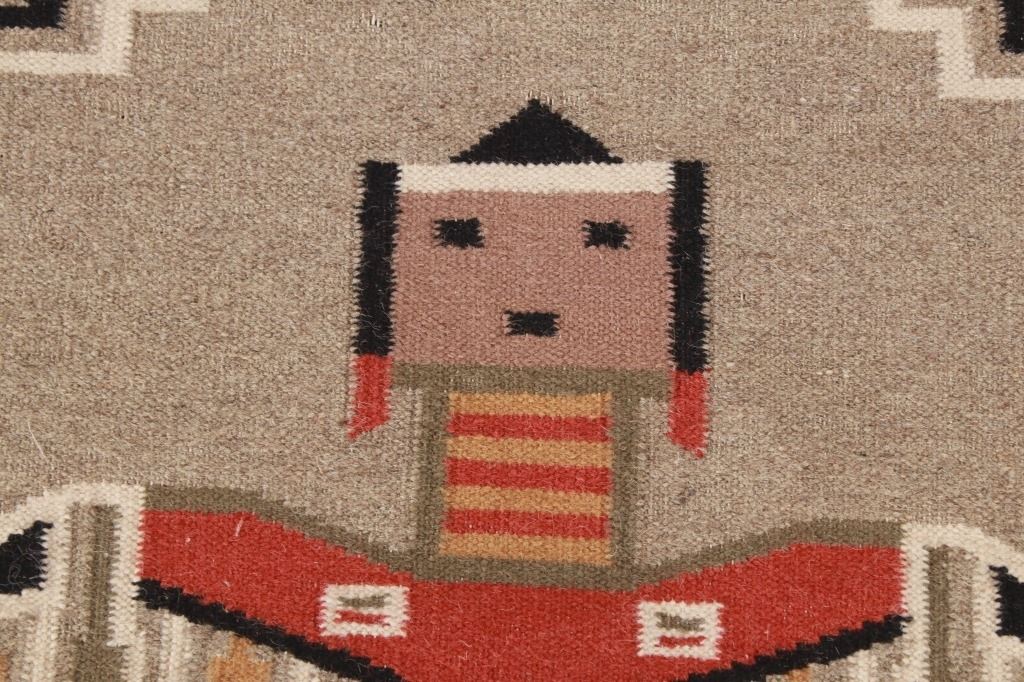 Featured in this lot is this Navajo Yei Be Chei style custom woven rug. The rug features a wonderfully and professionally crafted wool blend construction that shows the likeness or embodied spirit of a Yei Be Chei figural design that shows a clothed Yei figure set to a red field and shows a black and off white border with an inner layer of salmon brown and shows a light grey field with the Yei figural showing black, brown, off white, green, gold, and salmon brown coloration. The condition of this Navajo stylized rug is good with only slight wear to the weave throughout the rug but otherwise shows a good overall condition. The measurements of this rug is 60" x 36 1/2". The thread count is 64 threads per square inch. Rug done in the style of Navajo, but not made by a Navajo artist.