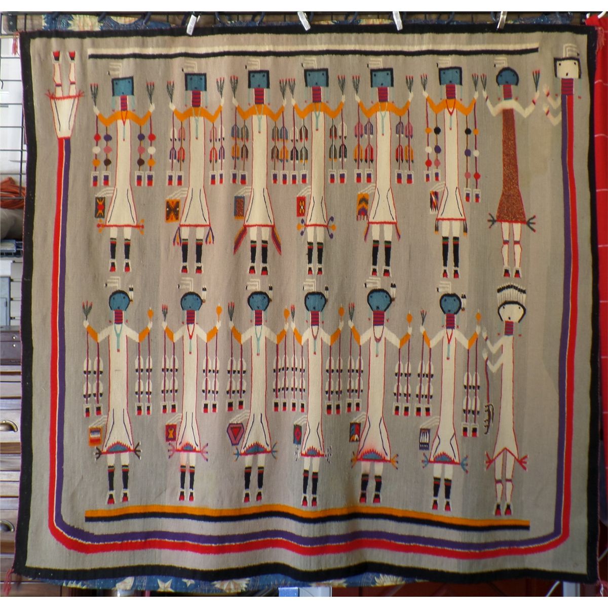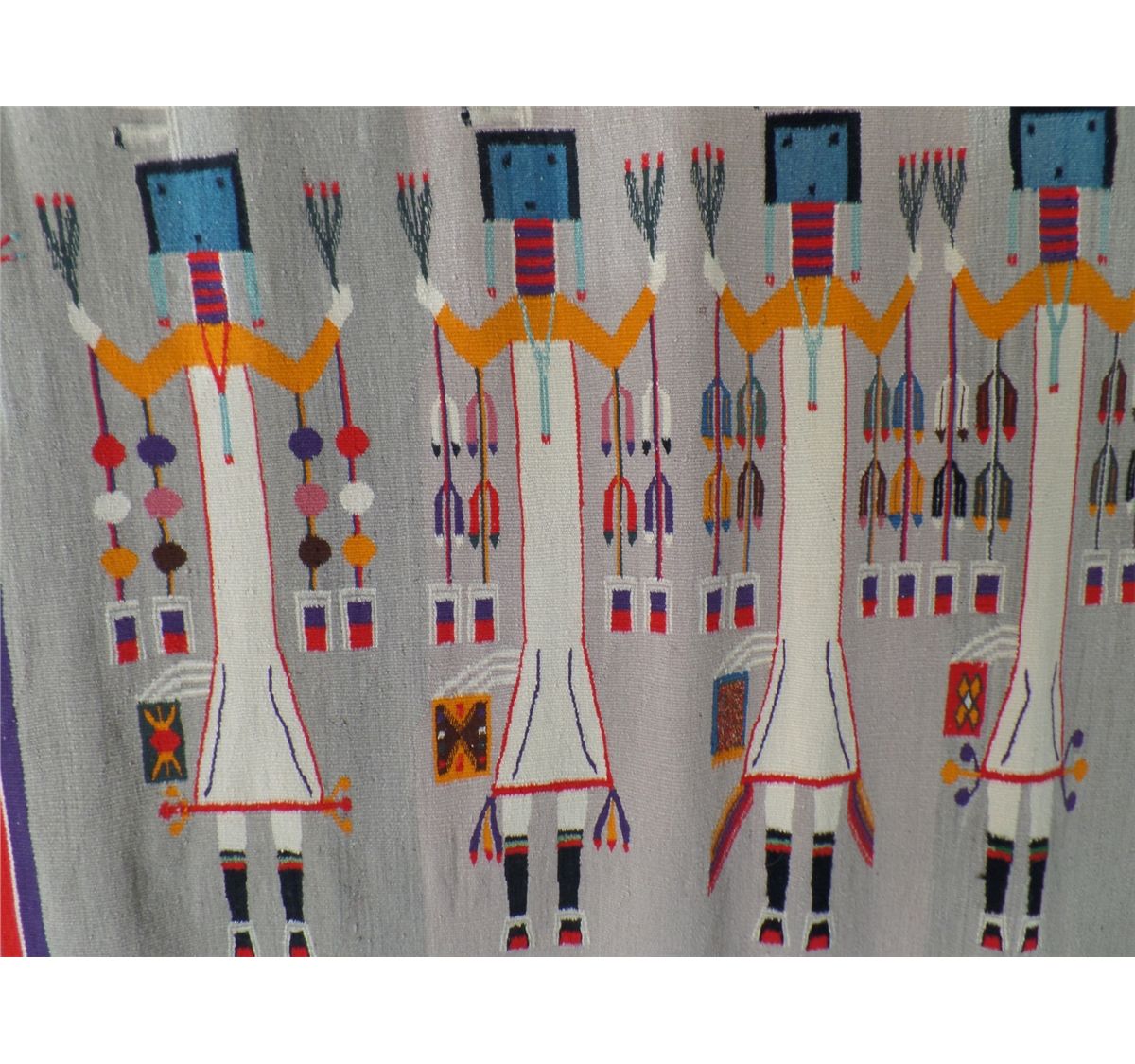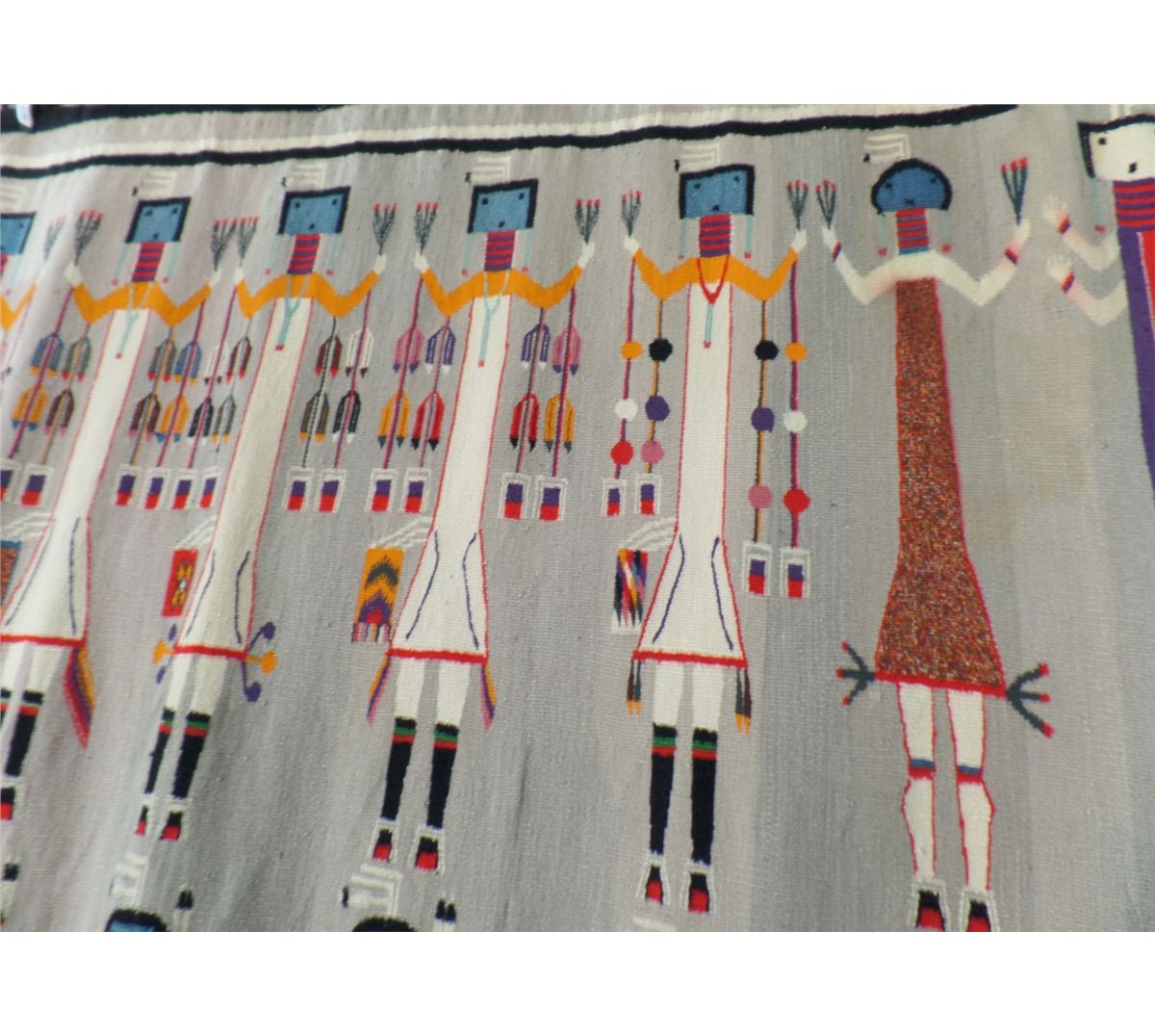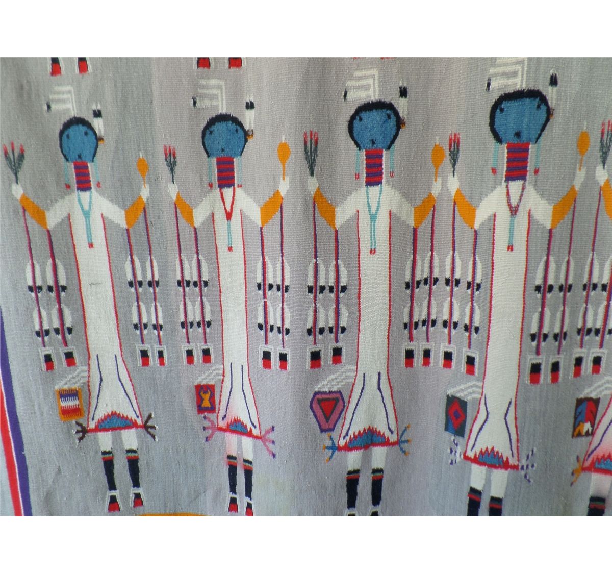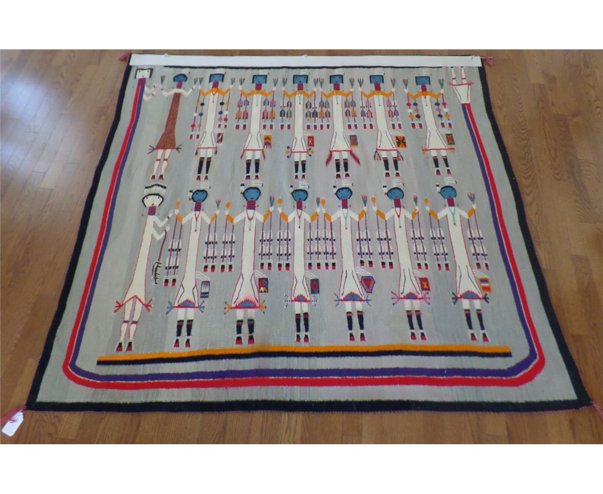 Large Navajo Yei Tapestry Weaving with 15 Figures. Circa 1940. Item measures 6' x 5' 8.5". Colors include white, blue, red, orange, black, green, turquoise, and gray. Condition: Couple small stains on reverse side and some bleeding. The reverse side shows the rod which was used to hang on a wall. The backing for the rod has 3 holes in it, but the rug is unaffected. Very Good. See All Images. Shipping: $40.