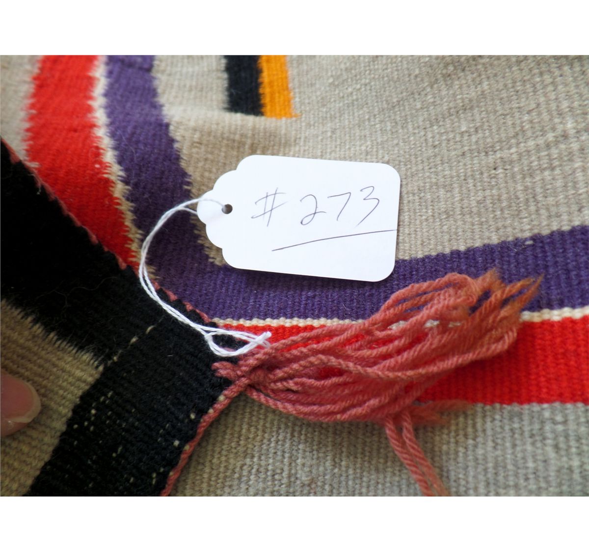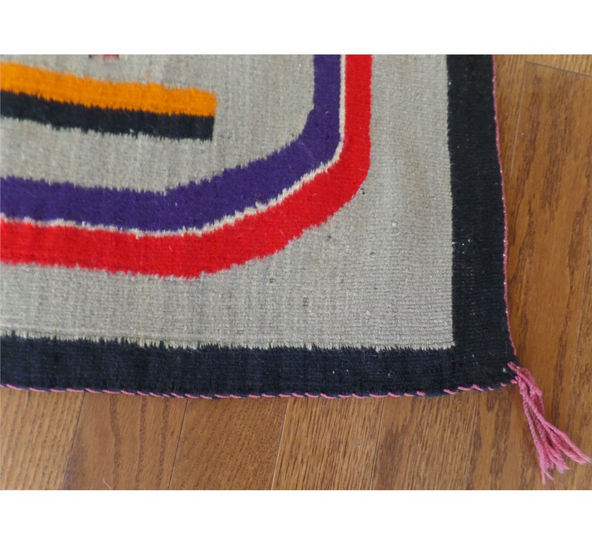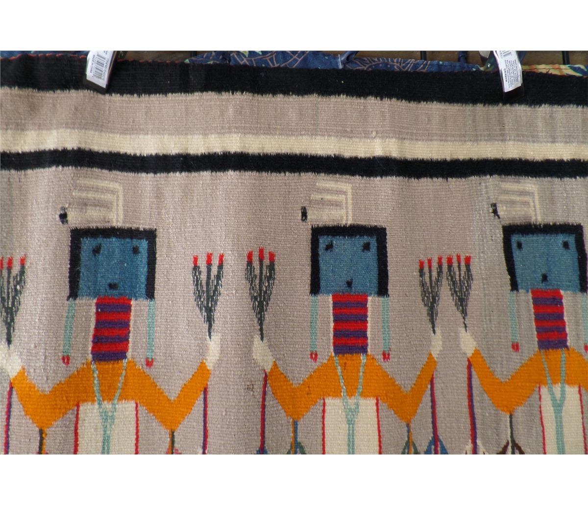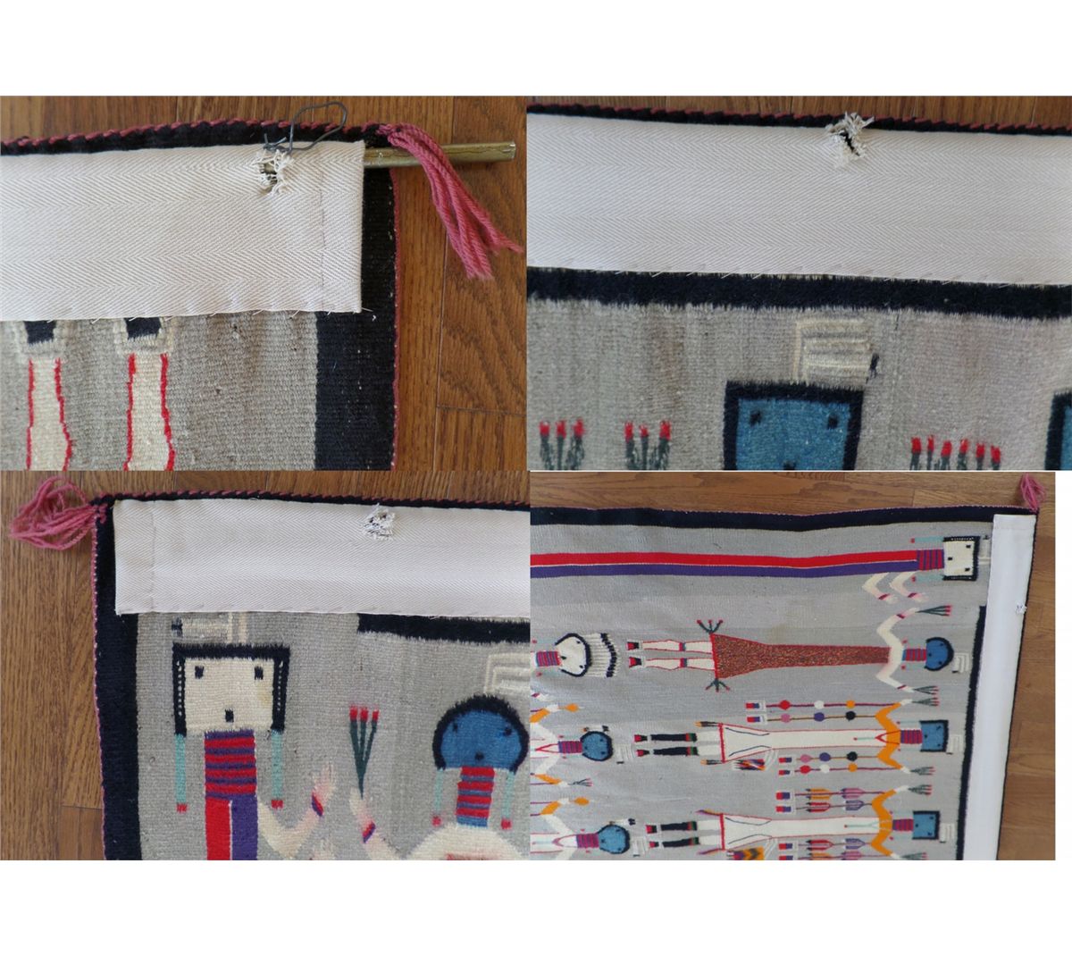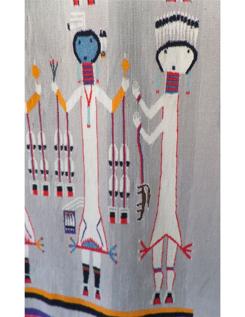 Large Navajo Yei Tapestry Weaving with 15 Figures. Circa 1940. Item measures 6' x 5' 8.5". Colors include white, blue, red, orange, black, green, turquoise, and gray. Condition: Couple small stains on reverse side and some bleeding. The reverse side shows the rod which was used to hang on a wall. The backing for the rod has 3 holes in it, but the rug is unaffected. Very Good. See All Images. Shipping: $40.