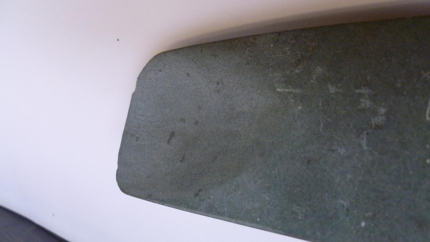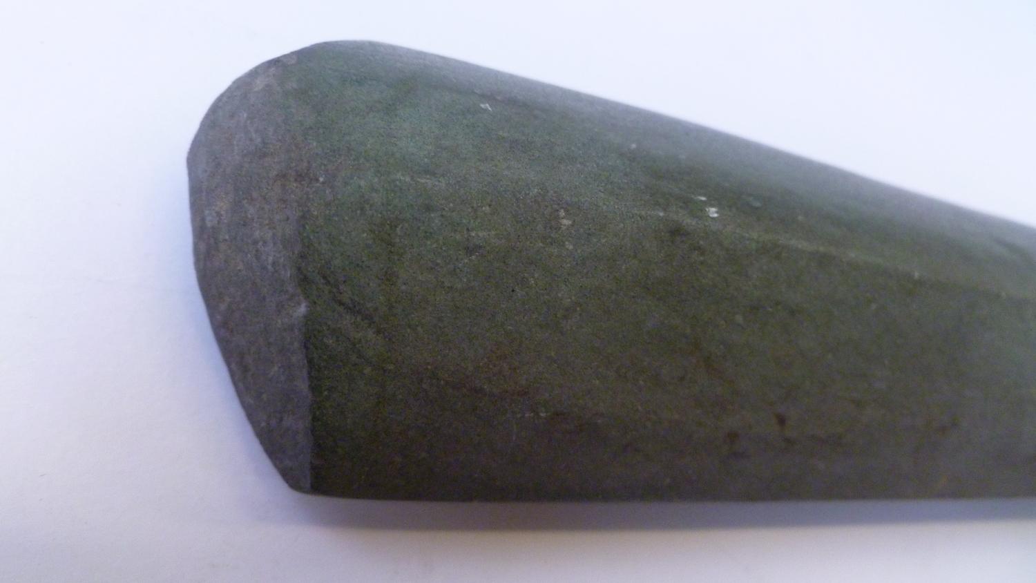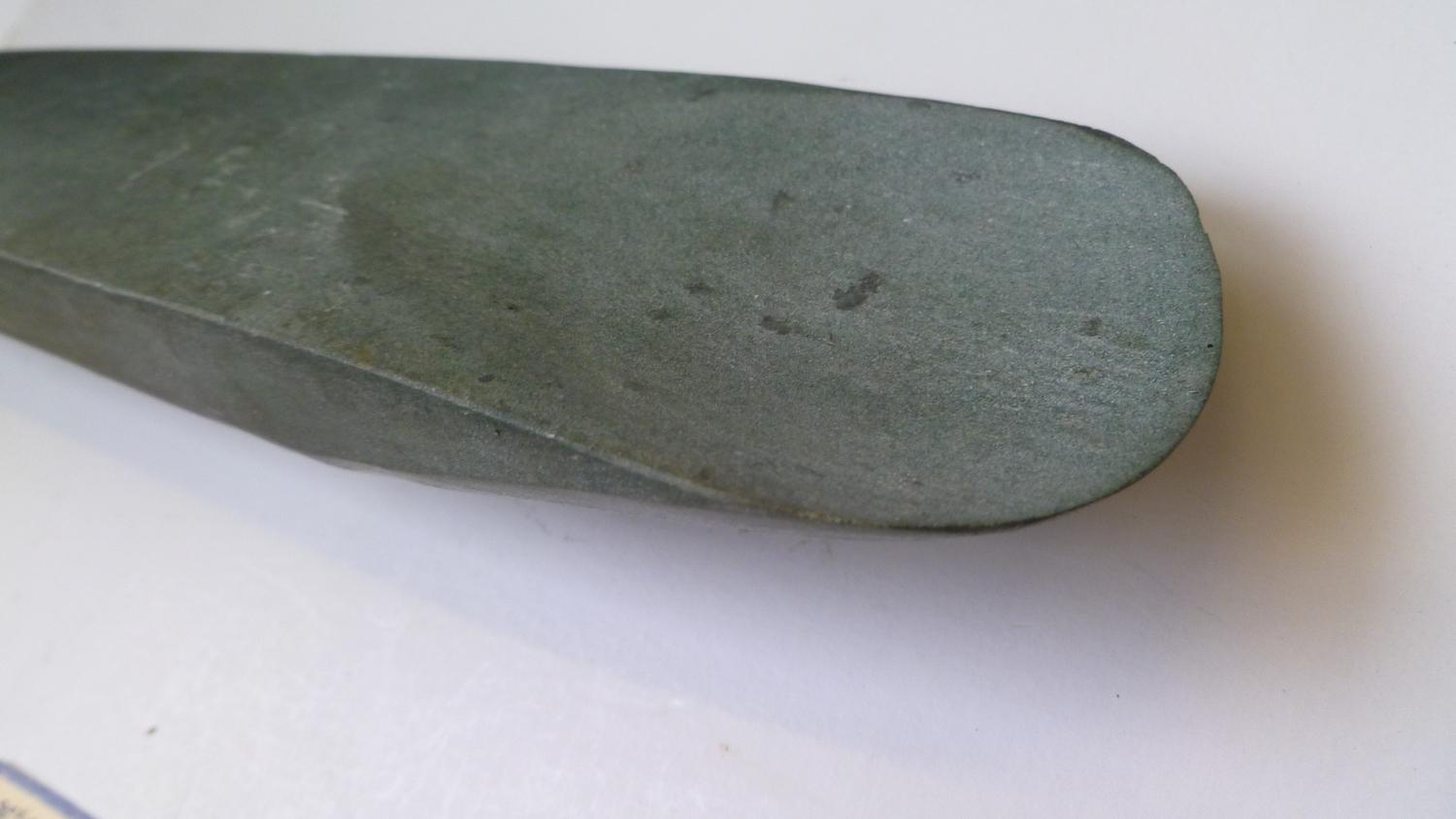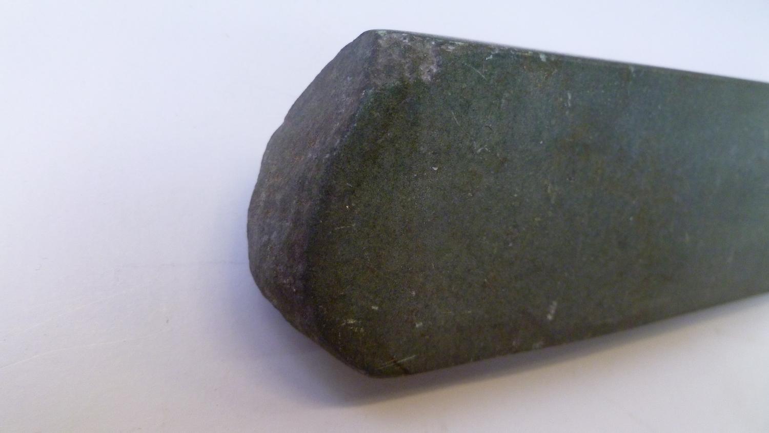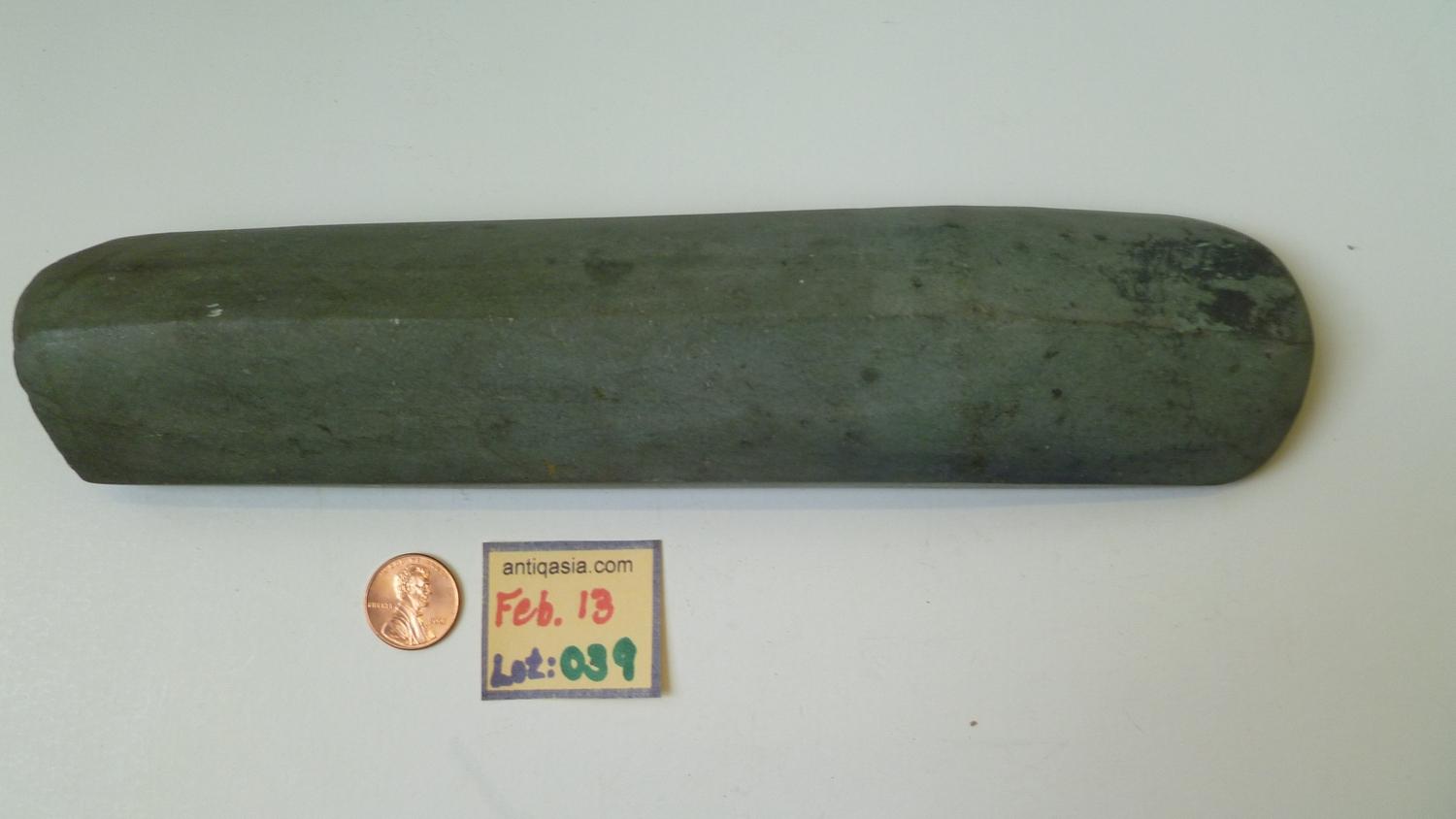 An important relic from the Late Stone Age in Java, this lovely Greenstone chisel measures almost 10" long and is essentially perfect (though cleaned a bit strongly for my taste). A burial smell can still be detected, and the butt end shows evidence of being used as a hammerstone - likely in the ritual breaking of nuts or seeds (betel-chewing a possibility, though many other plant products were utilized in ceremonies from ancient times onward). Traces of staining, this is Rare museum-quality for a 2nd-1st millenium BC artifact - which is absent from most collections of ancient worldwide stone arts.