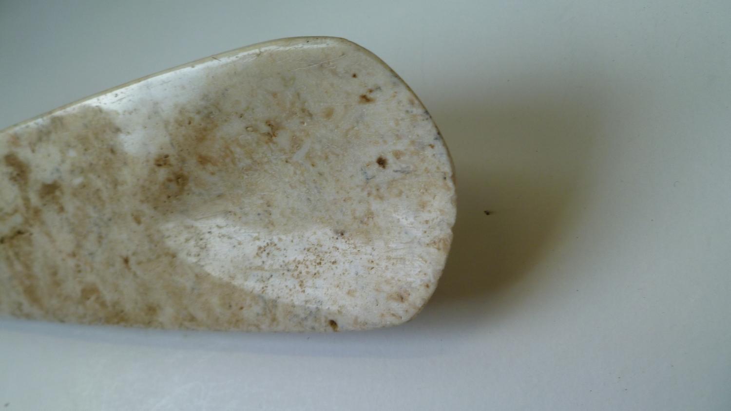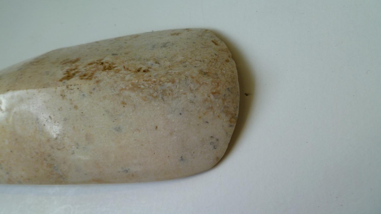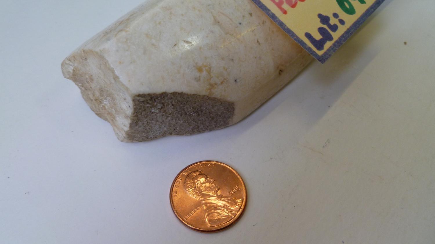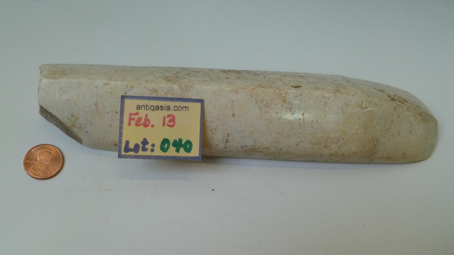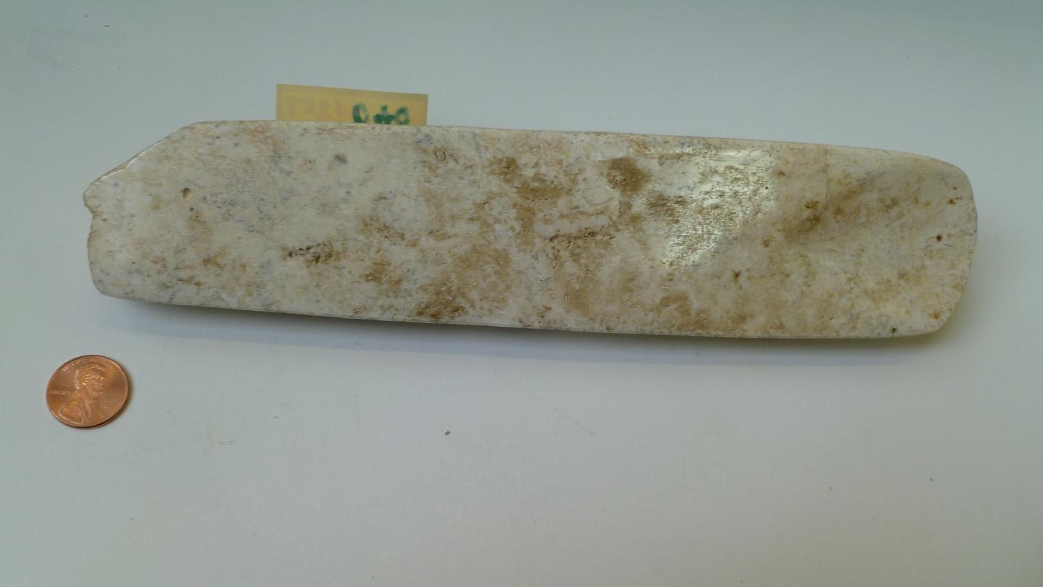 An incredible White Chert long-Chisel from the culture and period as Lot 39, it was broken at its butt-end (thus cementing our beliefs about its use). Well-patinated, the chisel-end is excellent and the fine high-polish of the entire artifact is VERY eye-catching. 9-1/2" long as it stands, its appearance could not be nicer. It will make an indelible impression on all who see it in your collection.